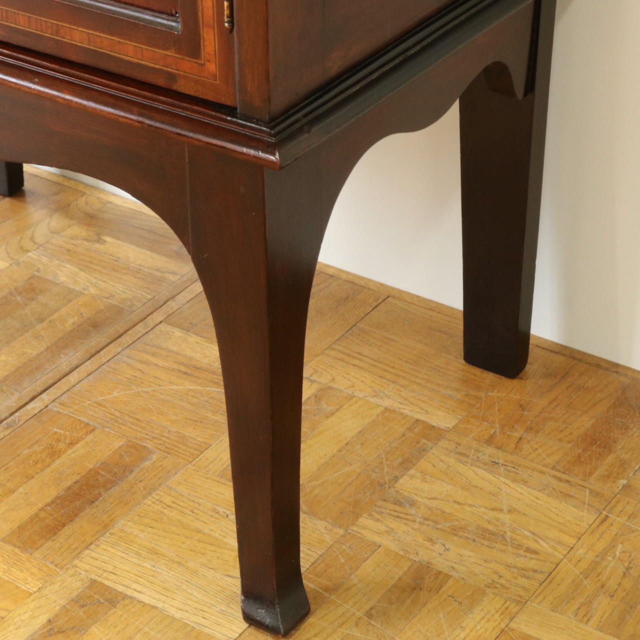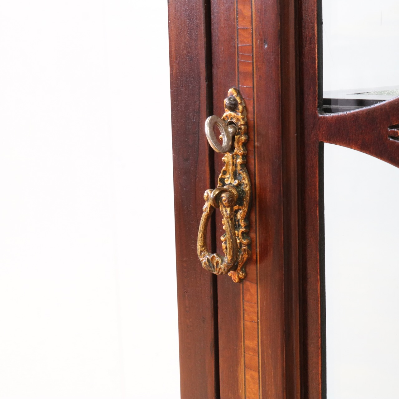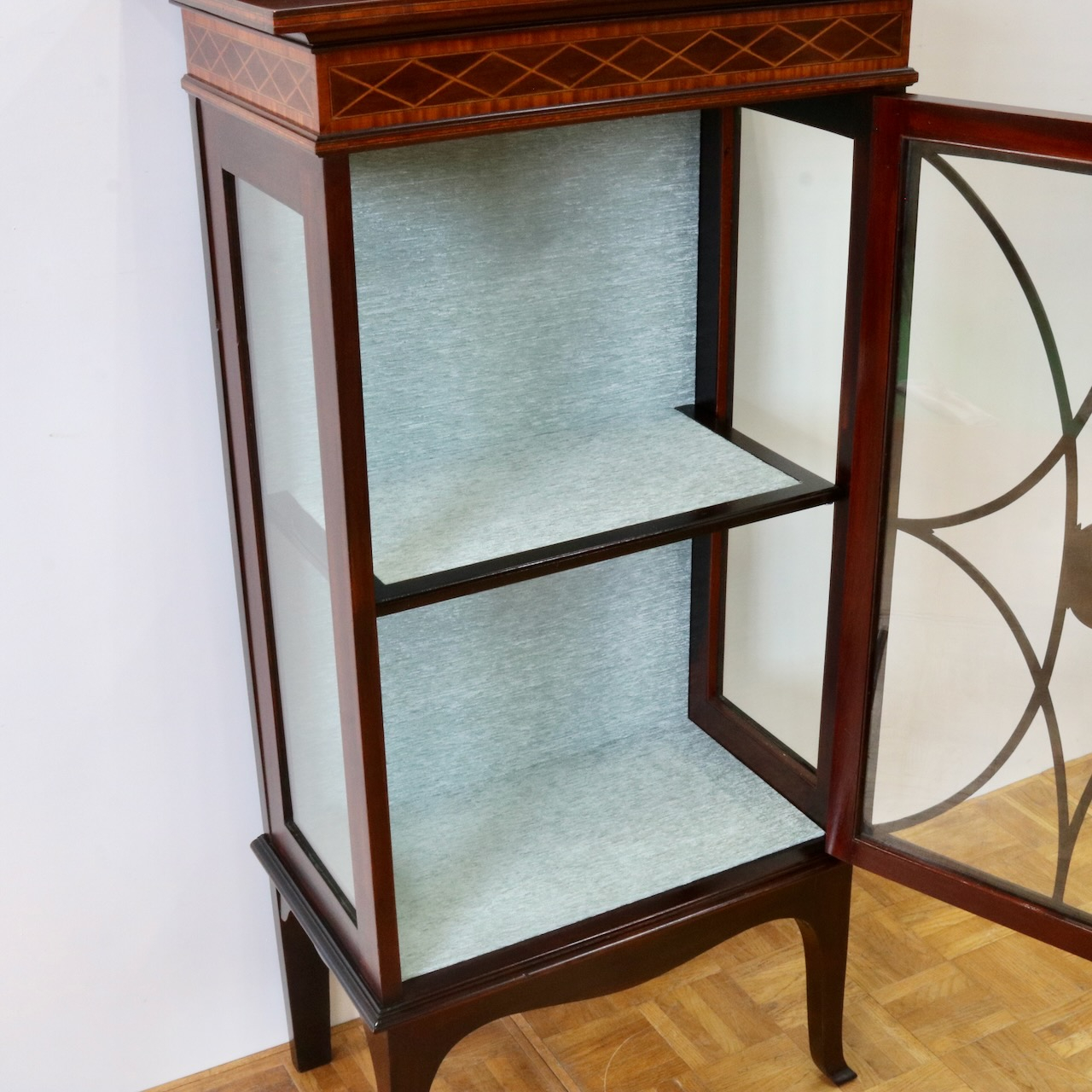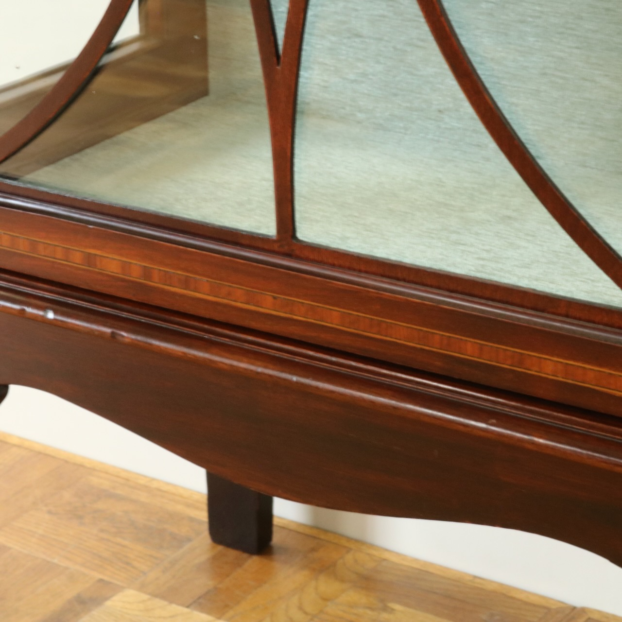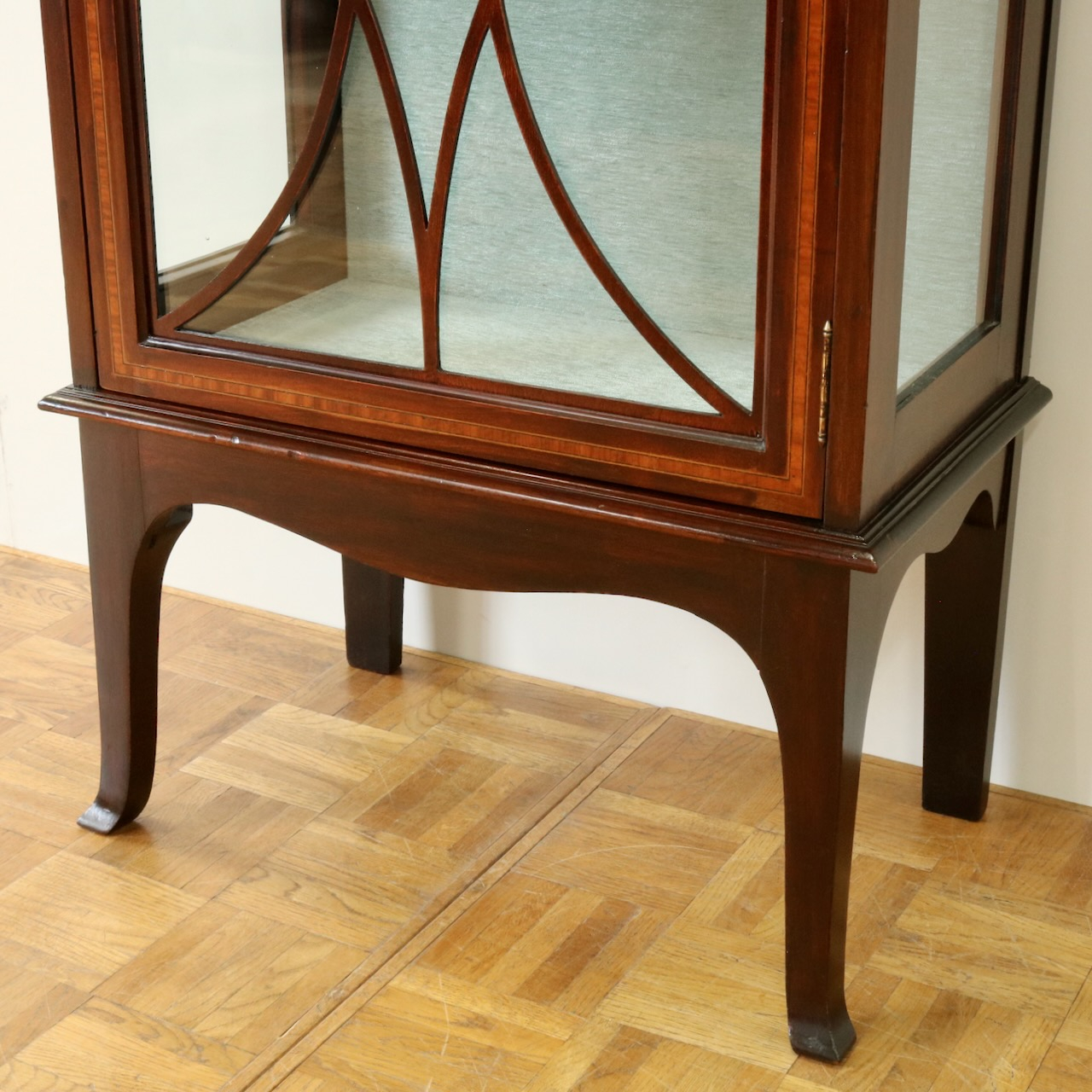 配送料の目安 ▶︎1920年代、マホガニー材のグラスキャビネット。繊細で直線的なフォルムに、ハスク飾りのついたトップがクラシカルなアクセントになっています。ガラス扉の中央にはグリーン地のジャスパーのメダルがはめ込まれています。