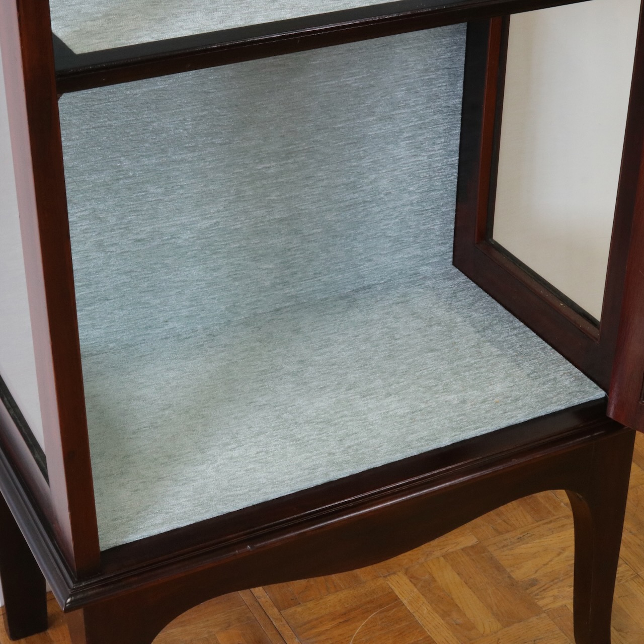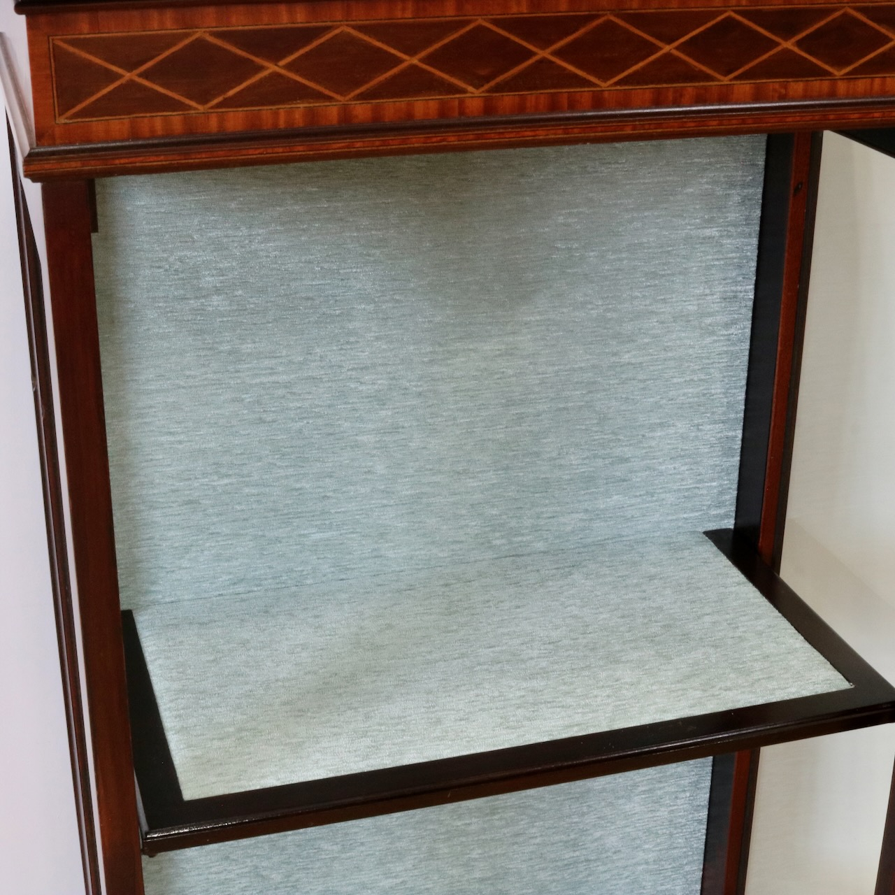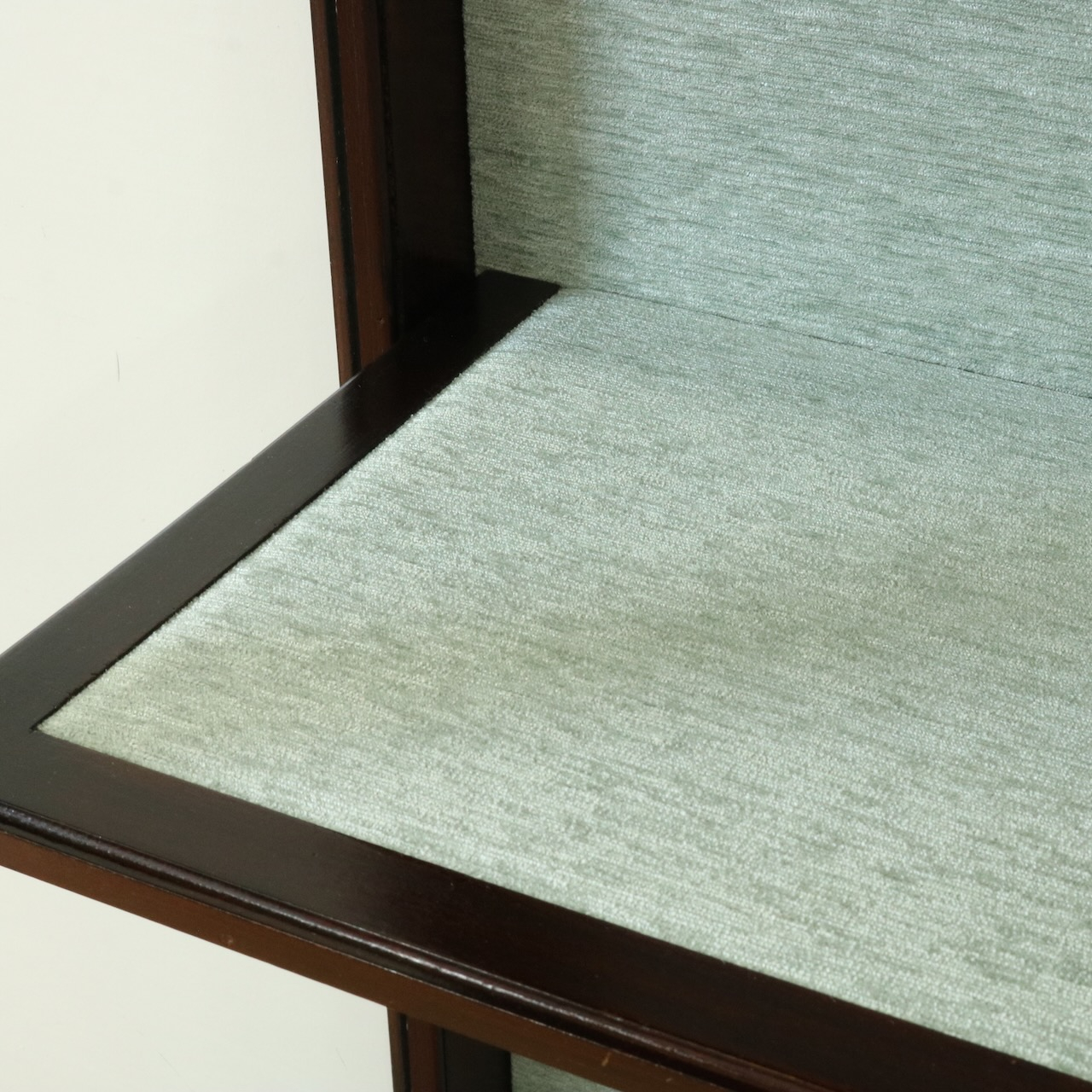 キャビネット内はうっすら緑がかった灰色の生地で張り替えました。