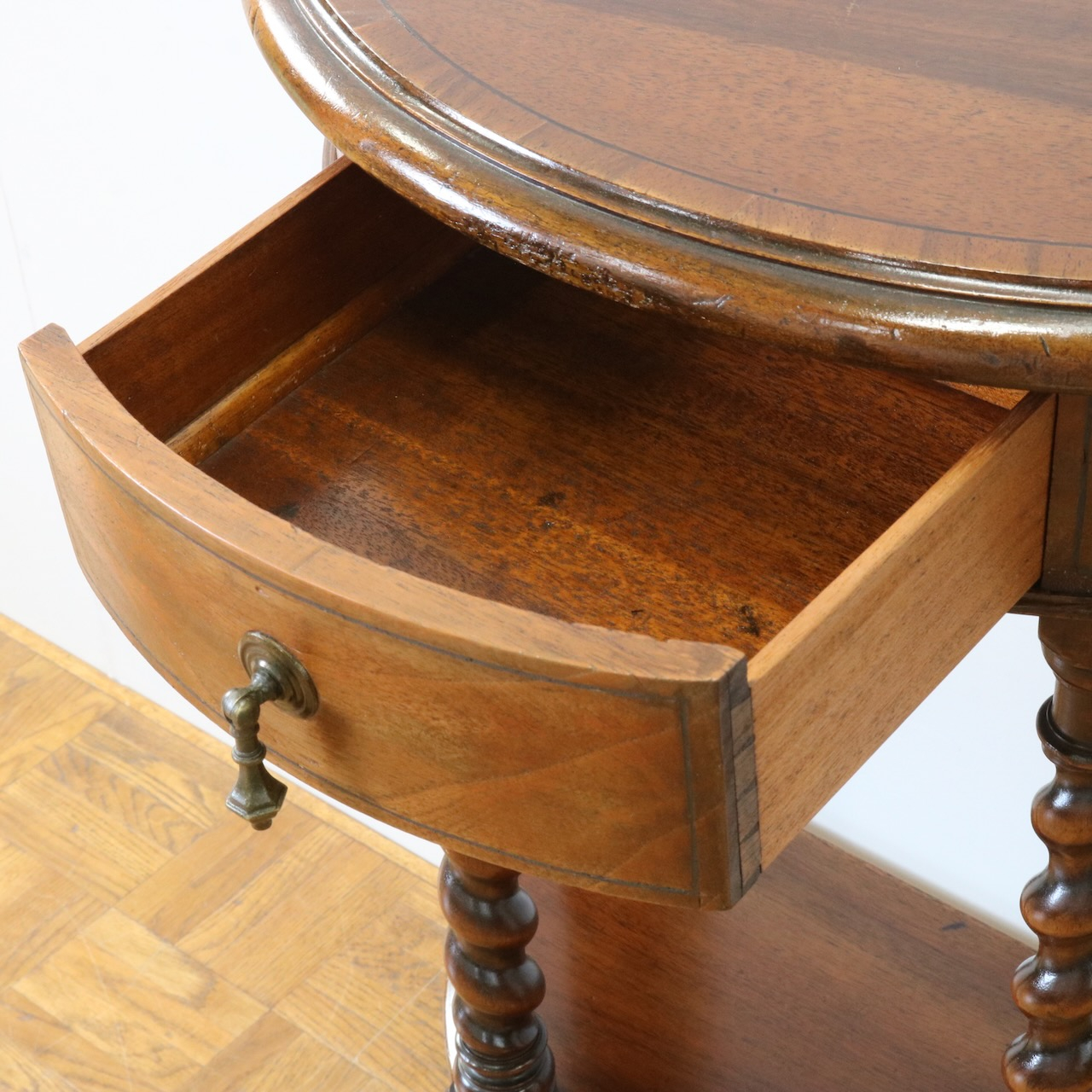 杢目模様をいかした天板、ツヤのあるツイストレッグ、安定感のある丸い脚元など、丁寧でセンスのよい仕事が光る美しいテーブルです。