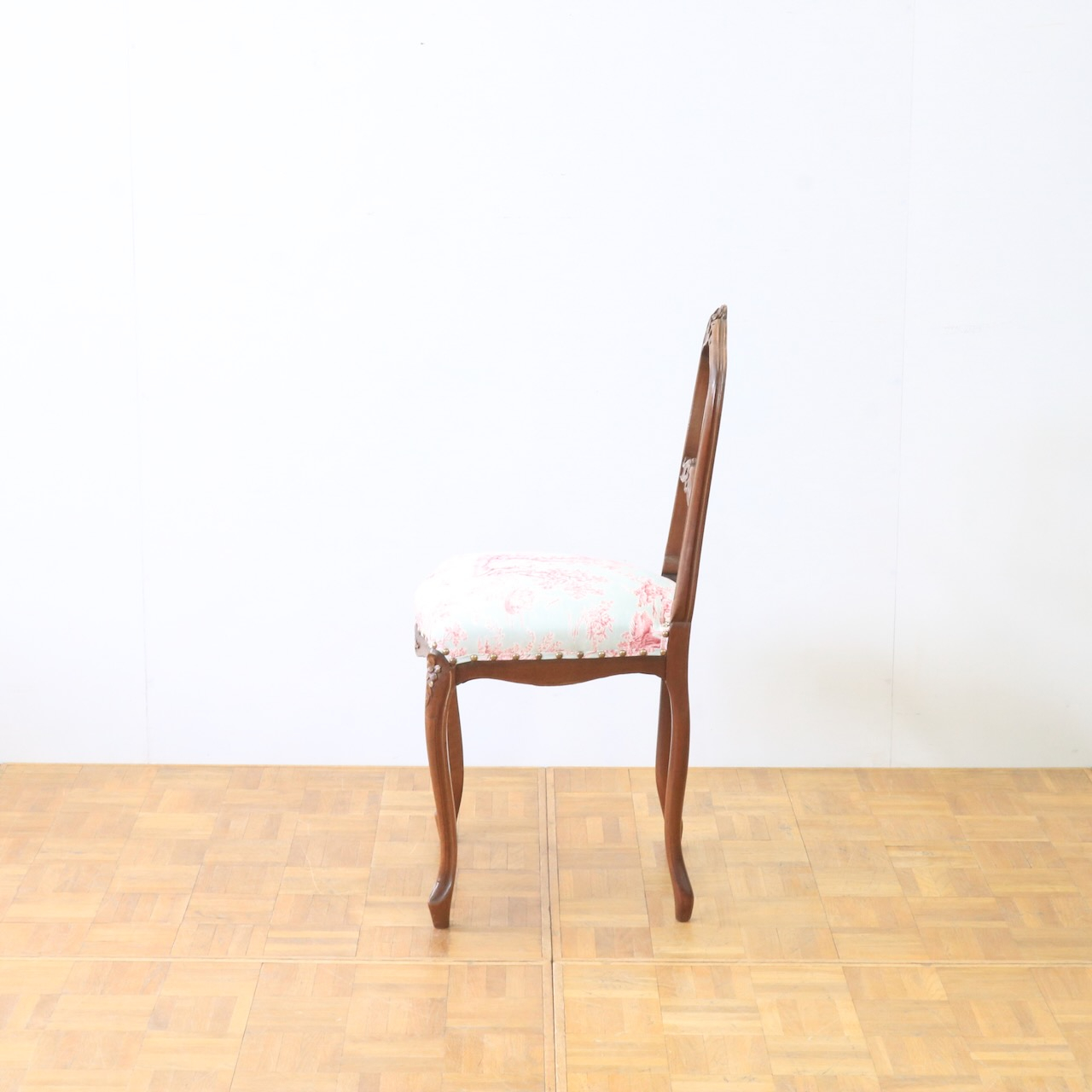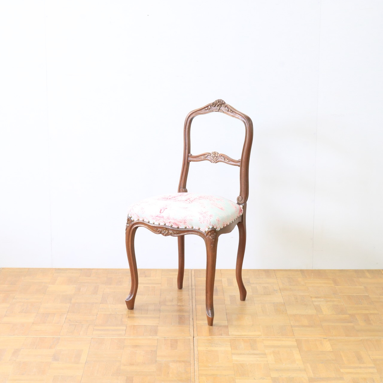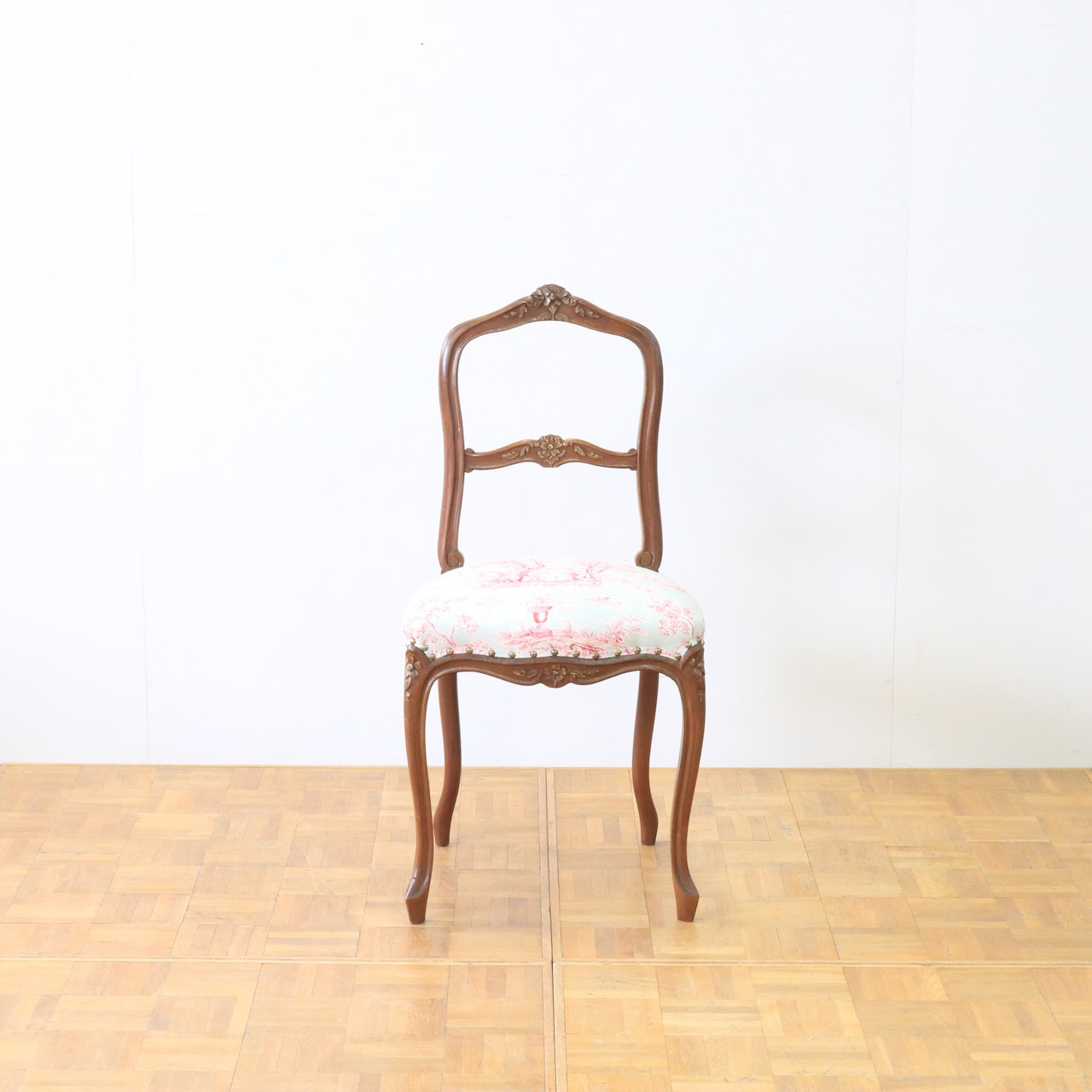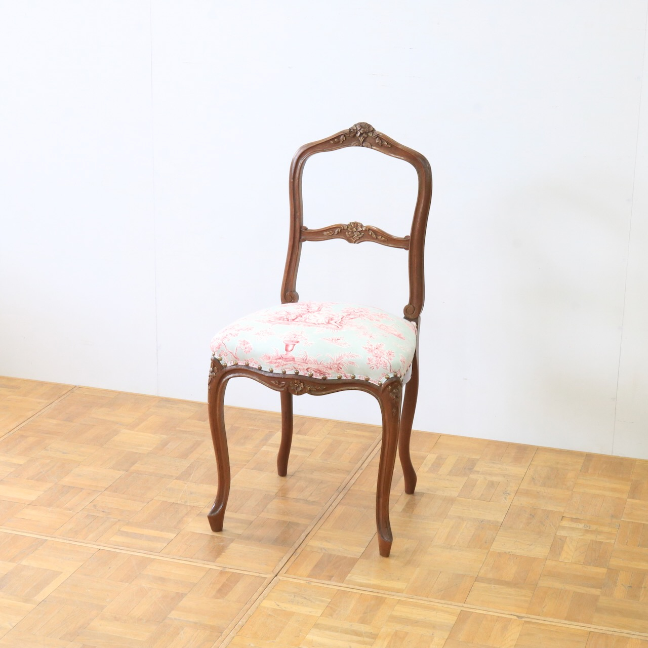 1930年代、オーク材のフレンチチェアー。エレガントなフラワーモチーフがアクセント。座面はトワルドジュイの生地で張り替え、可憐な雰囲気に仕上げました。