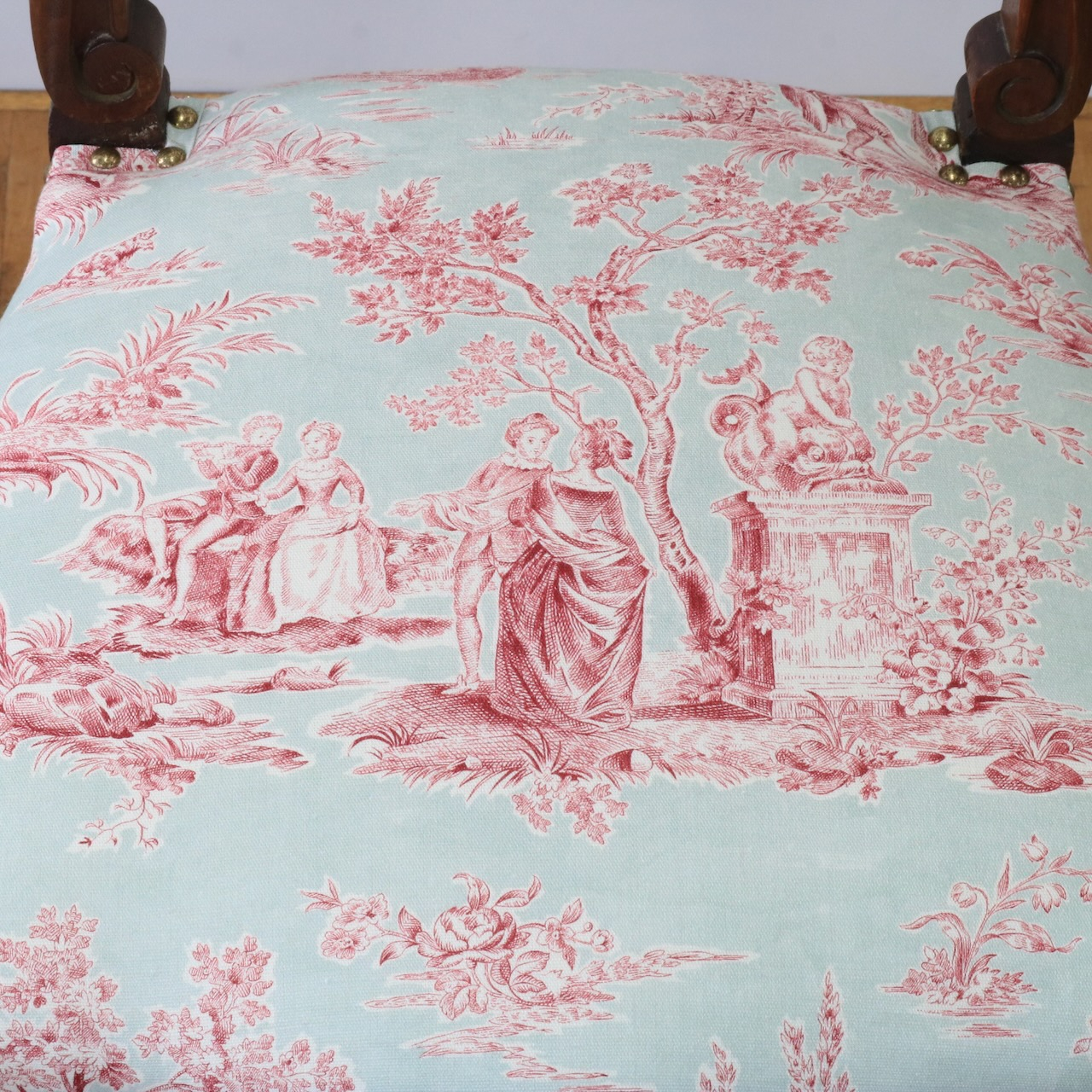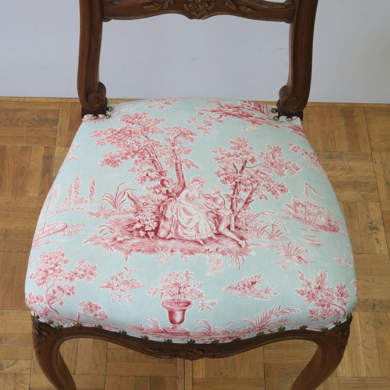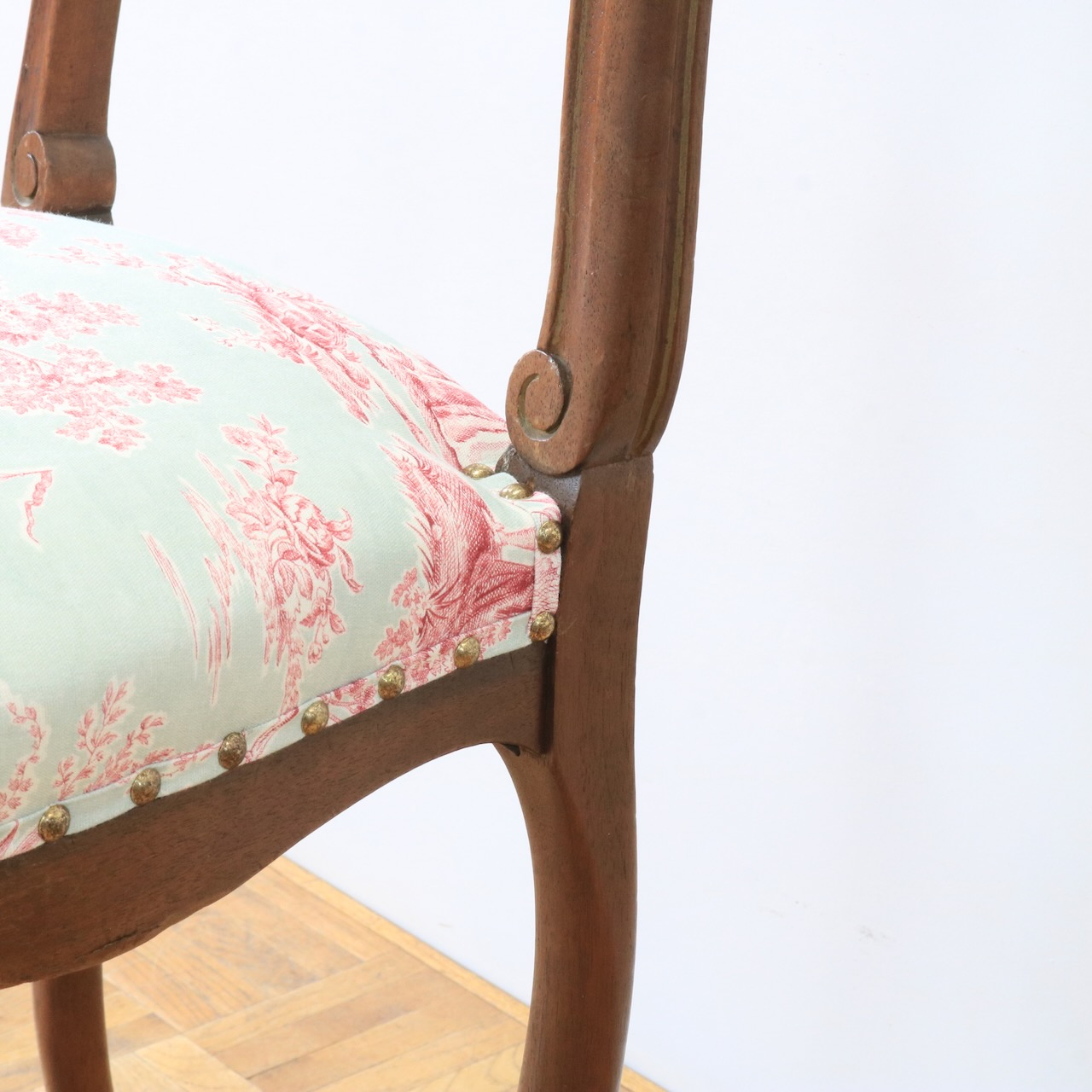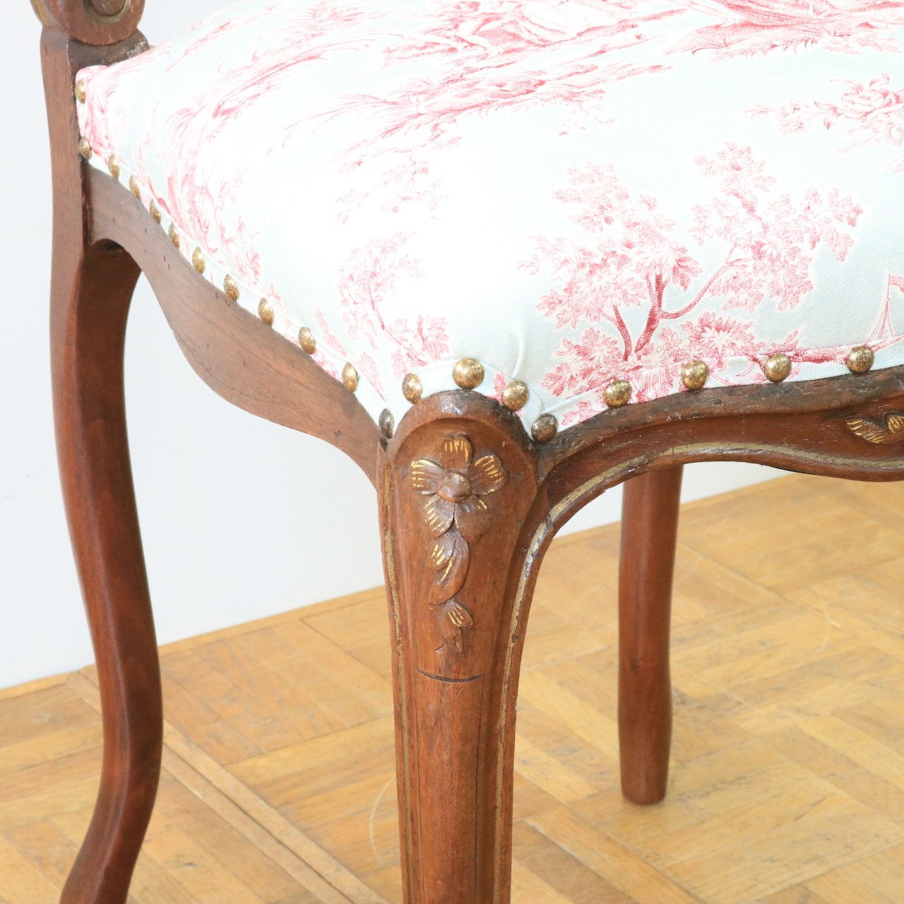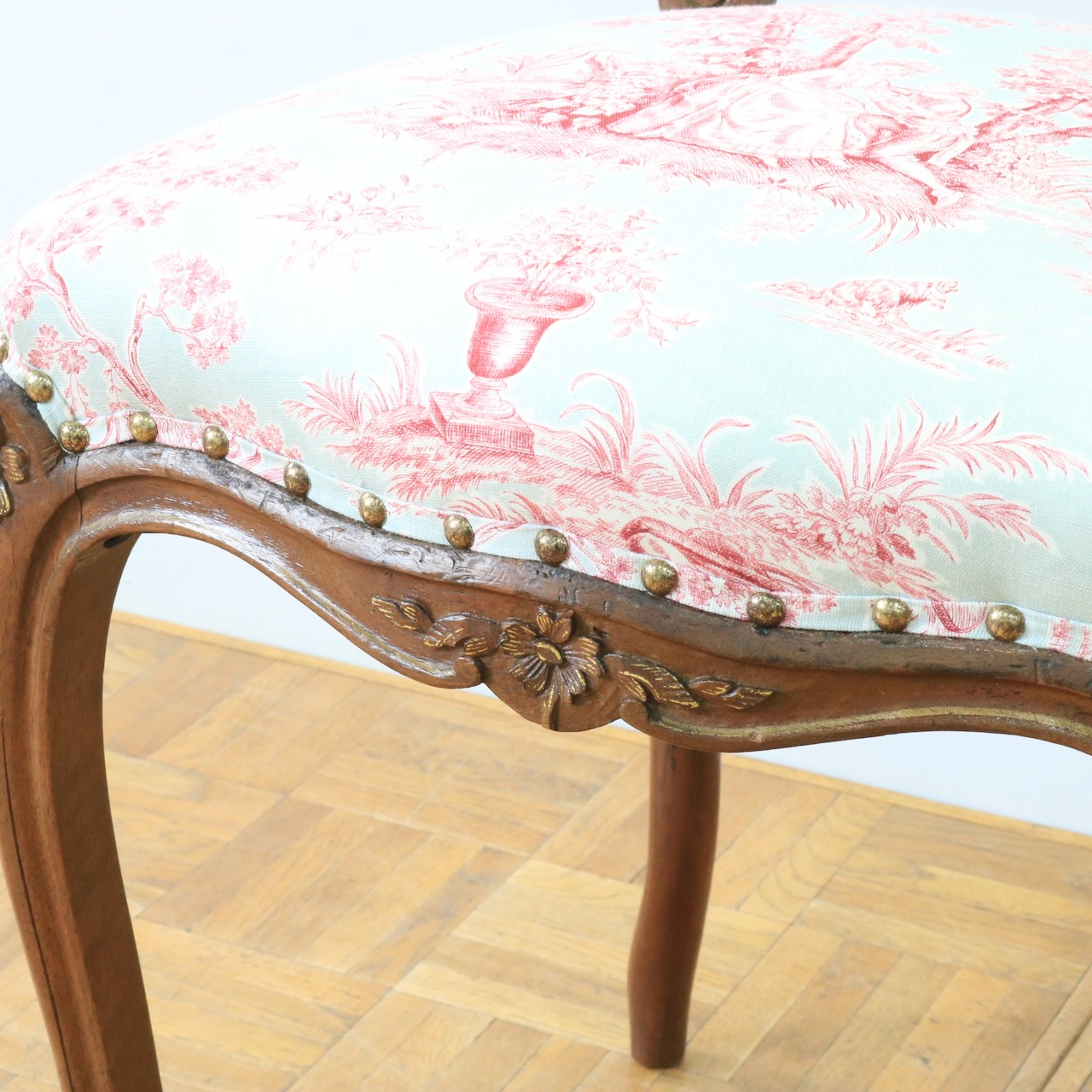 1930年代、オーク材のフレンチチェアー。エレガントなフラワーモチーフがアクセント。座面はトワルドジュイの生地で張り替え、可憐な雰囲気に仕上げました。