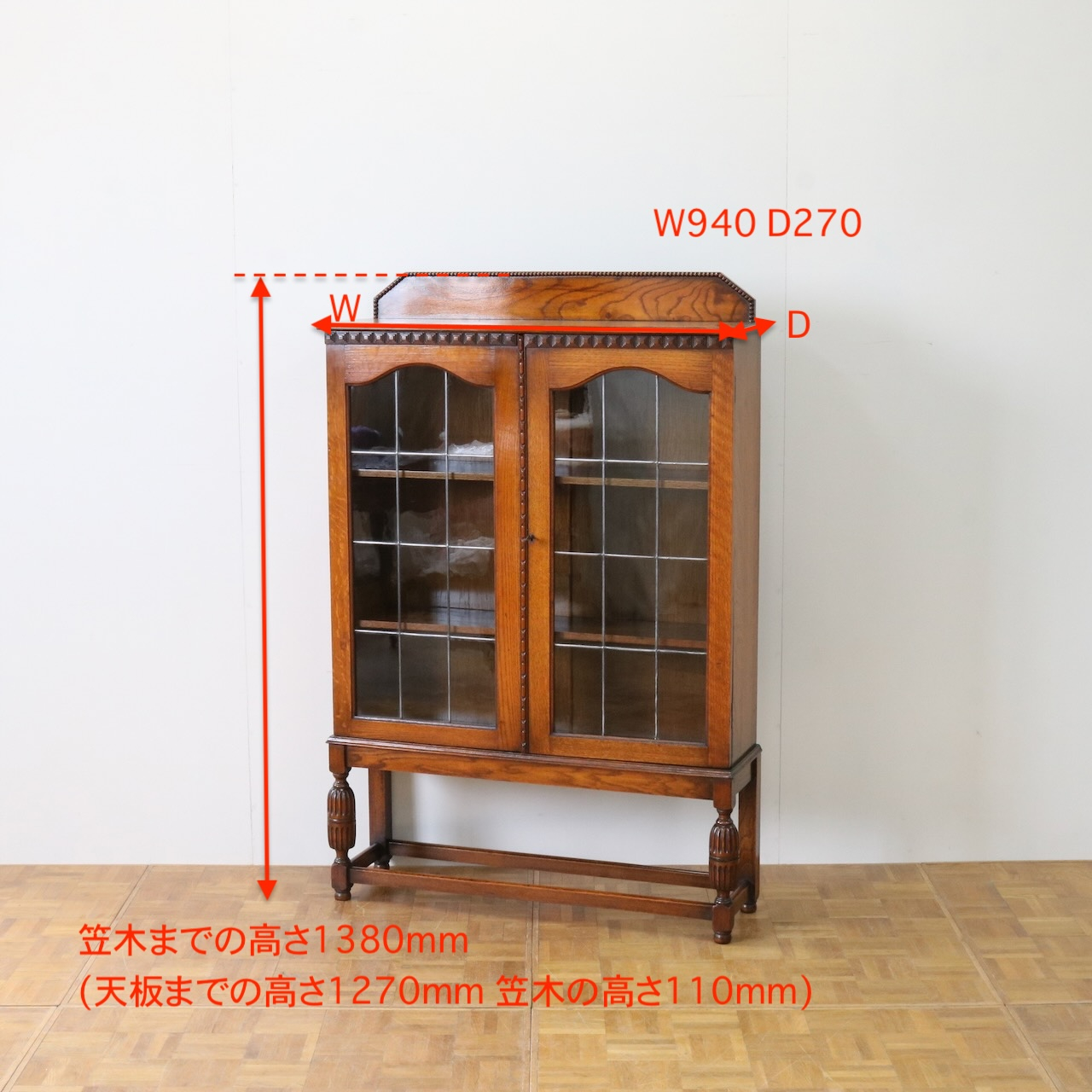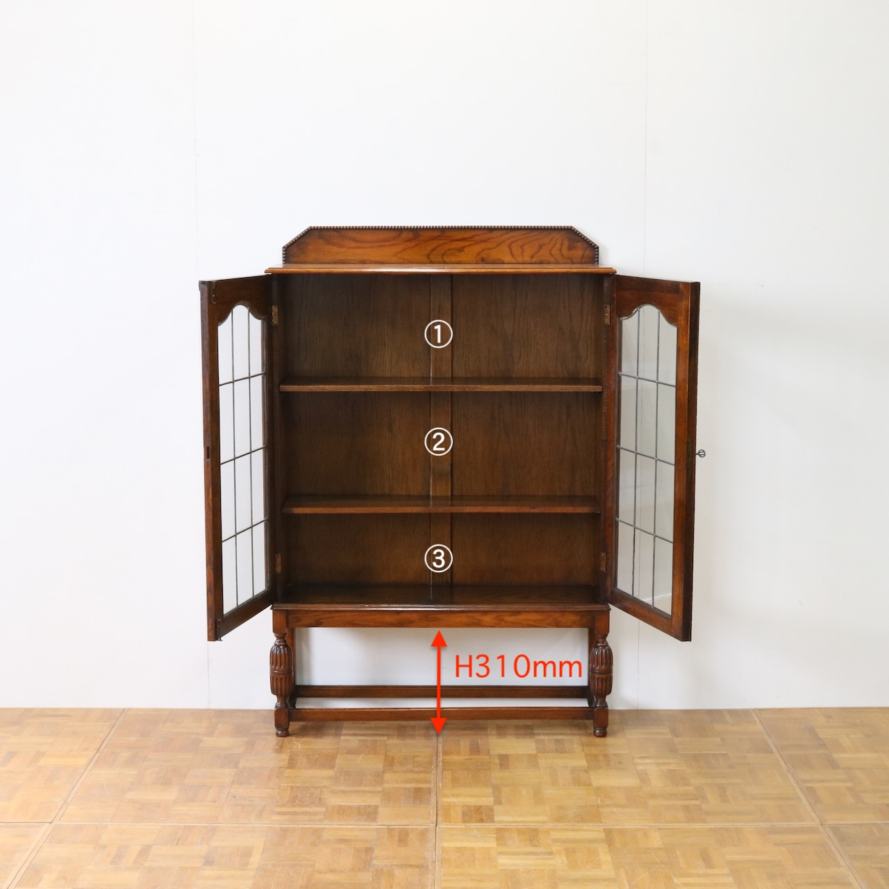 ポイントで施されたレリーフや、リーデッドガラス扉がアンティークらしい趣ある佇まい。