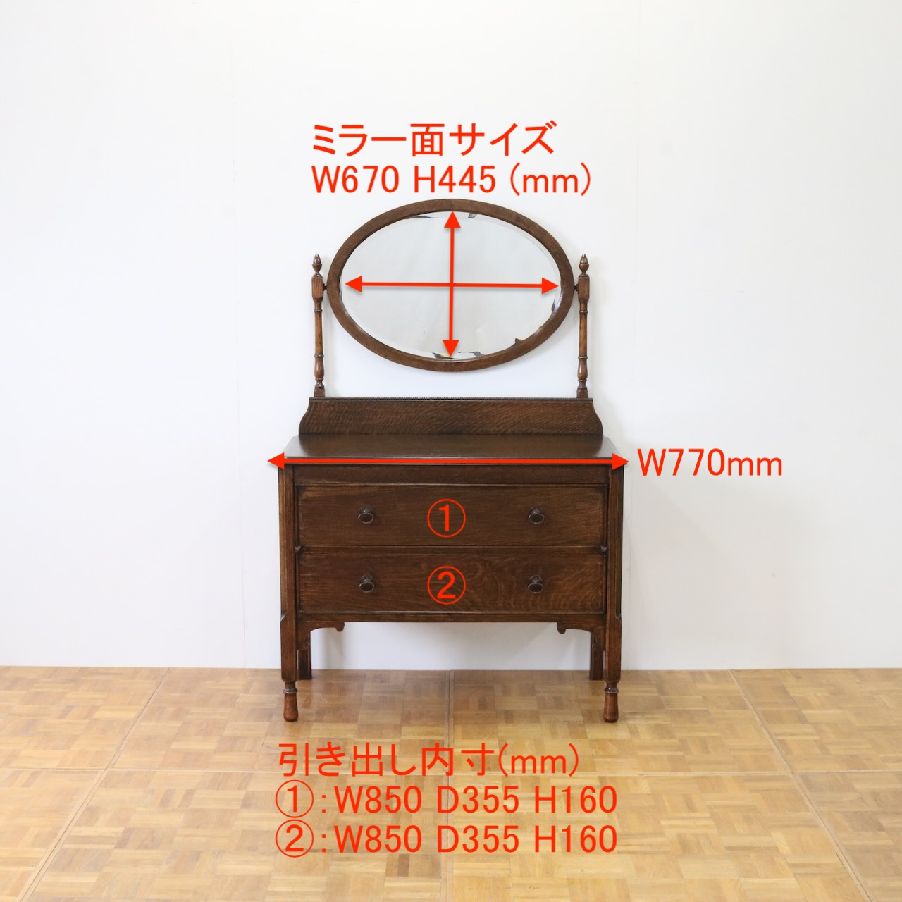 引き出しが2杯備えられ、化粧台と収納、どちらも兼ね備えています。