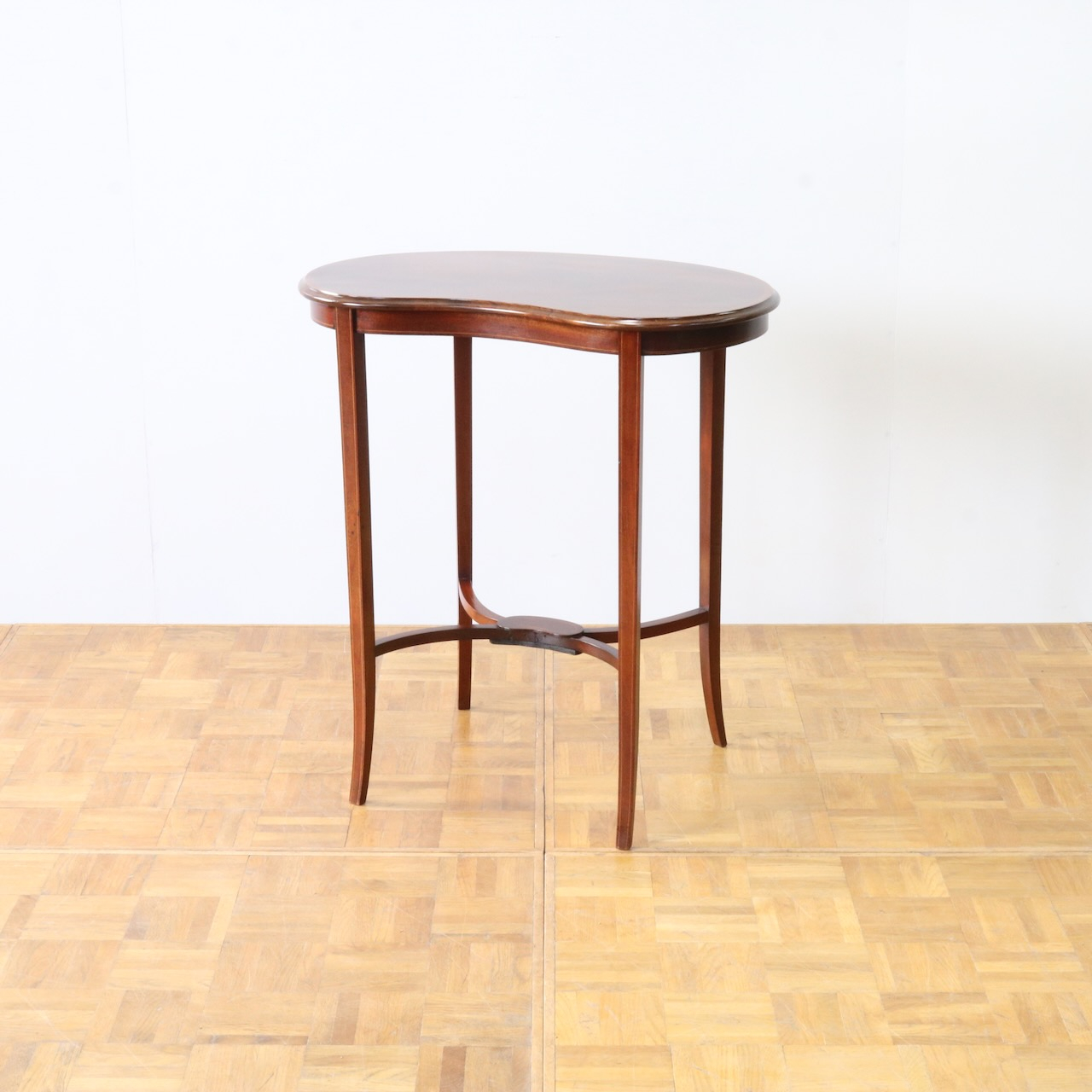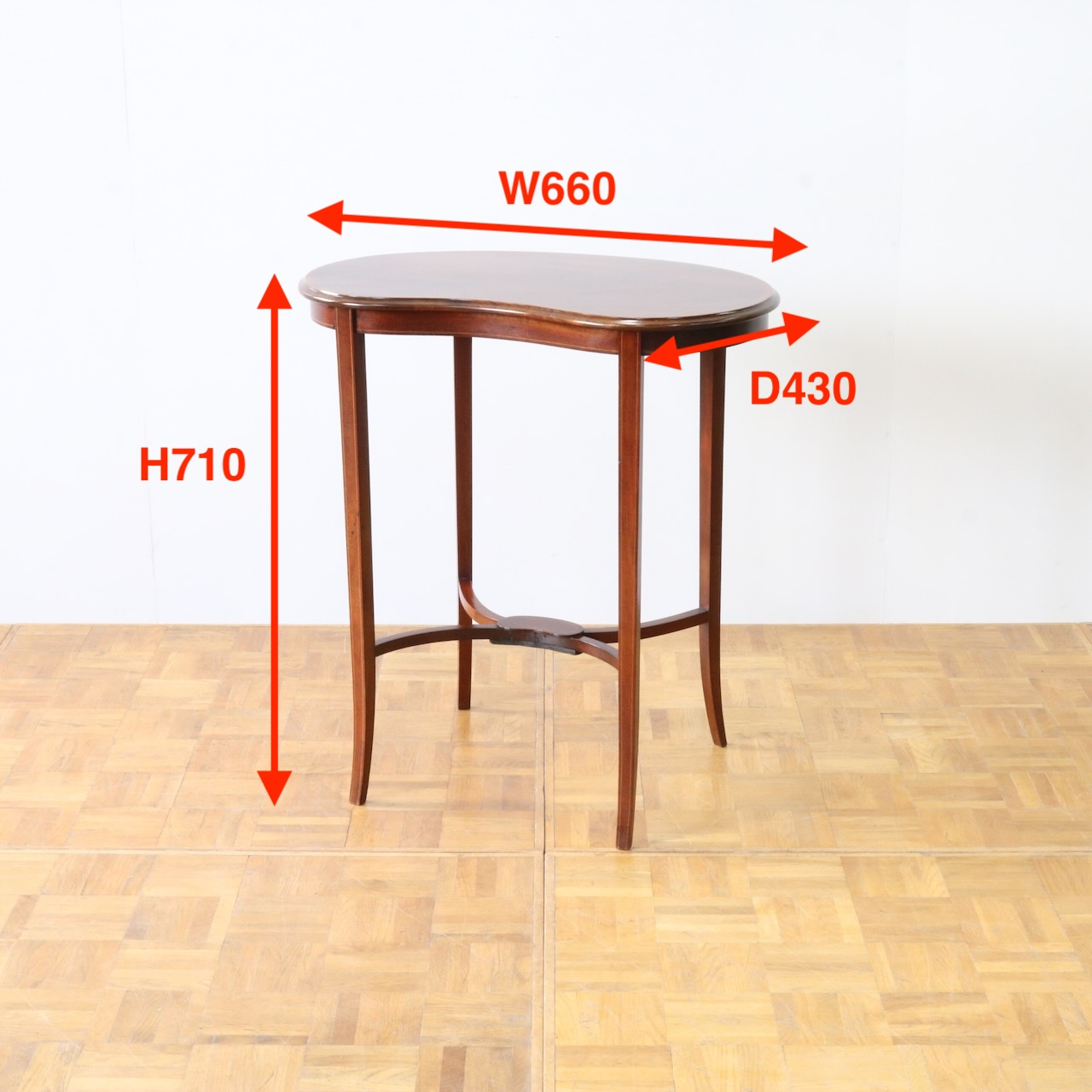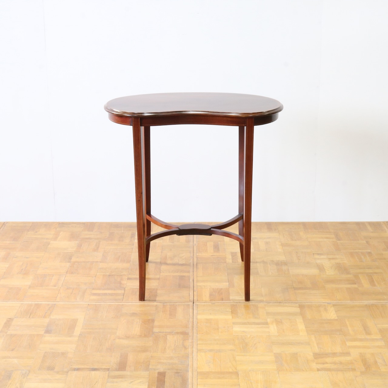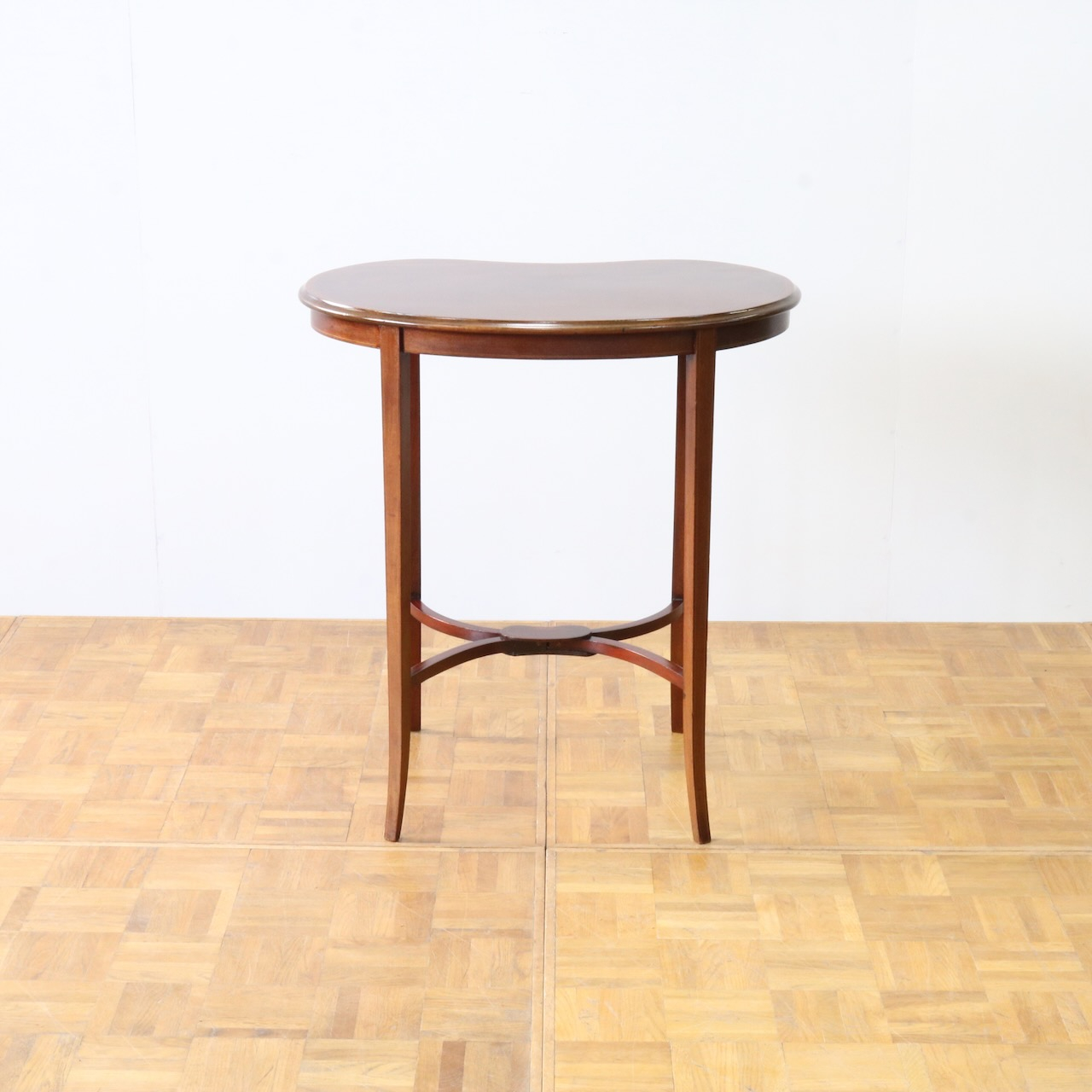 配送料の目安 ▶︎1910年代、マホガニー材のオケージョナルテーブル。柔らかな印象のキドニー型で、よく見ると脚元のストレッチャーを繋いでいる小さな板もキドニー型。可愛らしいこだわりの感じられる、美しいシルエットのテーブルです。