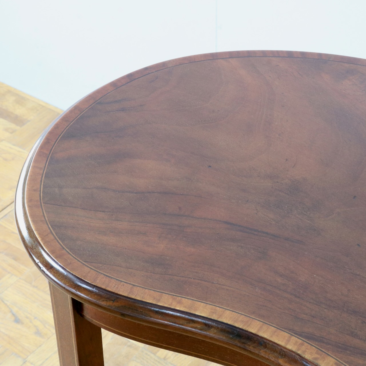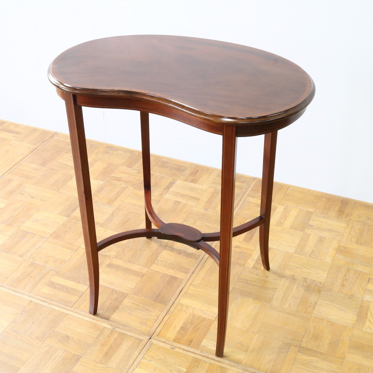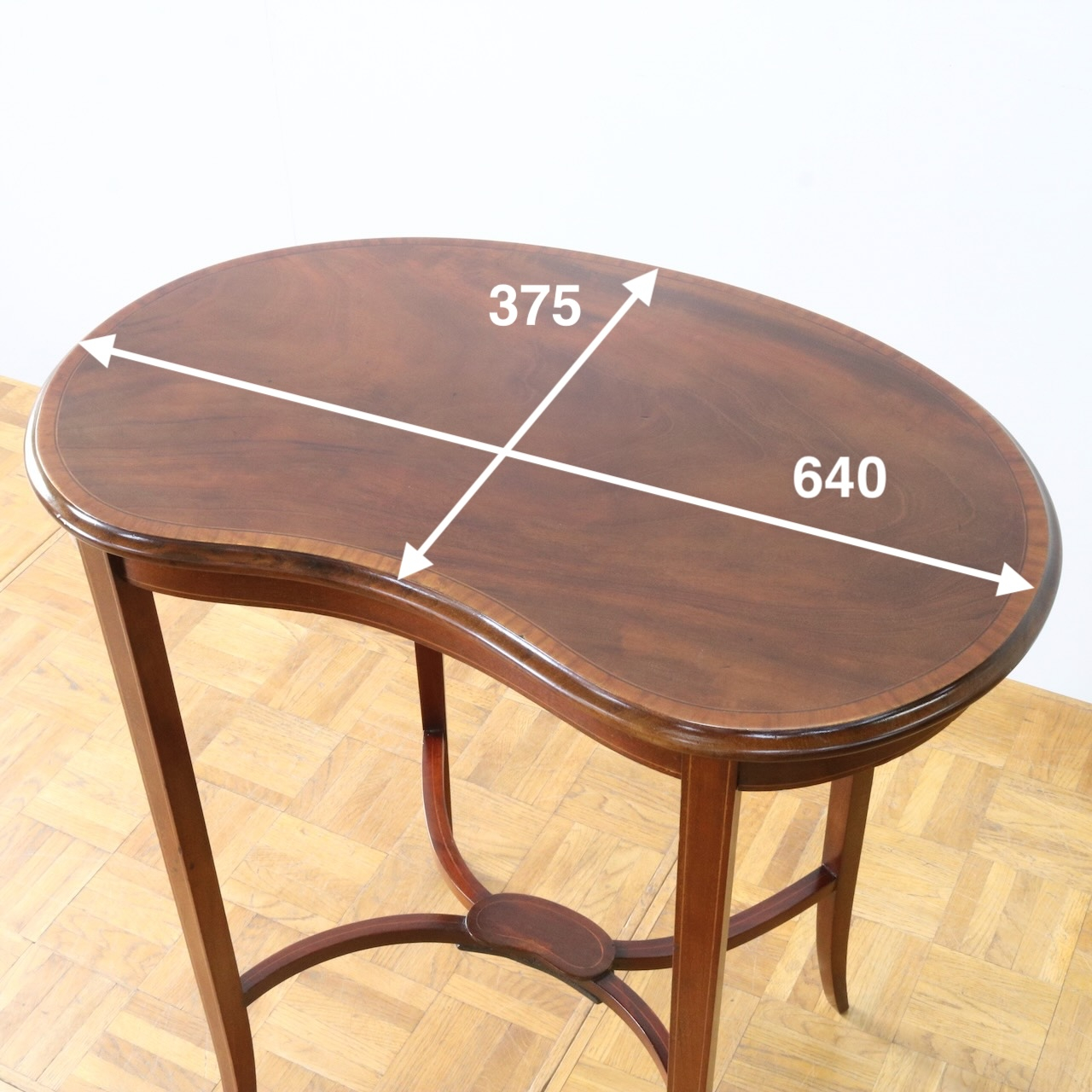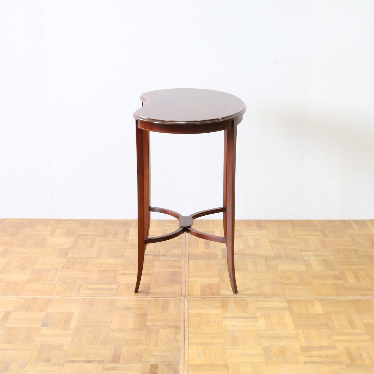 配送料の目安 ▶︎1910年代、マホガニー材のオケージョナルテーブル。柔らかな印象のキドニー型で、よく見ると脚元のストレッチャーを繋いでいる小さな板もキドニー型。可愛らしいこだわりの感じられる、美しいシルエットのテーブルです。