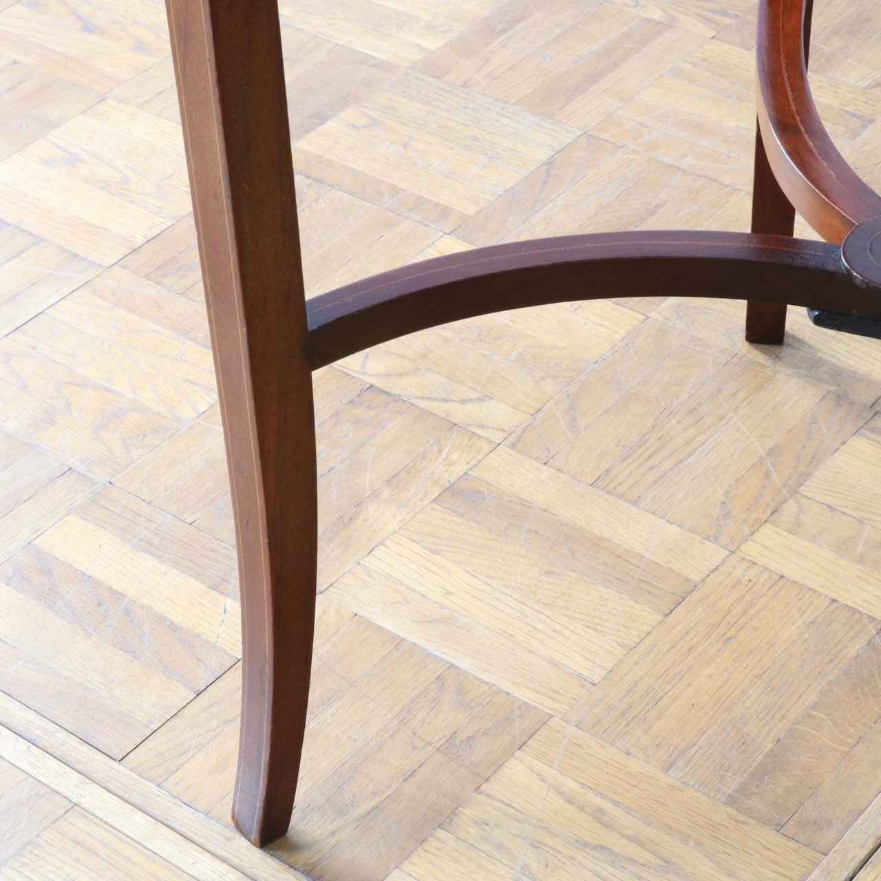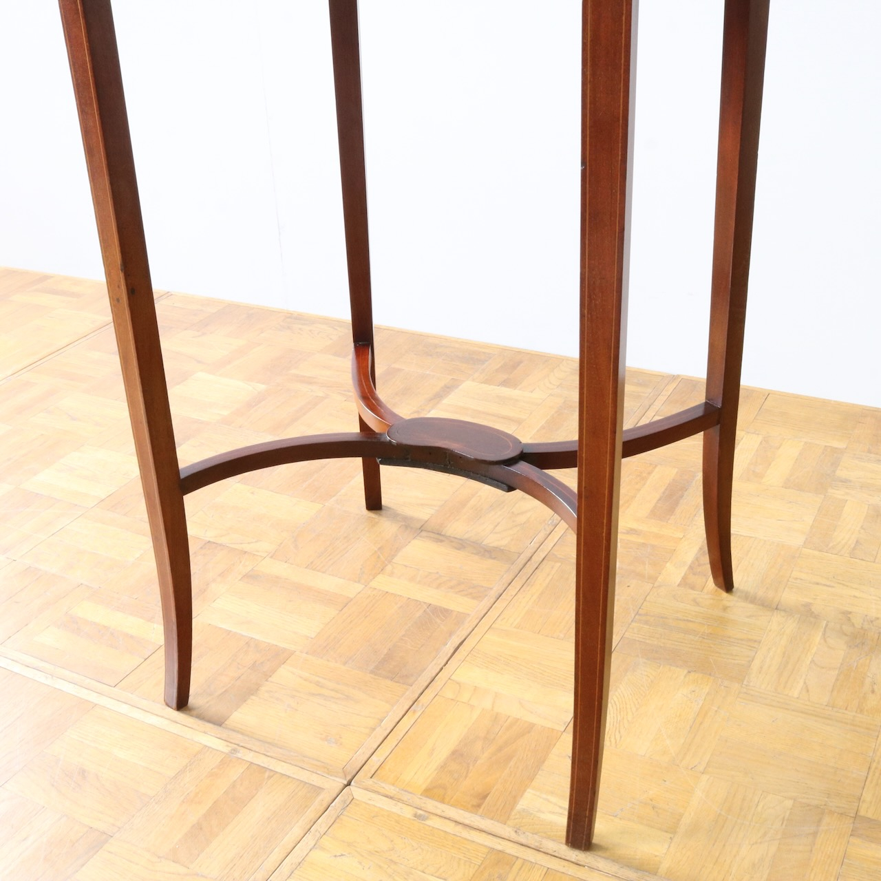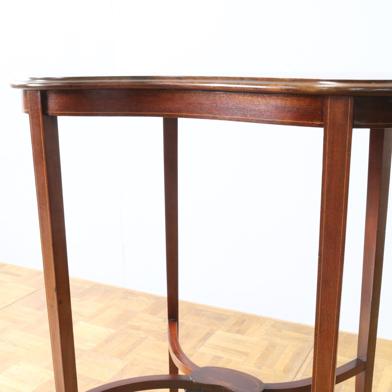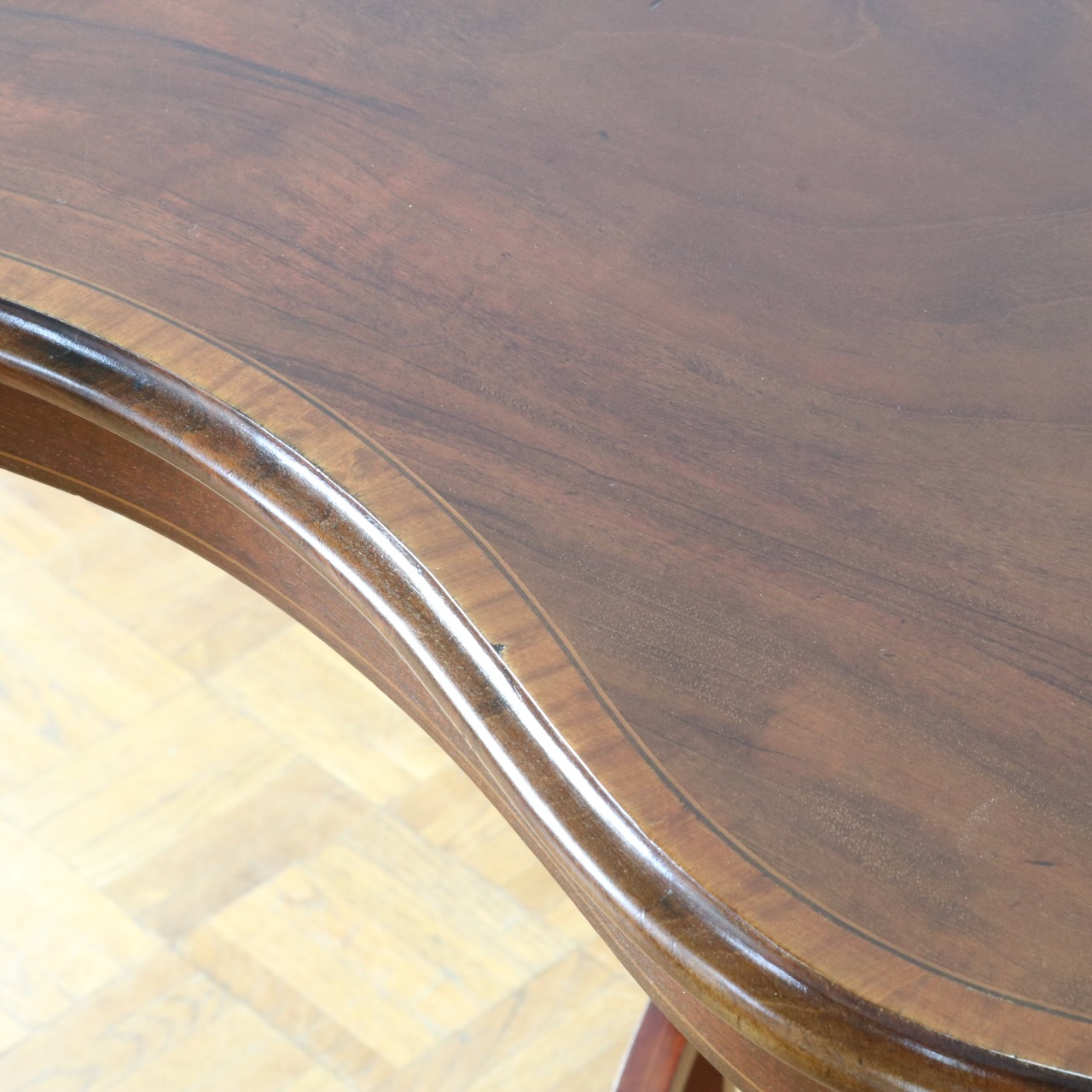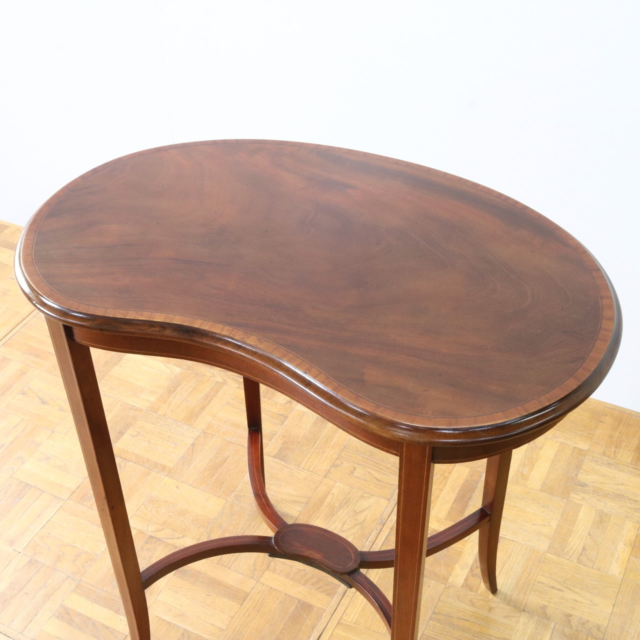 配送料の目安 ▶︎1910年代、マホガニー材のオケージョナルテーブル。柔らかな印象のキドニー型で、よく見ると脚元のストレッチャーを繋いでいる小さな板もキドニー型。可愛らしいこだわりの感じられる、美しいシルエットのテーブルです。