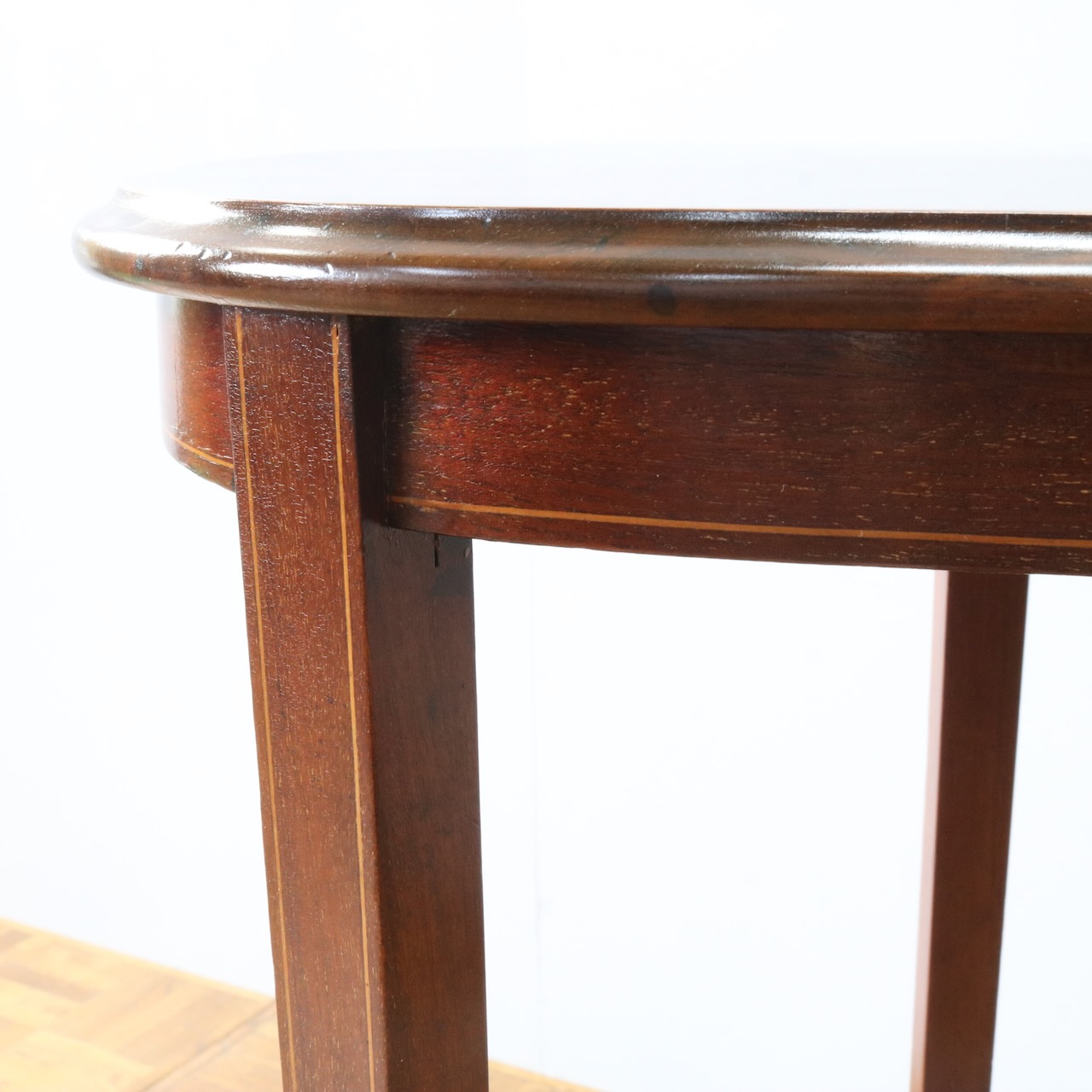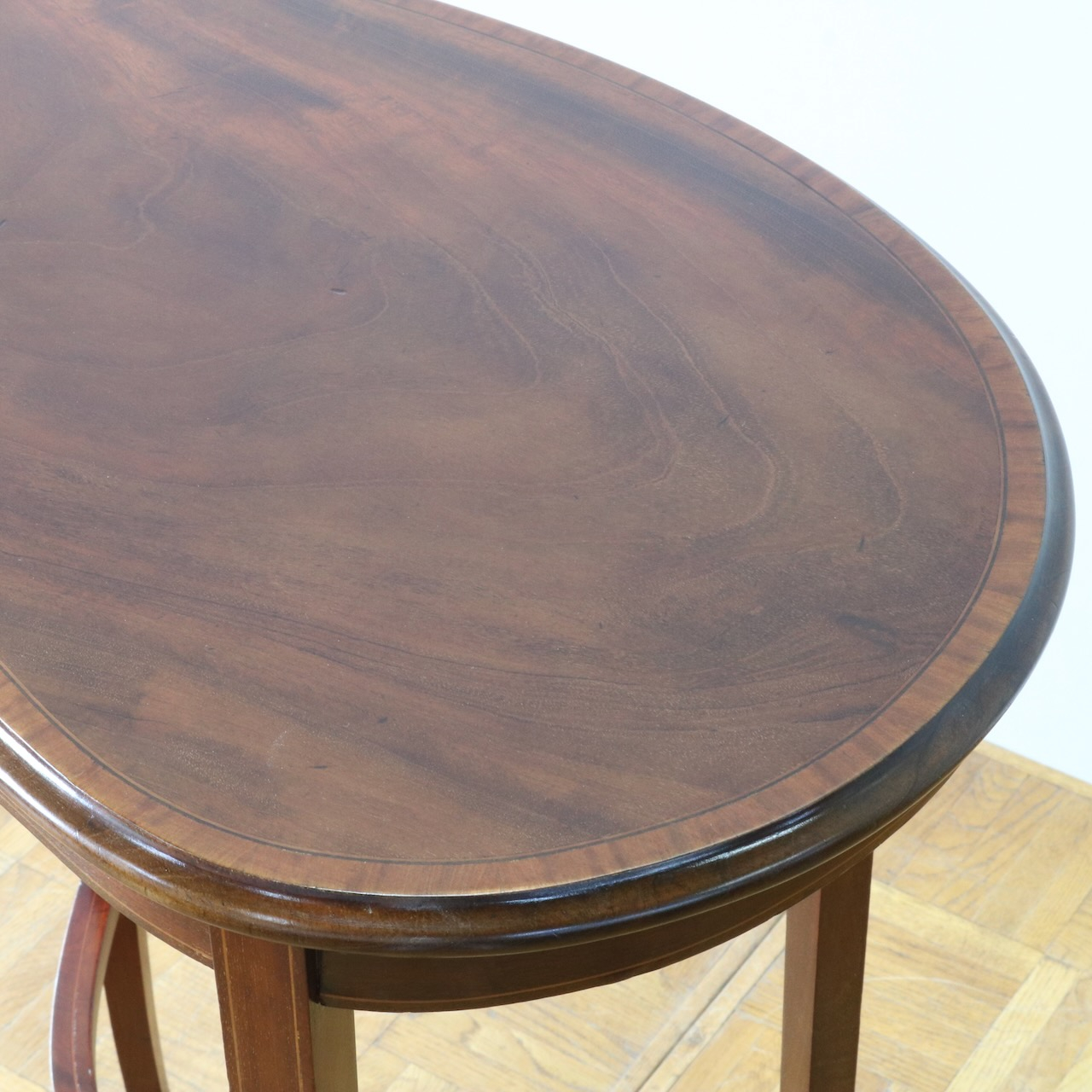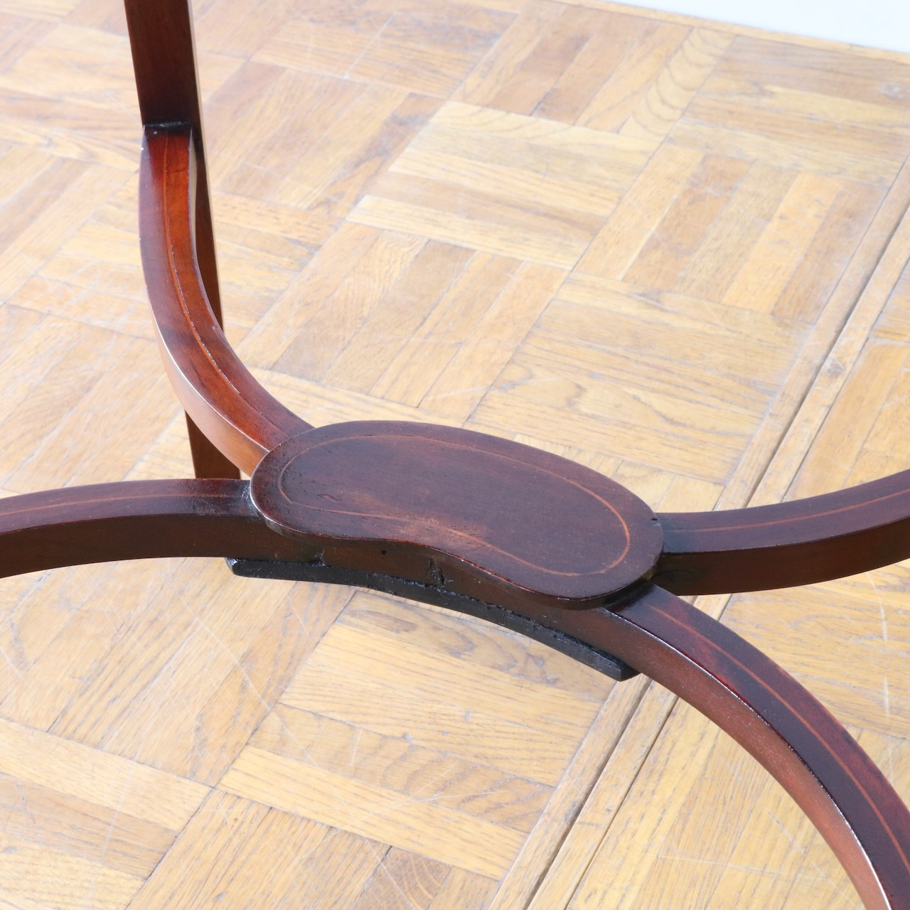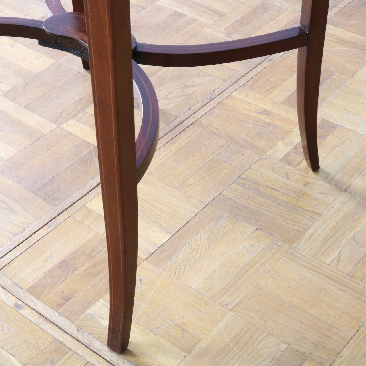 配送料の目安 ▶︎1910年代、マホガニー材のオケージョナルテーブル。柔らかな印象のキドニー型で、よく見ると脚元のストレッチャーを繋いでいる小さな板もキドニー型。可愛らしいこだわりの感じられる、美しいシルエットのテーブルです。