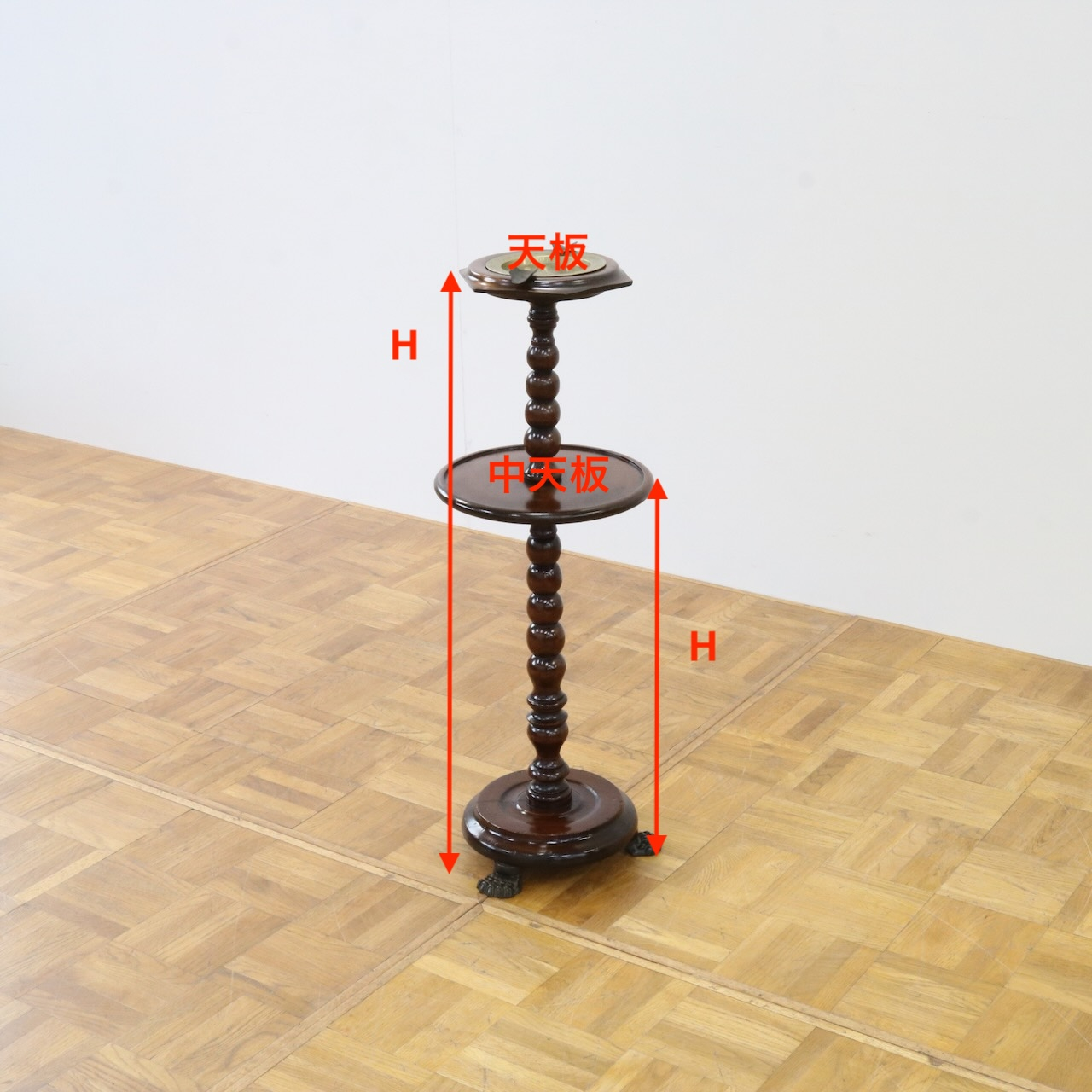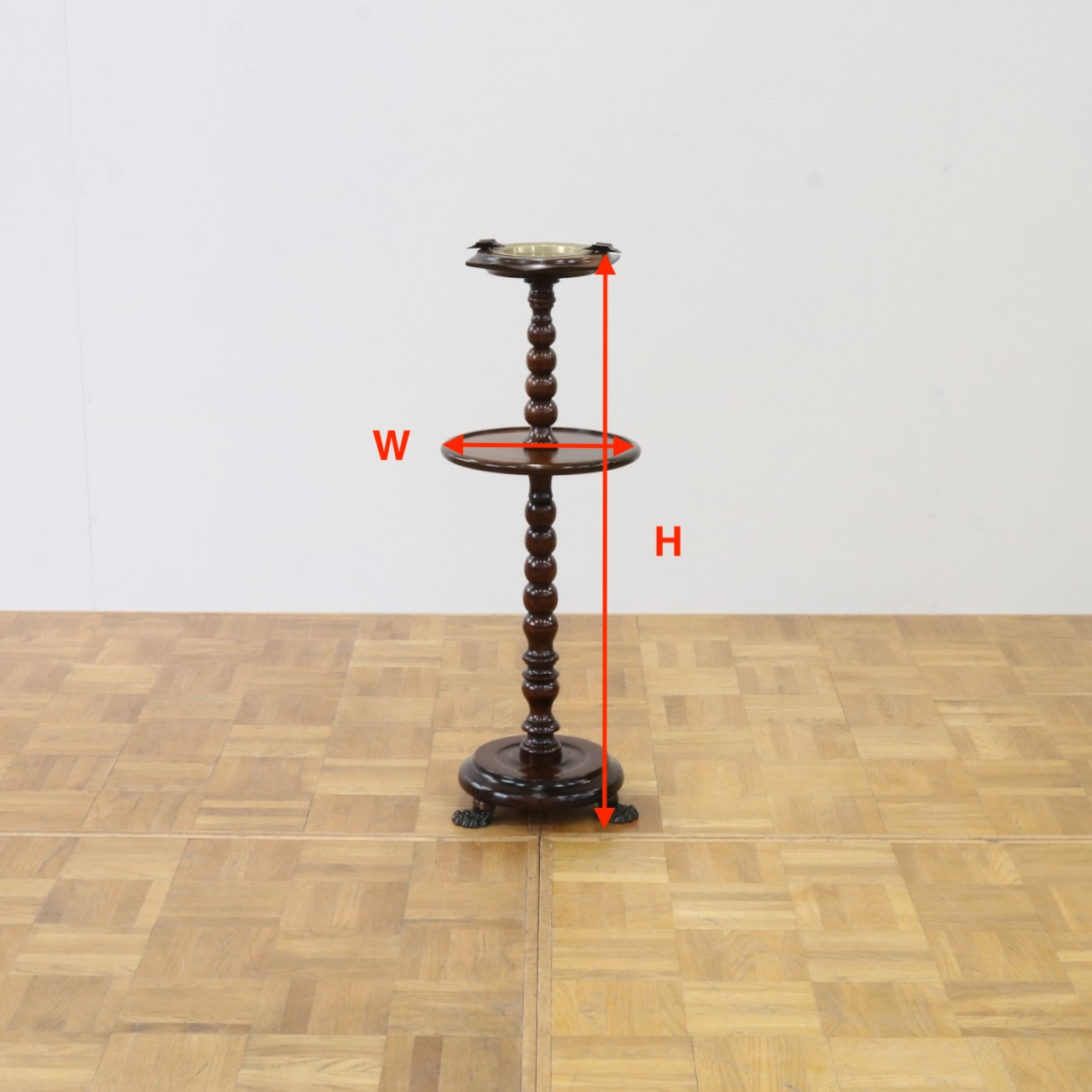 配送料の目安 ▶︎1930年代、ウォールナット材のアッシュトレイスタンド。ボビンターニングの合間に小物置きが配されています。真鍮でできたアッシュトレイの装飾も美しい一品です。