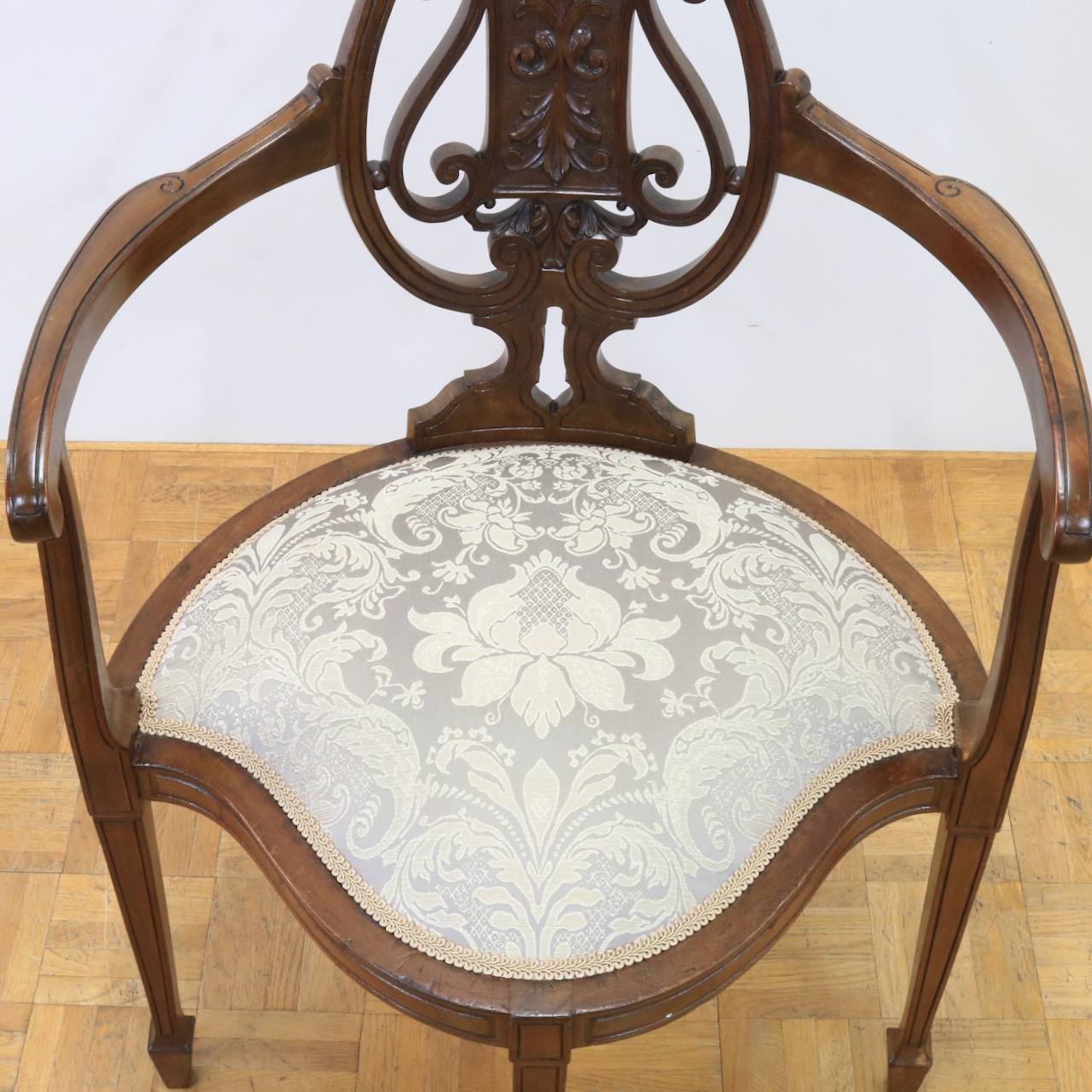配送料の目安 ▶︎1920年代・イギリス製、マホガニー材のコーナーチェアー。背もたれの雫型デザインが個性的で、透かし彫りの装飾が際立つコーナーチェアーです。