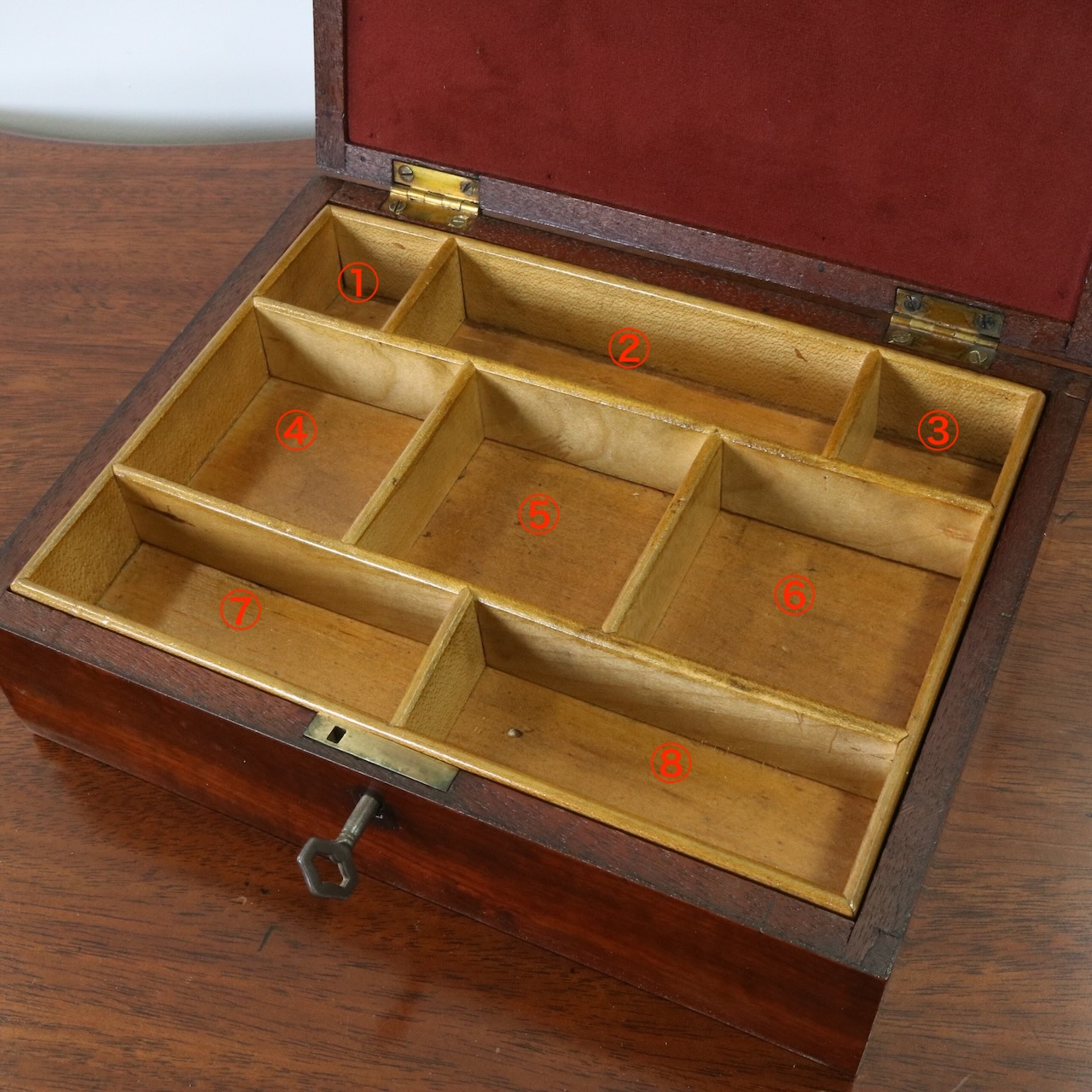外観はシンプルですが蓋を開けると手芸材料を入れていたと見られる小分けのトレーが内蔵されています。