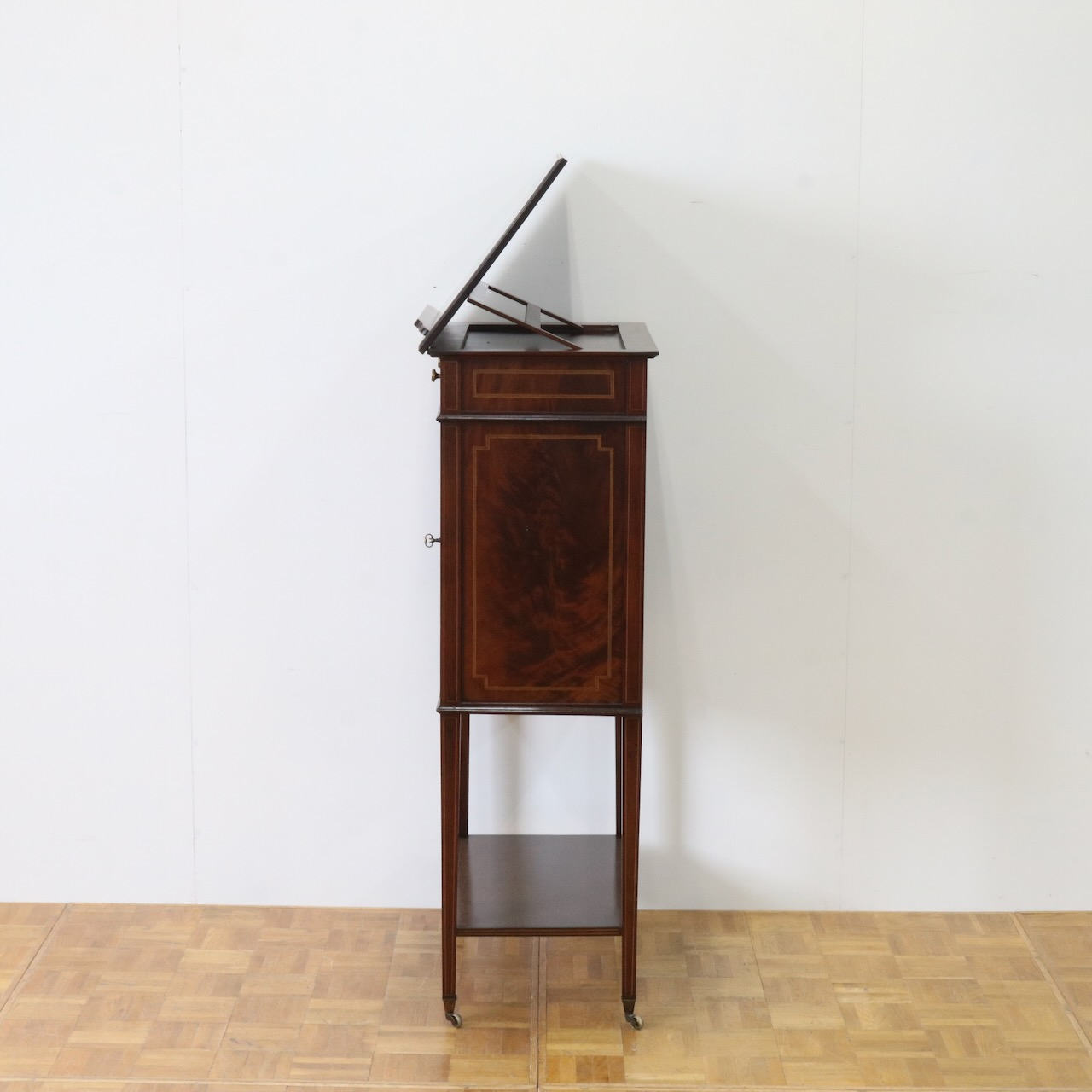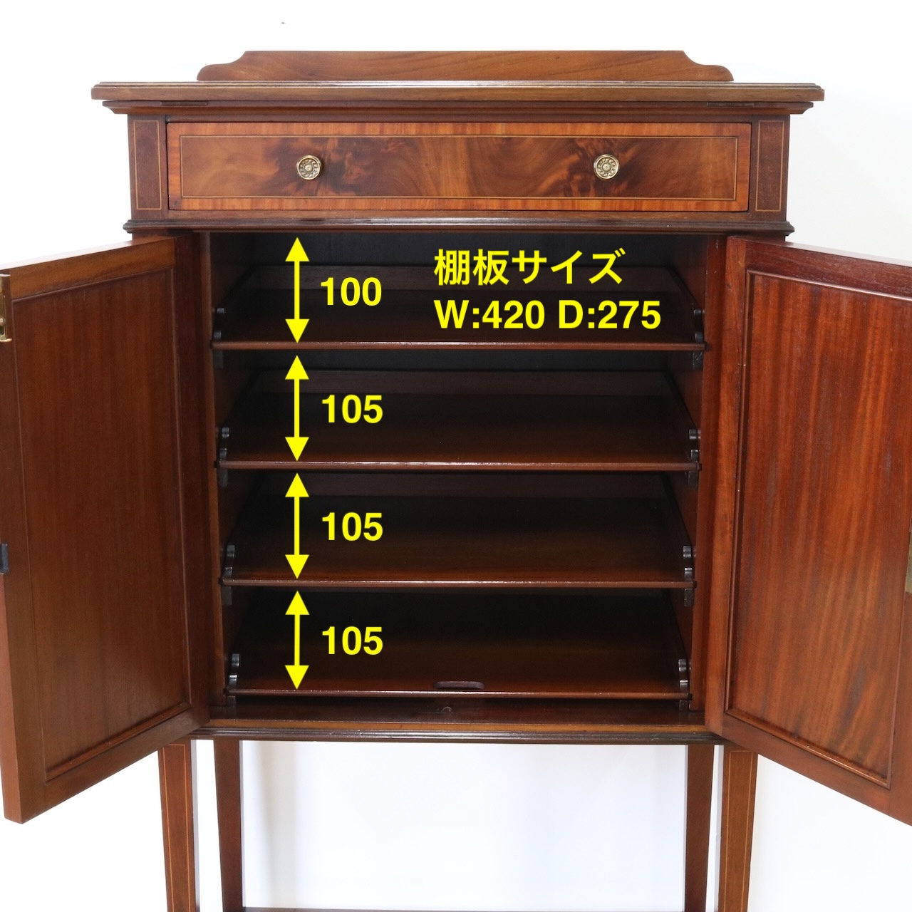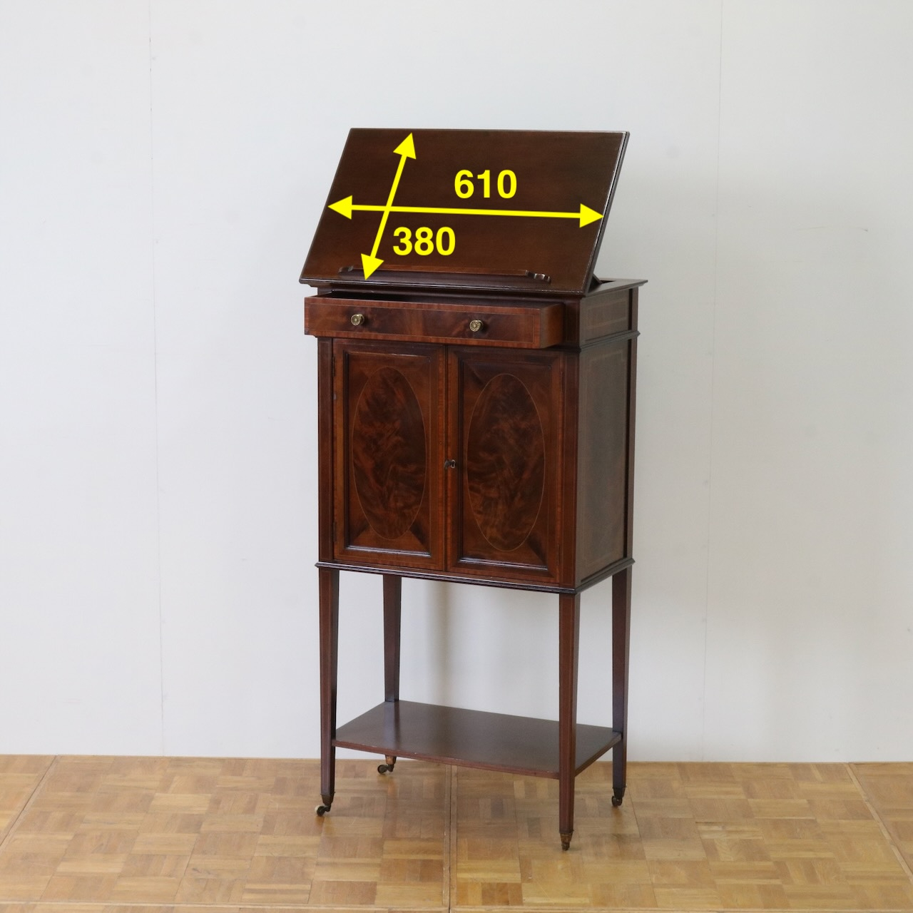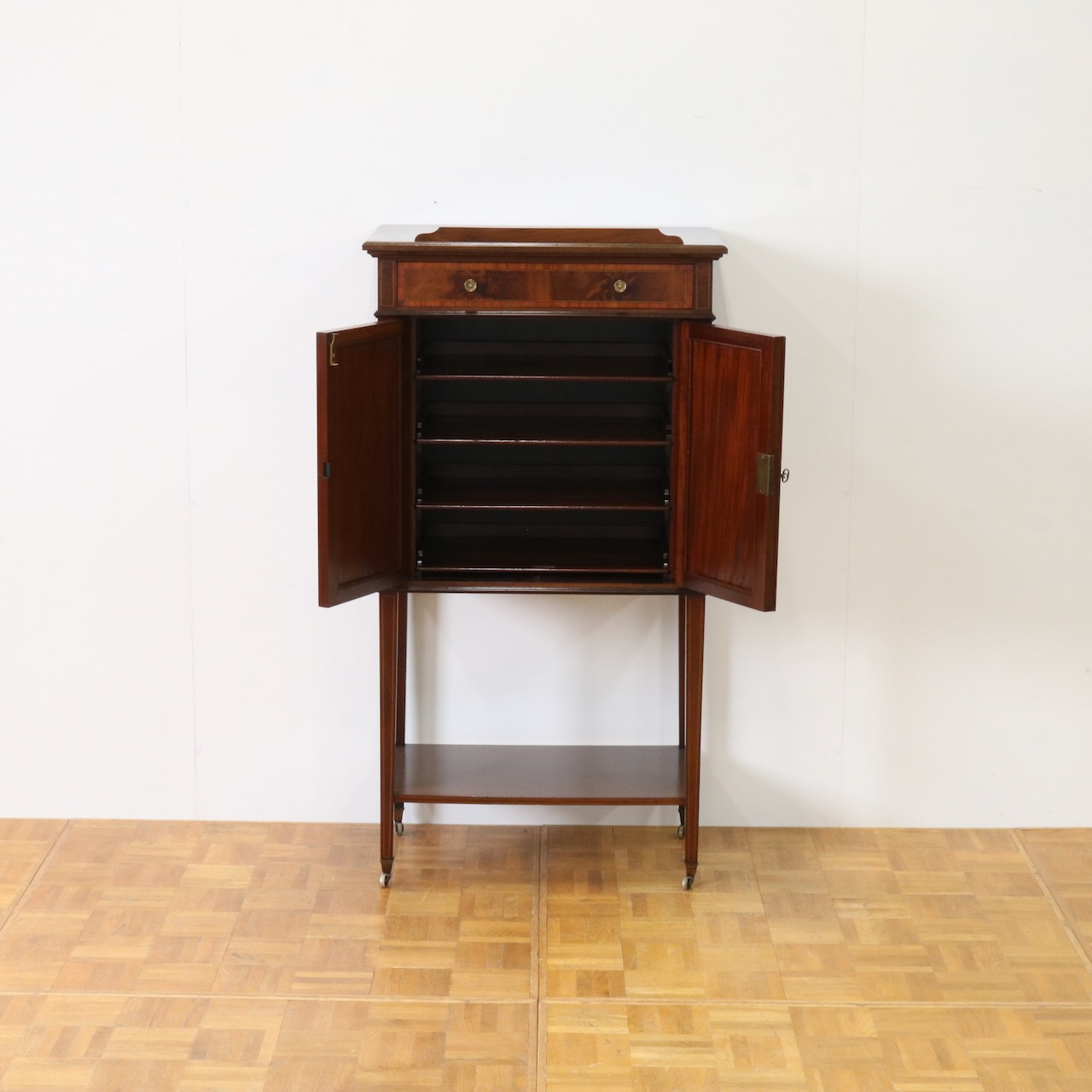 配送料の目安 ▶︎マホガニーのミュージックキャビネット。扉を開くと楽譜を入れるのに適した引き出しの仕様になっています。さらに天板は楽譜立てになっている珍しい造りに惹かれます。