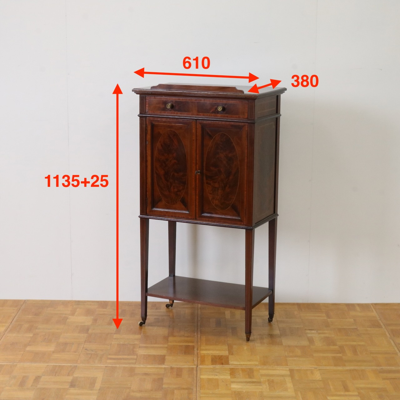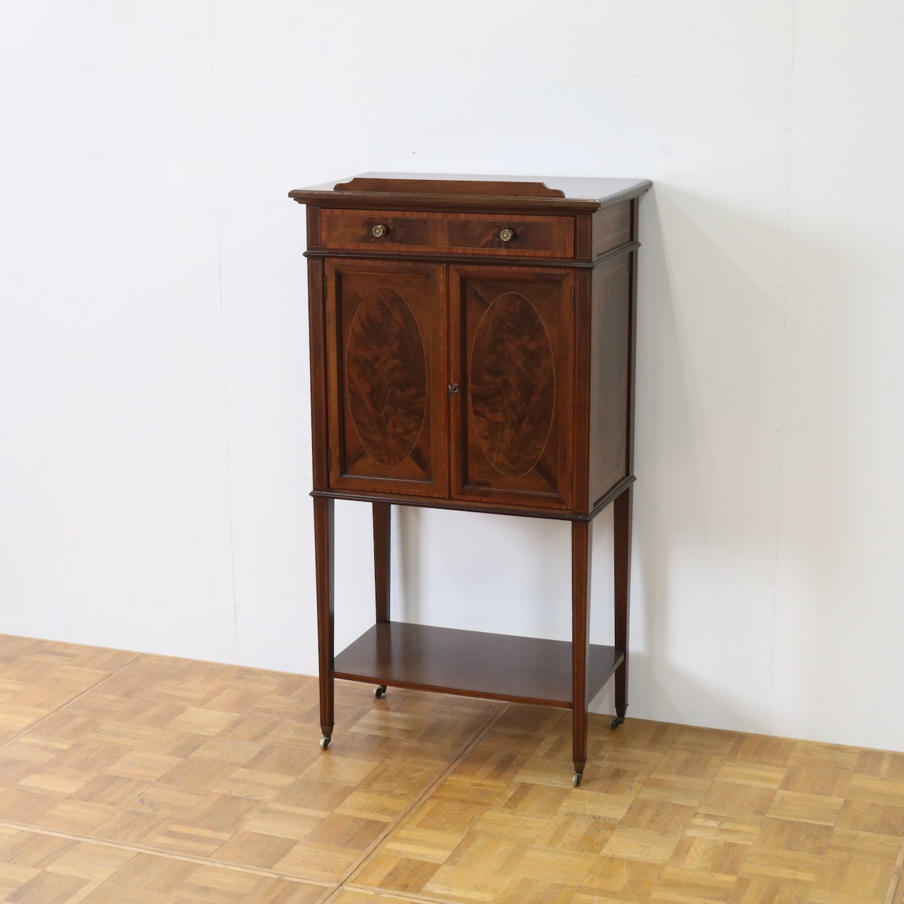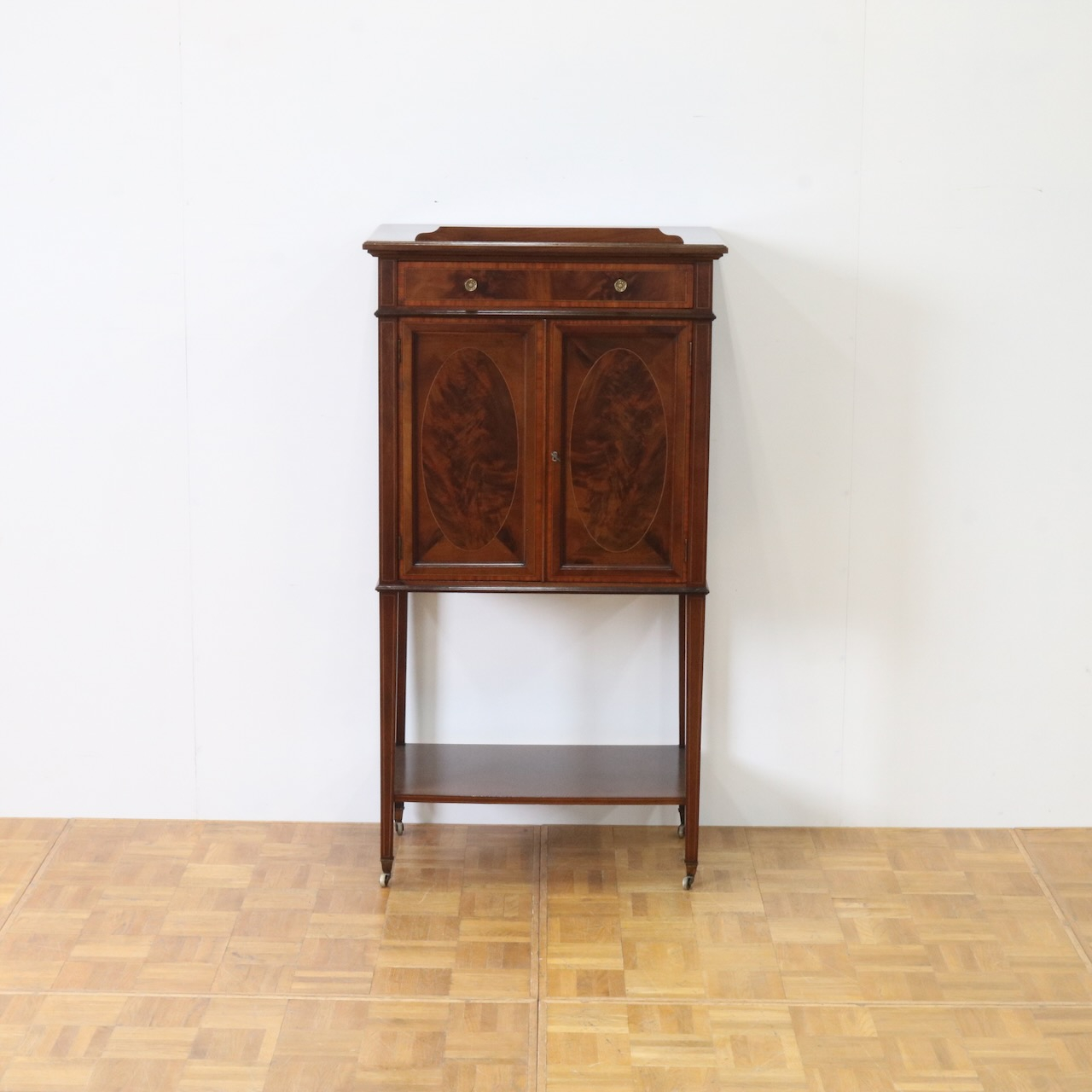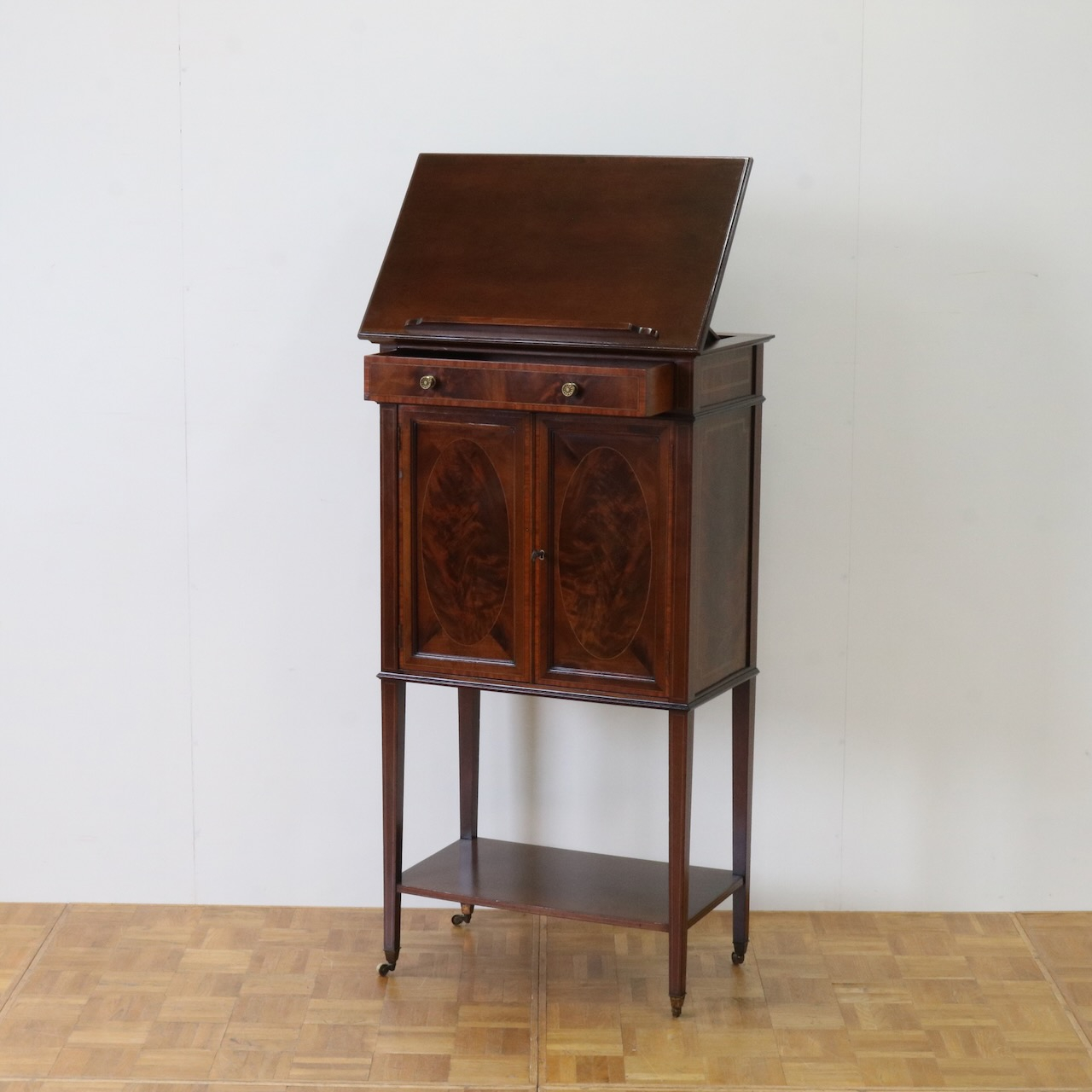 配送料の目安 ▶︎マホガニーのミュージックキャビネット。扉を開くと楽譜を入れるのに適した引き出しの仕様になっています。さらに天板は楽譜立てになっている珍しい造りに惹かれます。