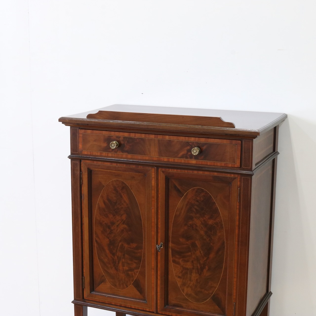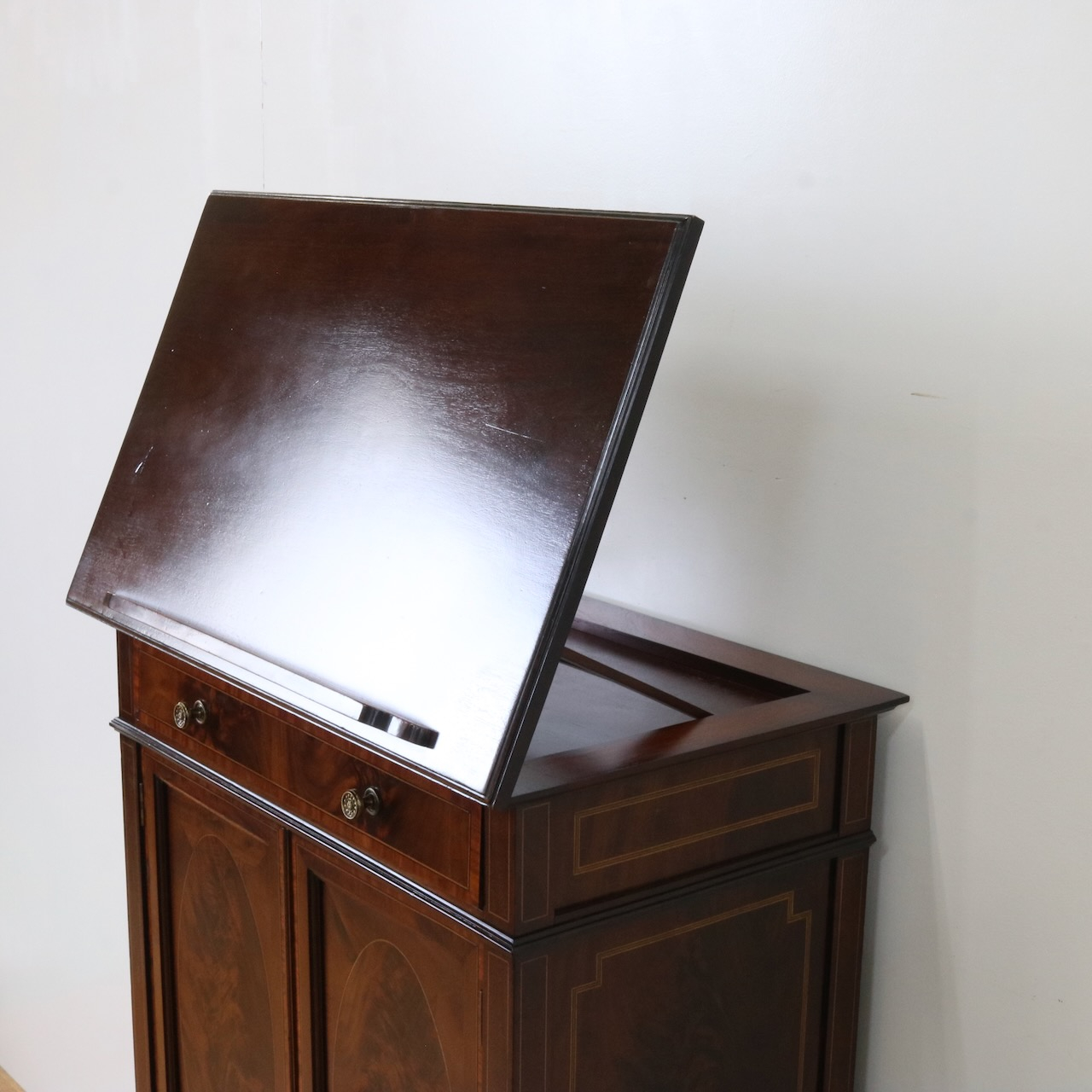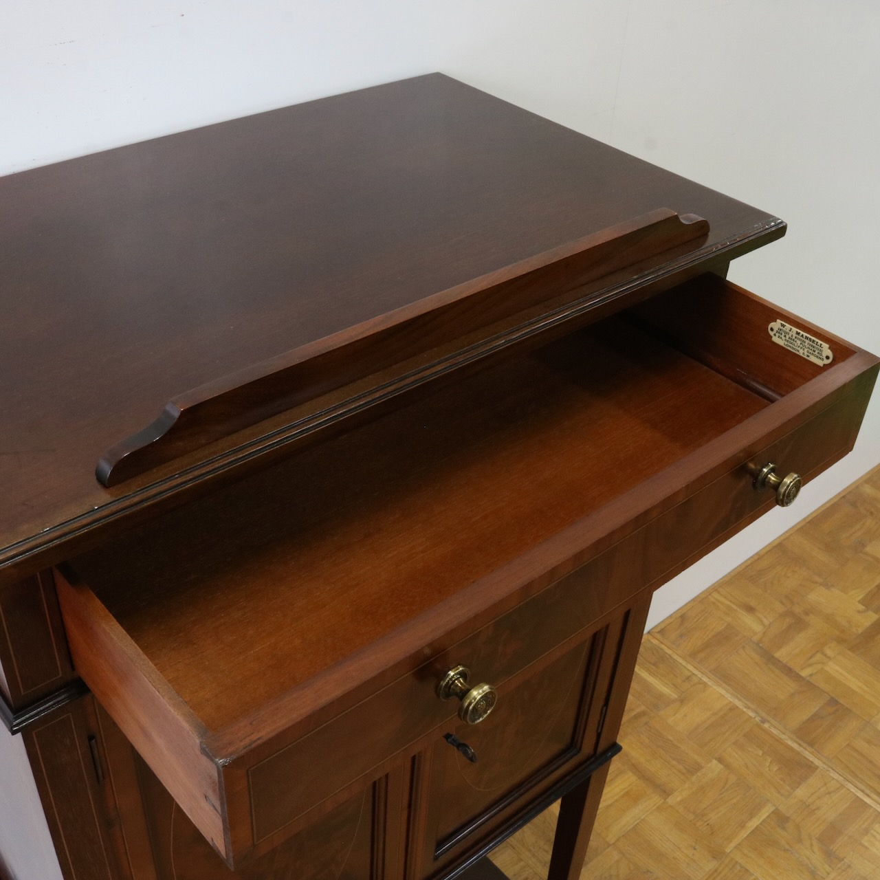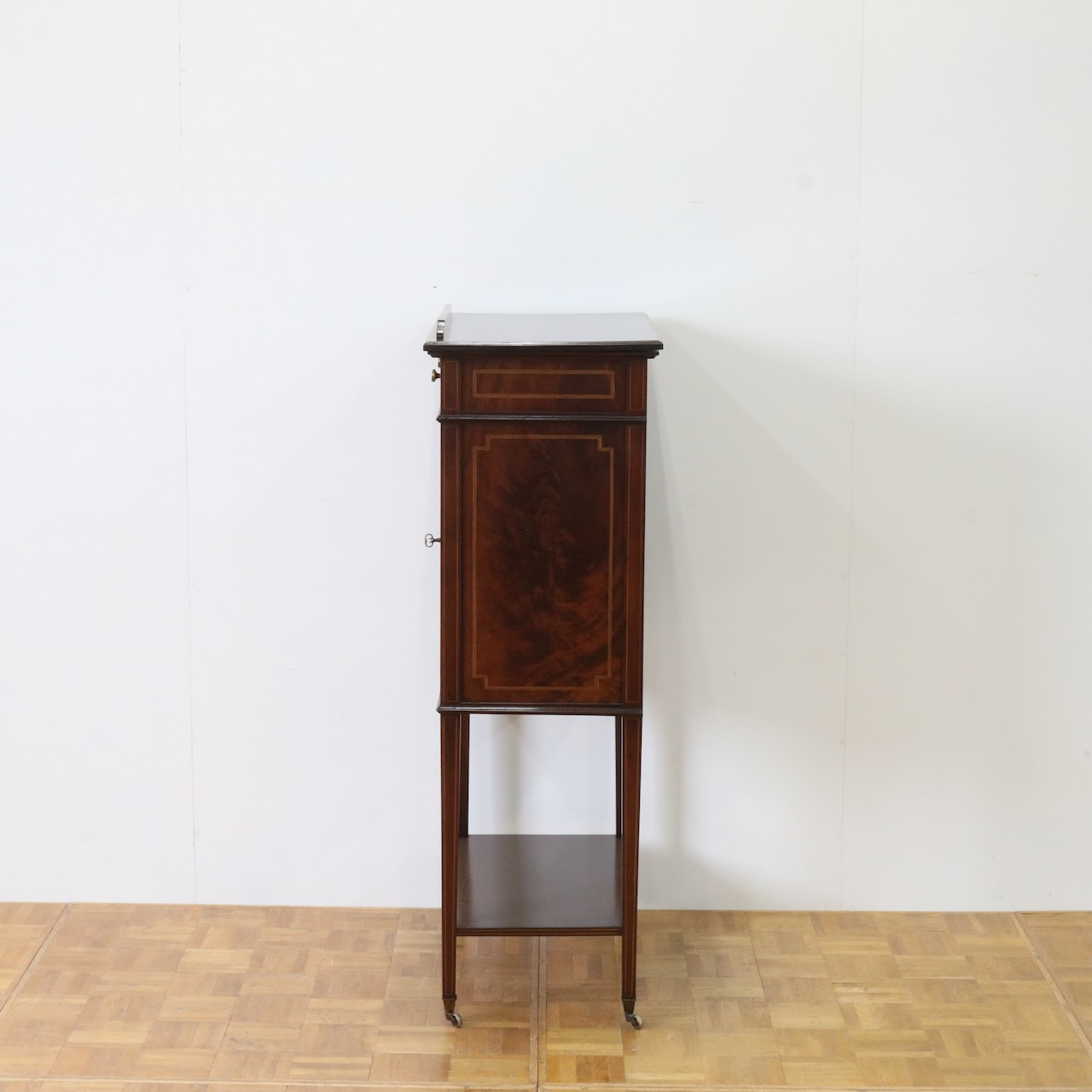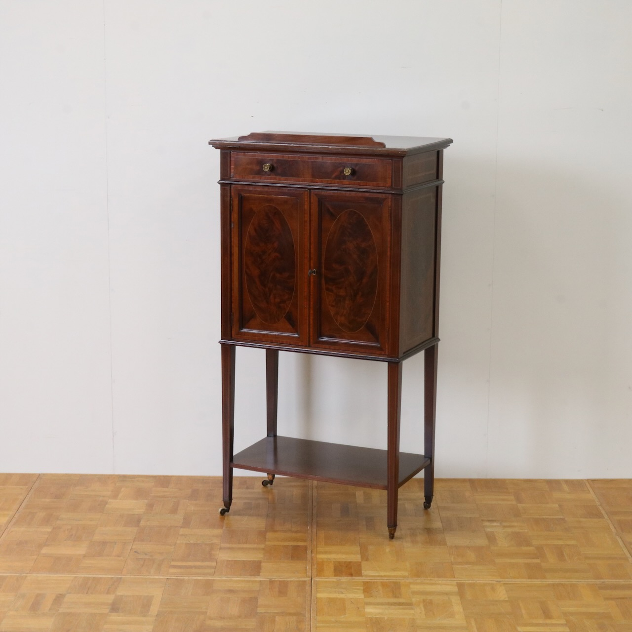 配送料の目安 ▶︎マホガニーのミュージックキャビネット。扉を開くと楽譜を入れるのに適した引き出しの仕様になっています。さらに天板は楽譜立てになっている珍しい造りに惹かれます。