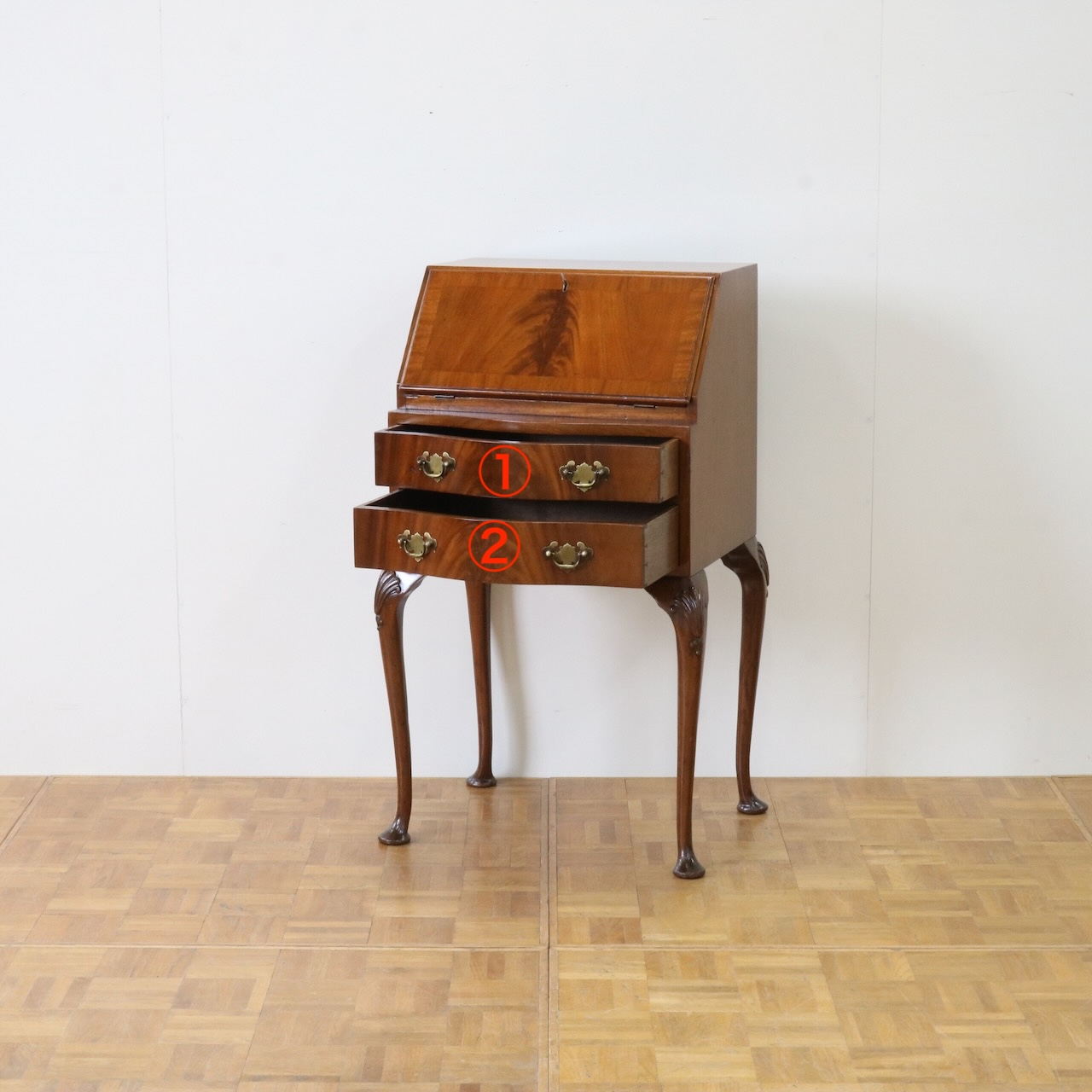 幅55cmとスモールサイズなのに内部のインテリア・下部の2段の引き出しと収納場所があるのも使い勝手の良いビューローです。