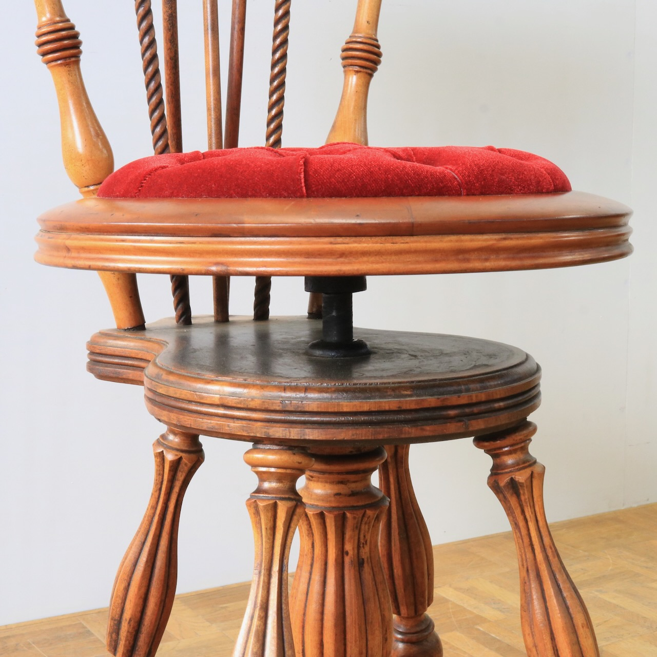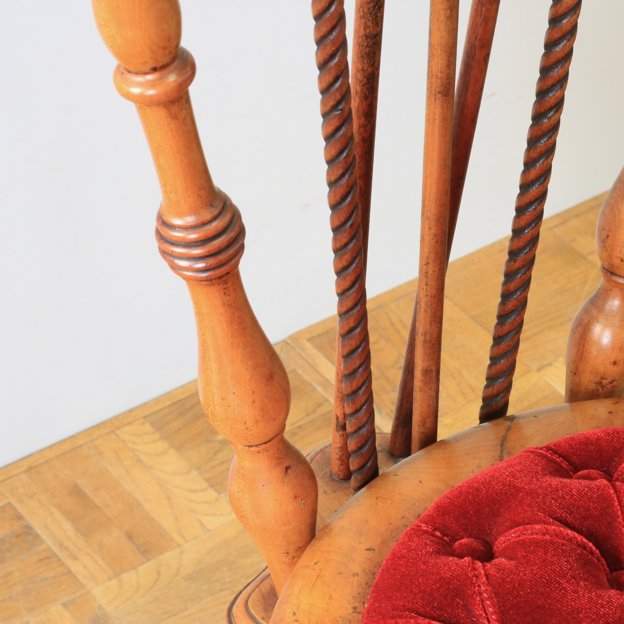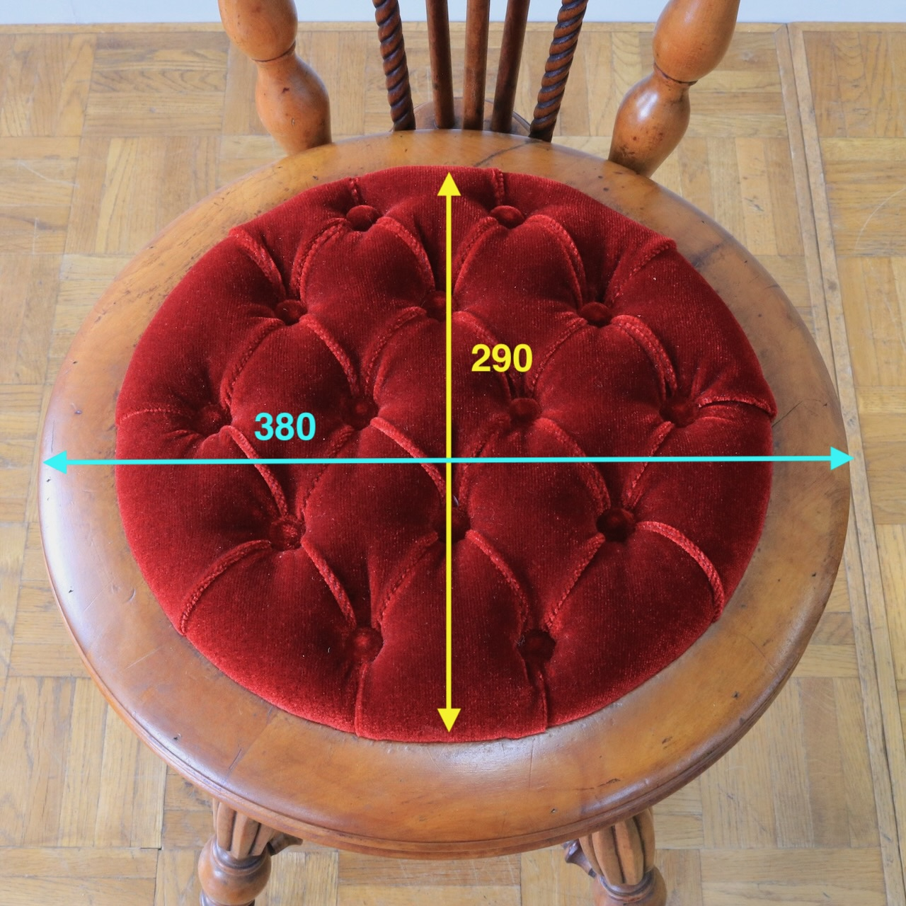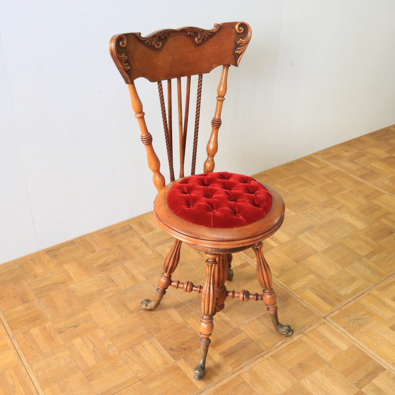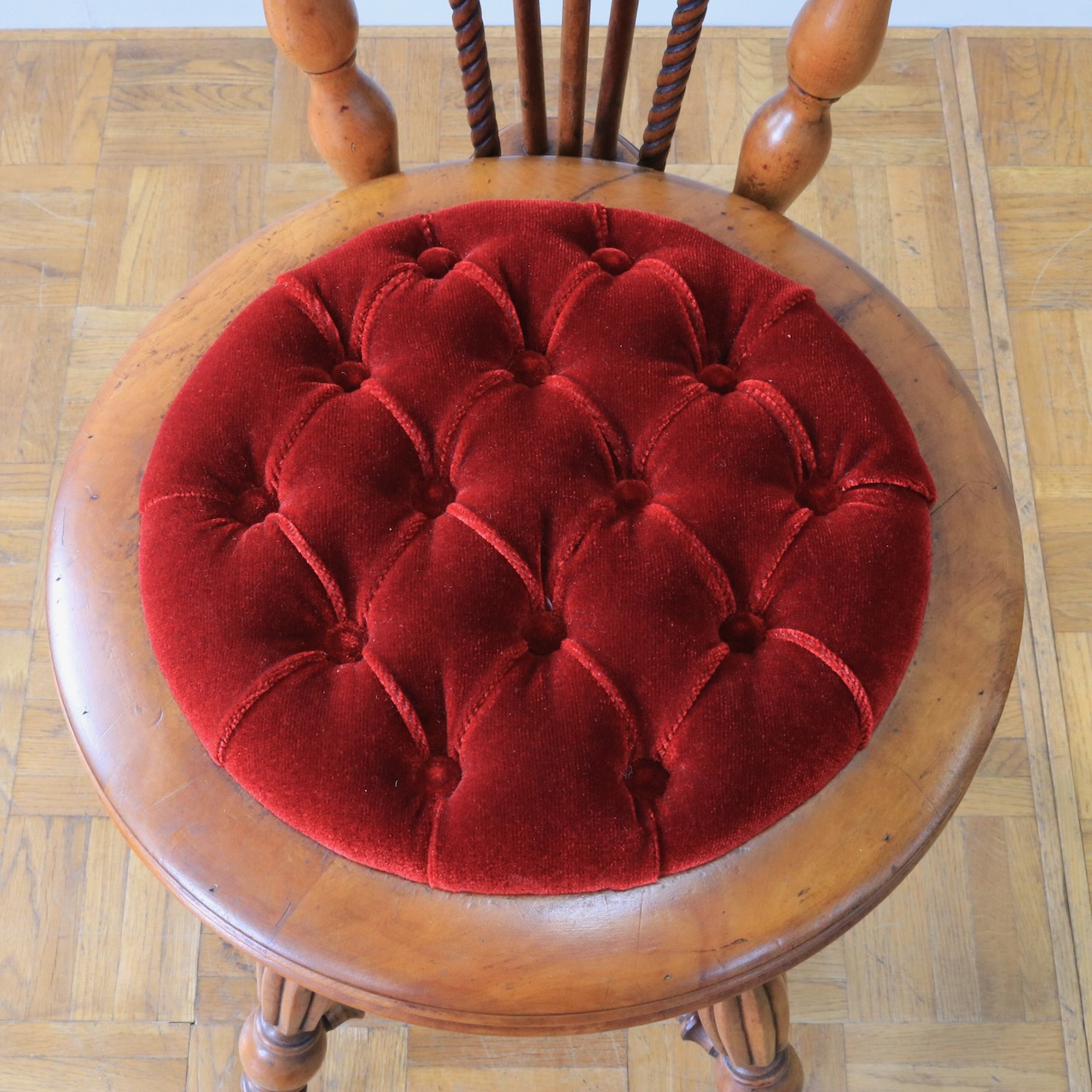 座面は中材ごと張替えました。買い付け当時のオリジナルと同じボタン締めにし、クラシカルな佇まいに仕上げています。生地は赤いベロア生地。上品な触り心地と濃淡が一層雰囲気を高めます。