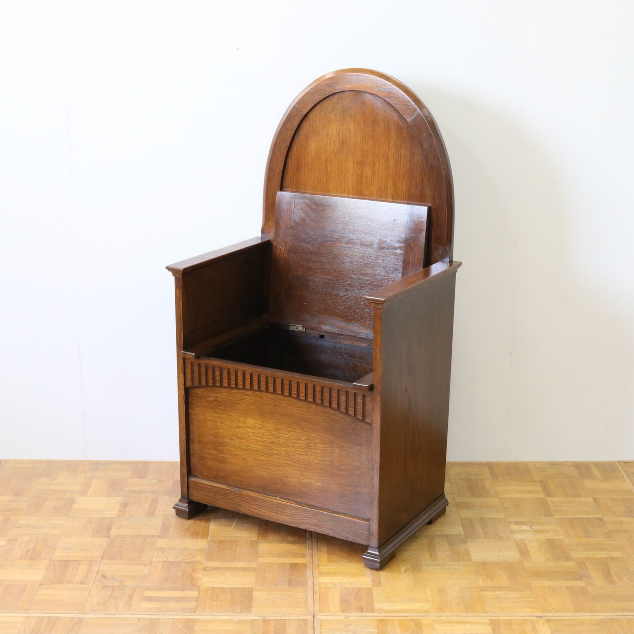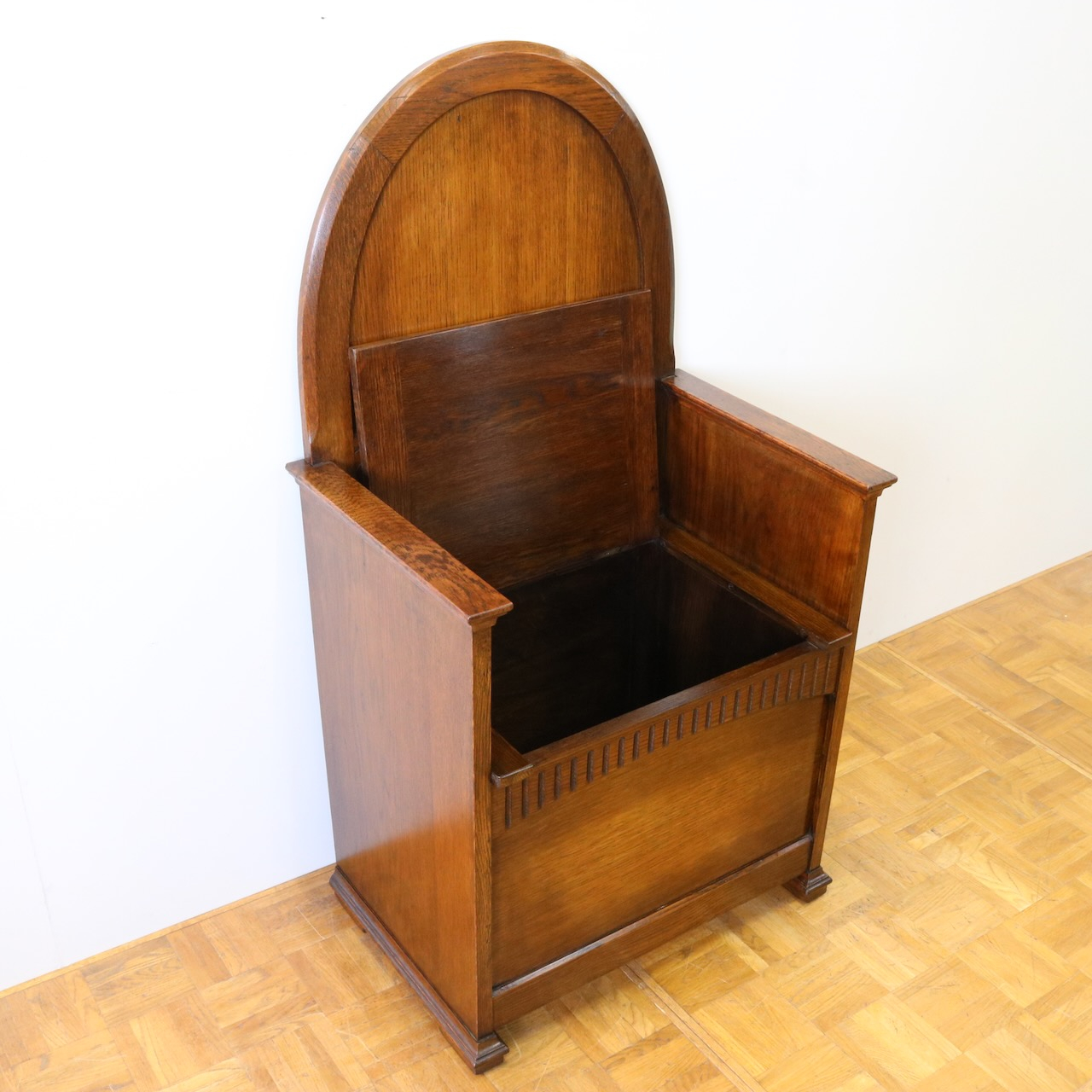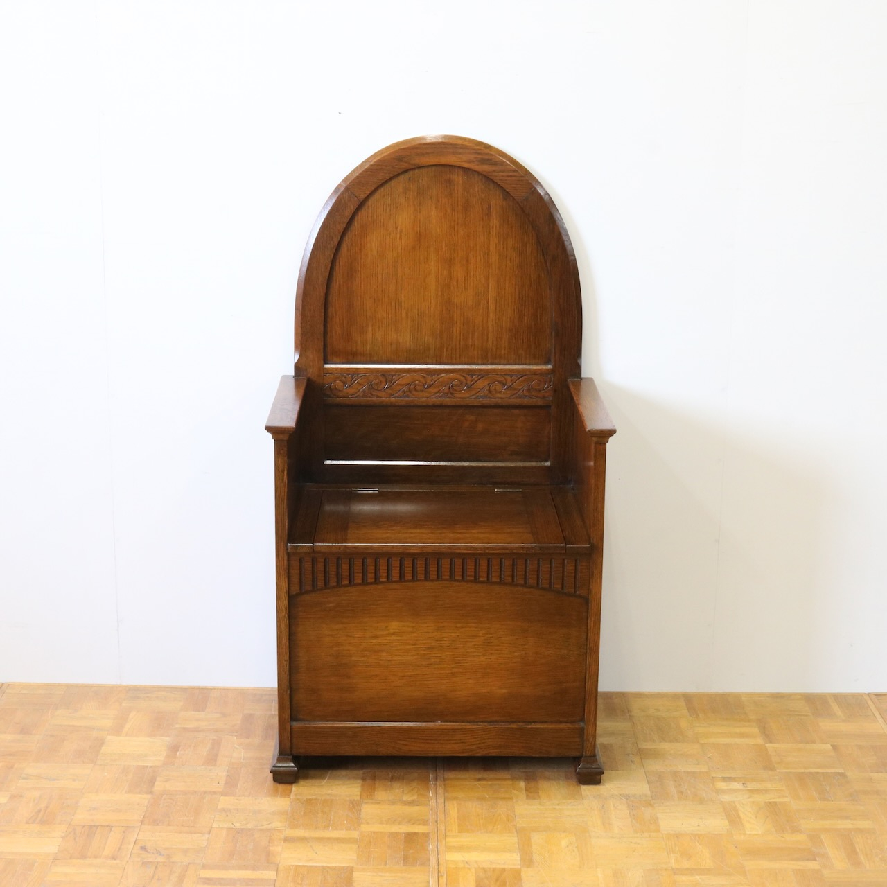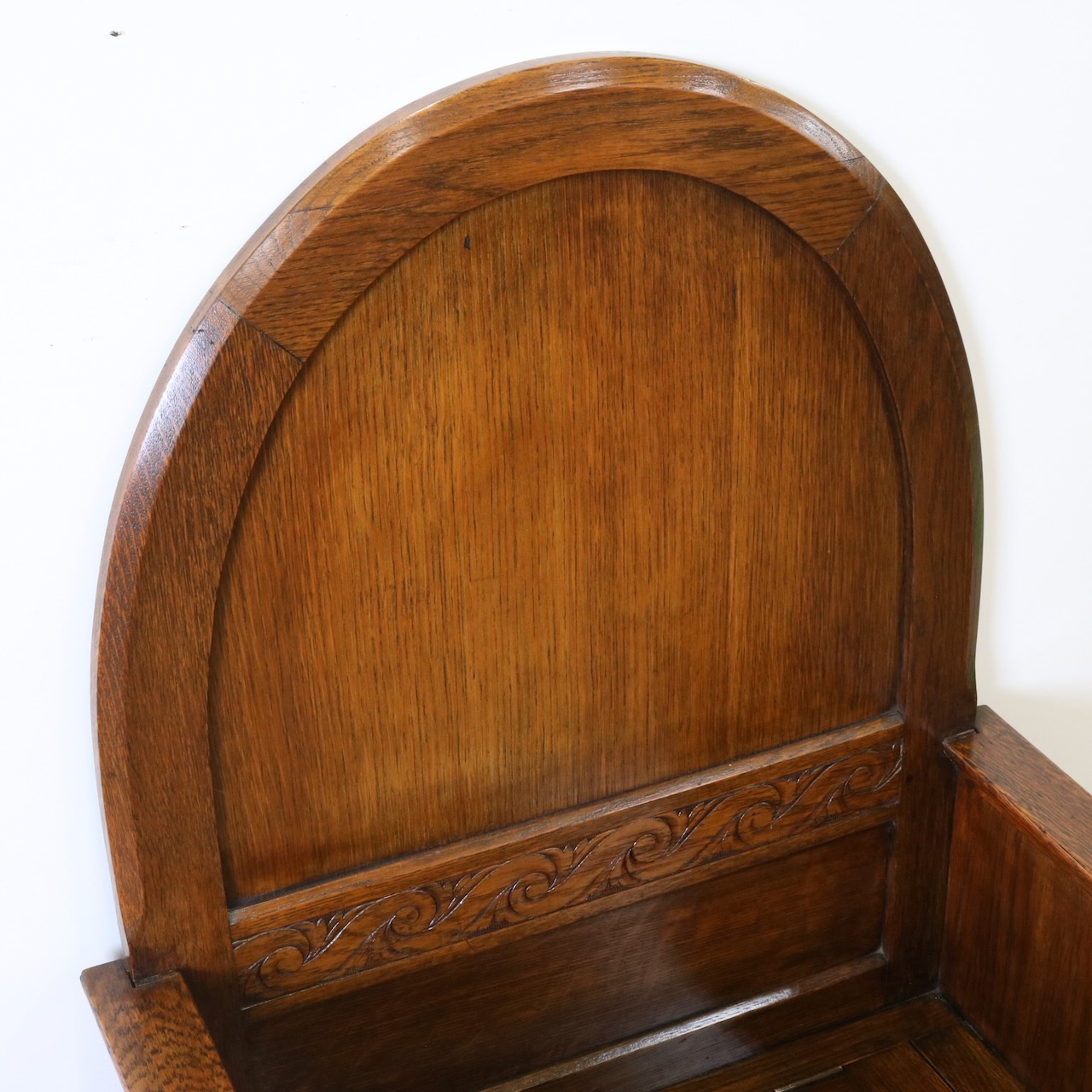 背もたれのアーチ型デザインと、座面下の収納部が特徴的なベンチ。