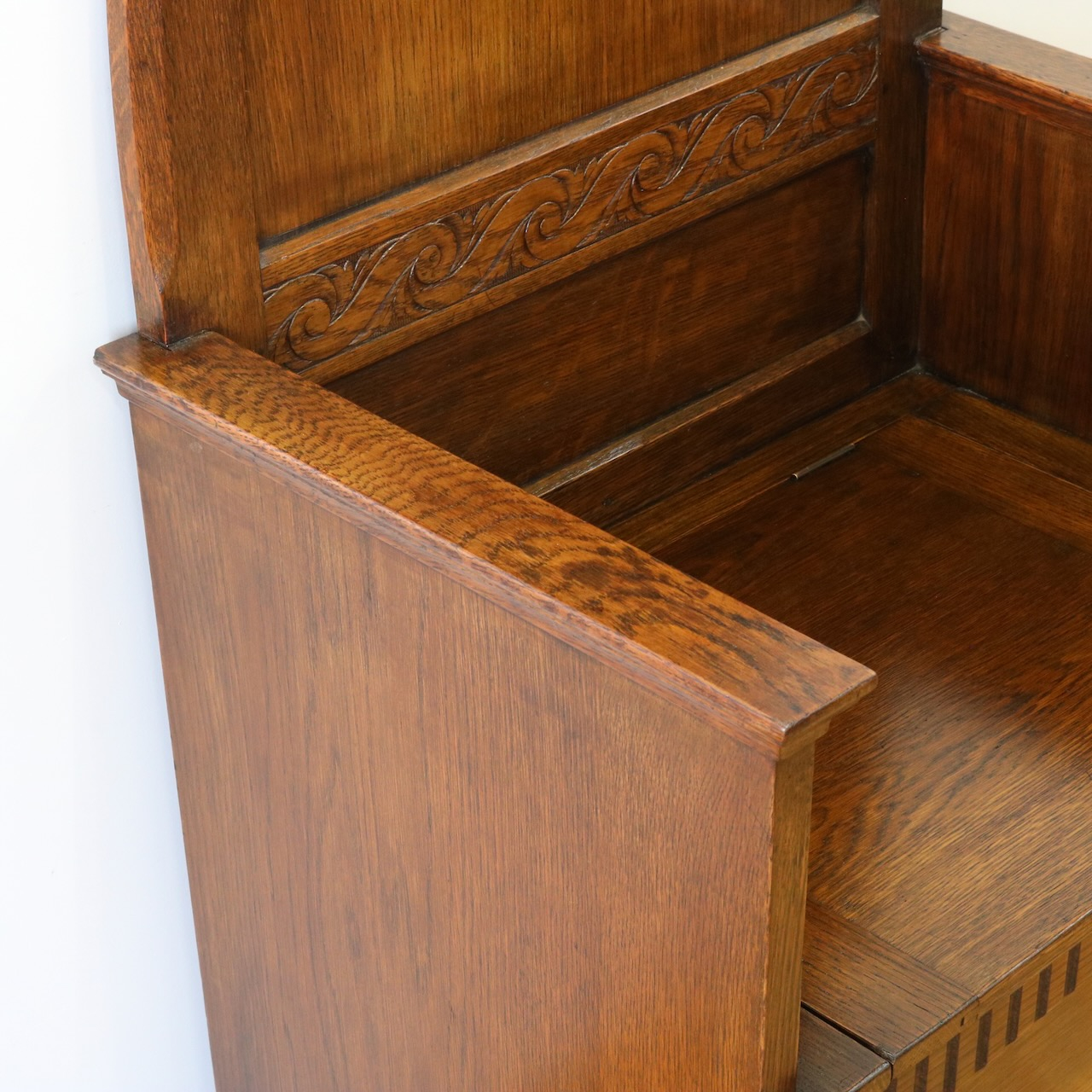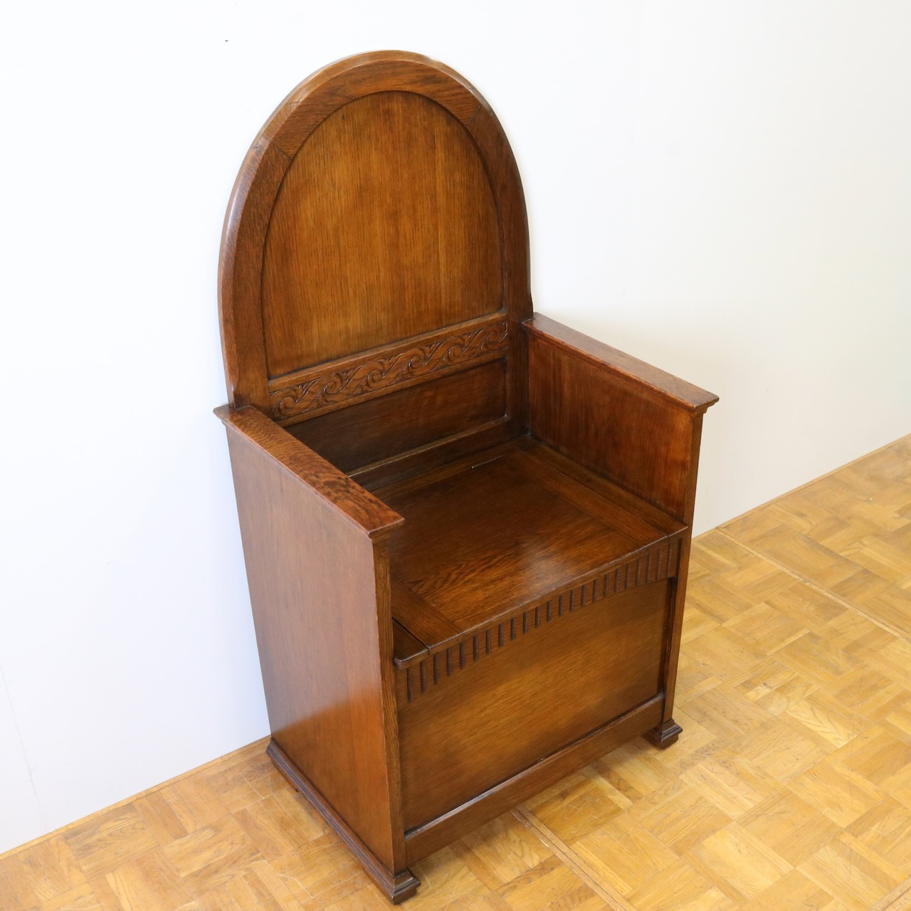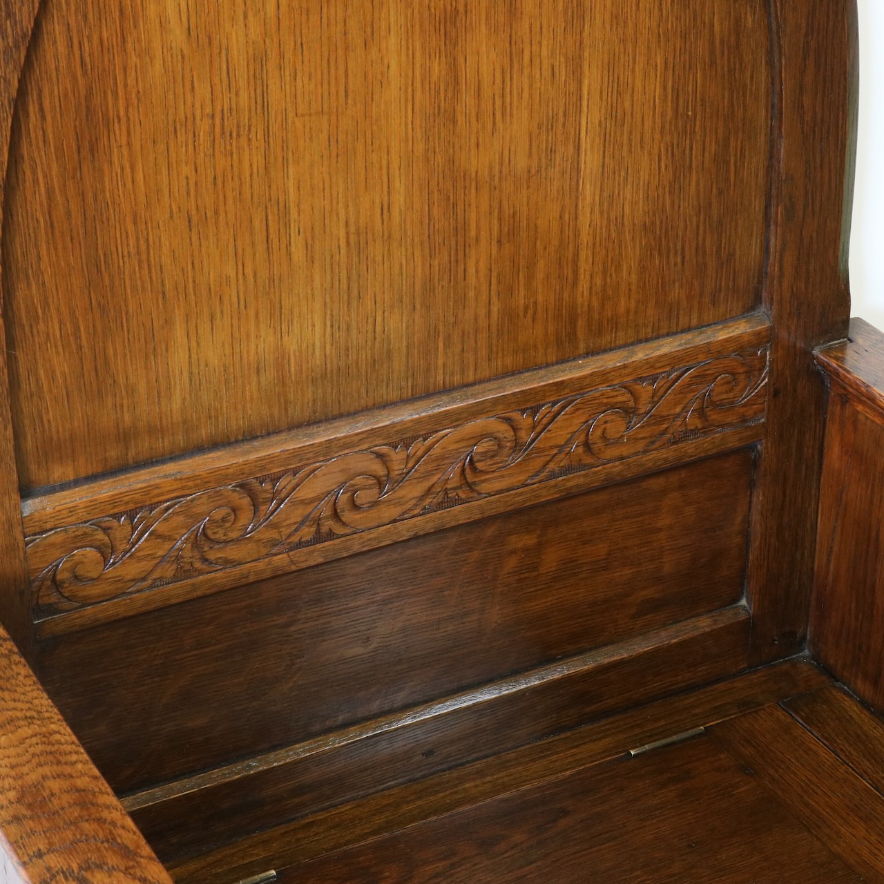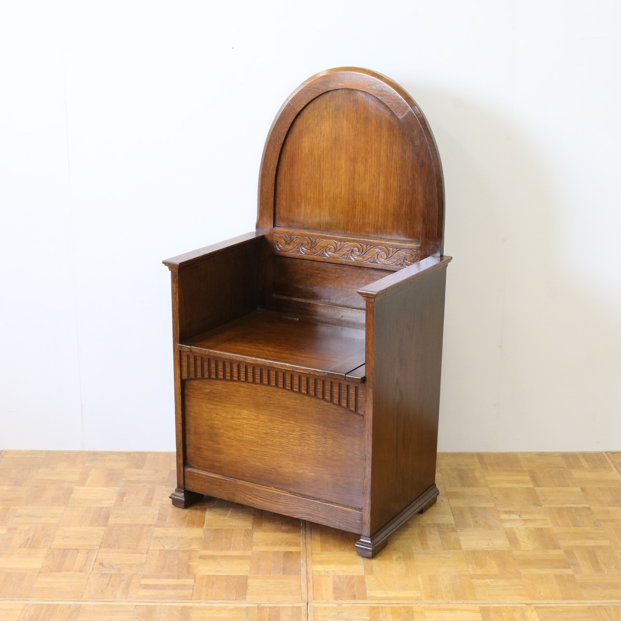 背もたれのアーチ型デザインと、座面下の収納部が特徴的なベンチ。