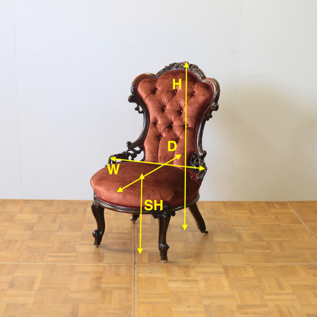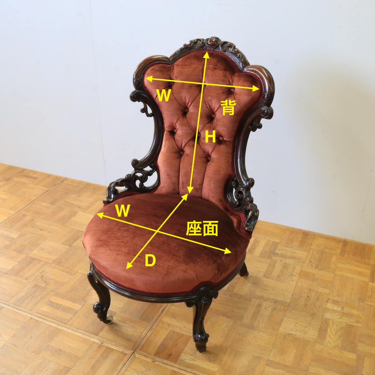配送料の目安 ▶︎1890年代ヴィクトリアン、ウォールナットのナーシングチェアー。小ぶりなサイズに華やかな背もたれ、丸く膨らみのある座面が可愛らしい仕上がりです。