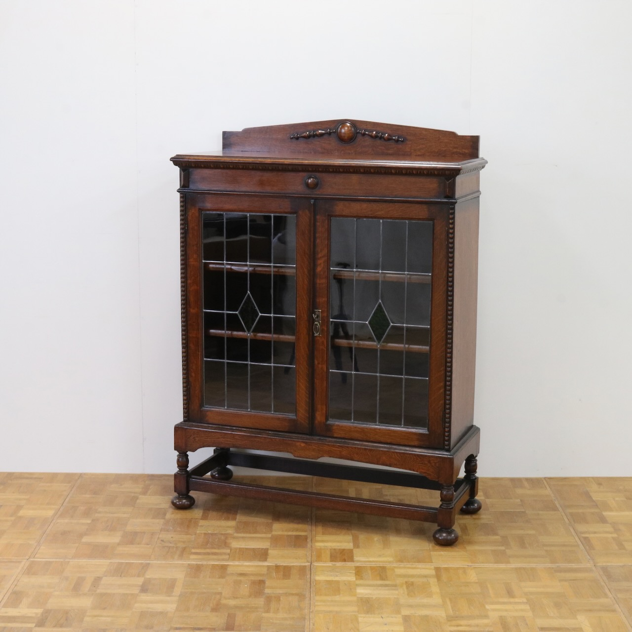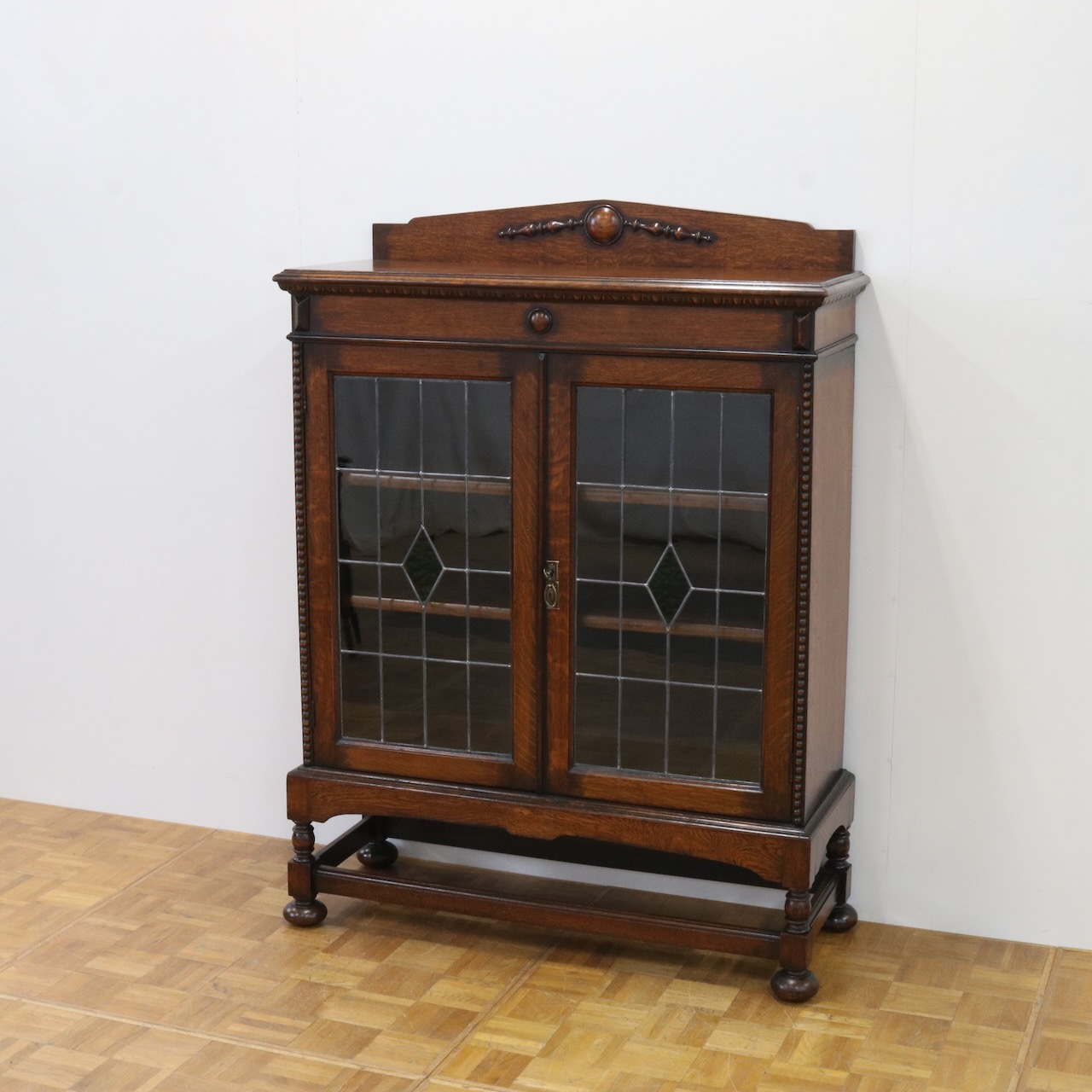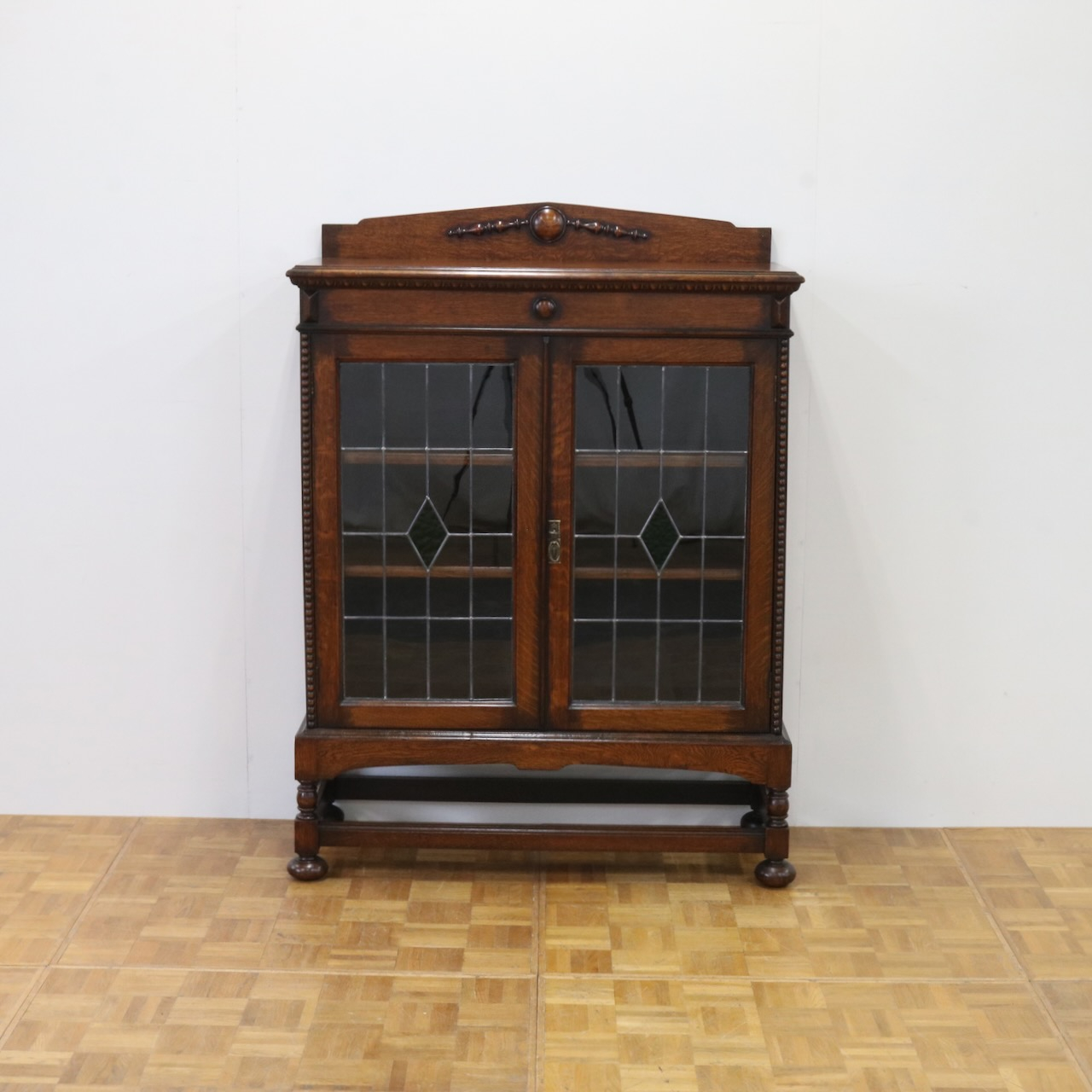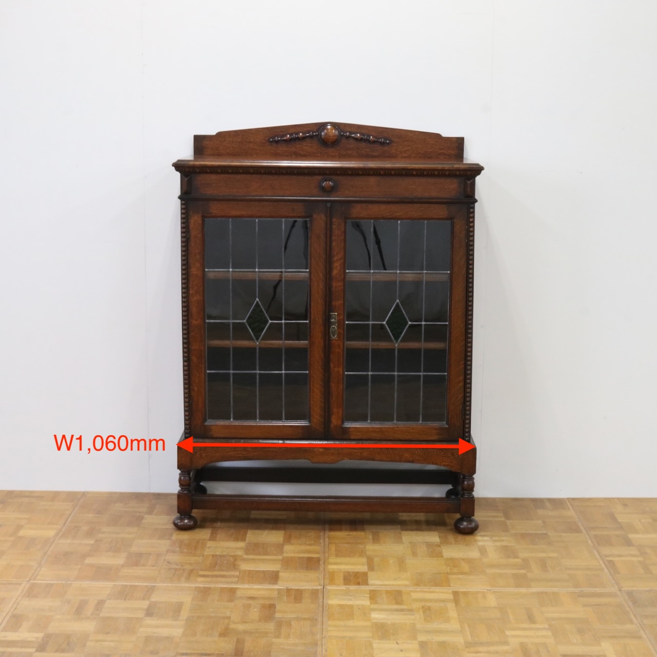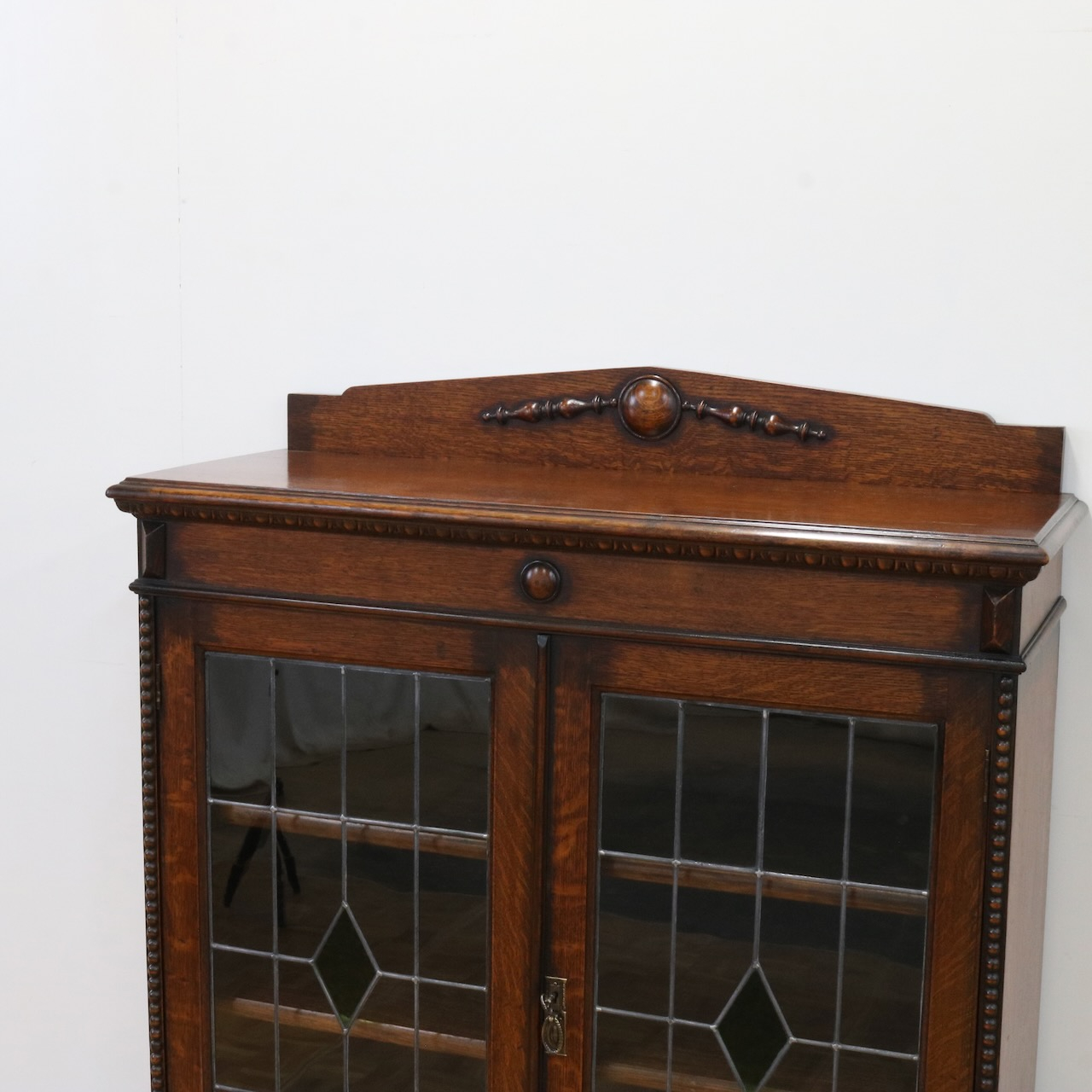 配送料の目安 ▶︎1930年代、オーク材のブックケース。菱形のアクセントが目を惹くリーディッドガラスの扉、トップパーツのユニークな飾りなど、クラシックな意匠が随所に光るアイテムです。