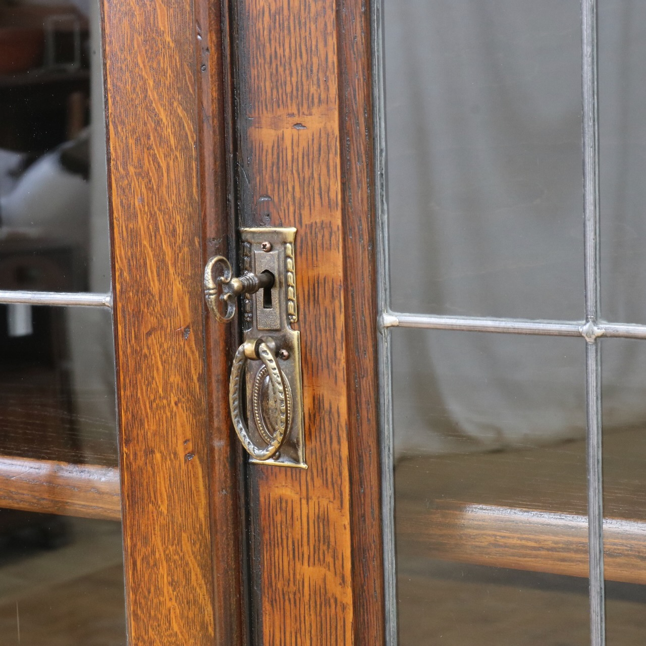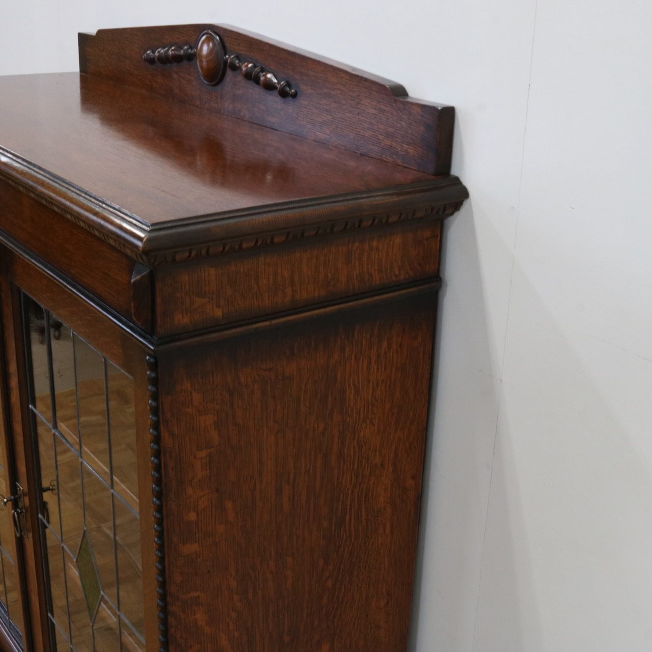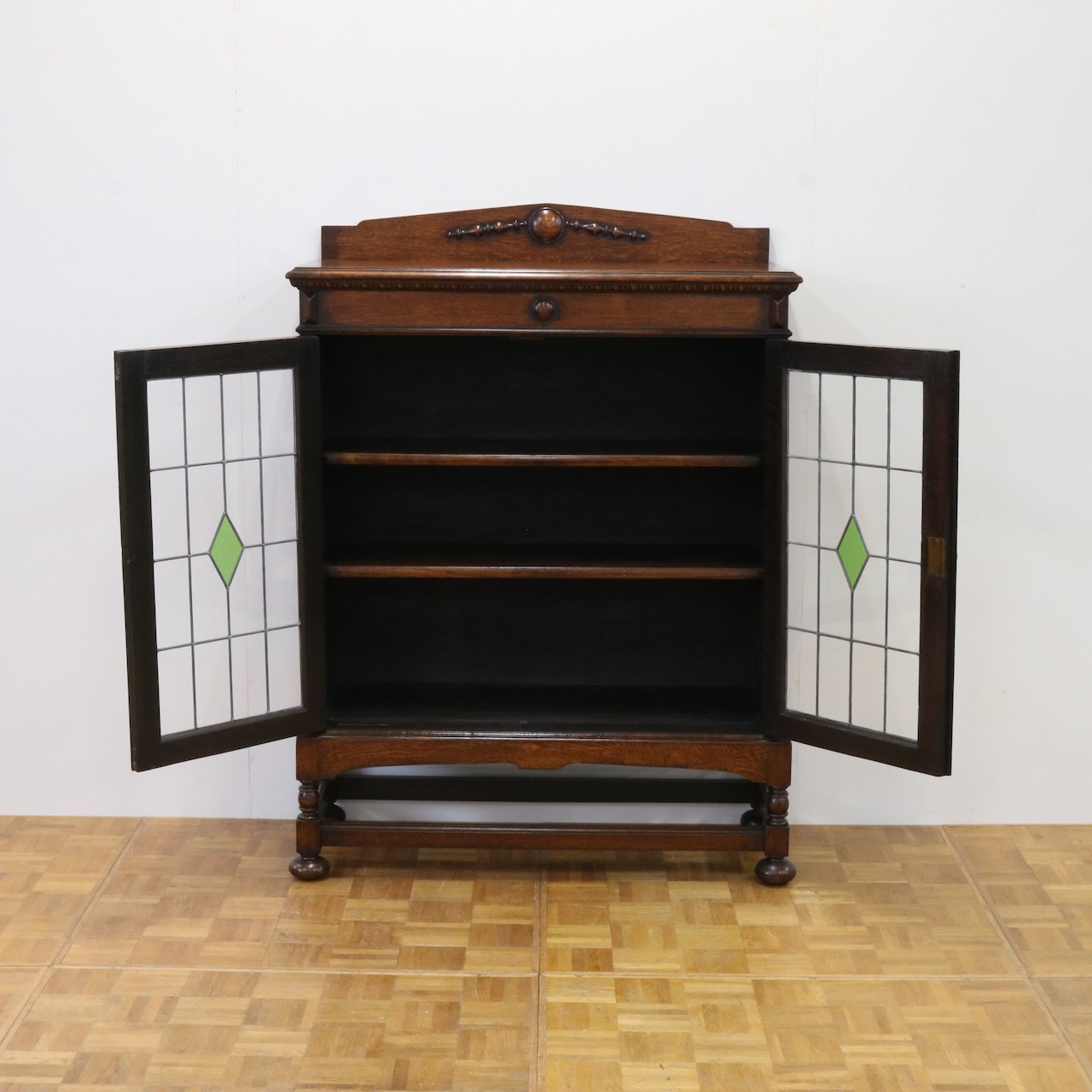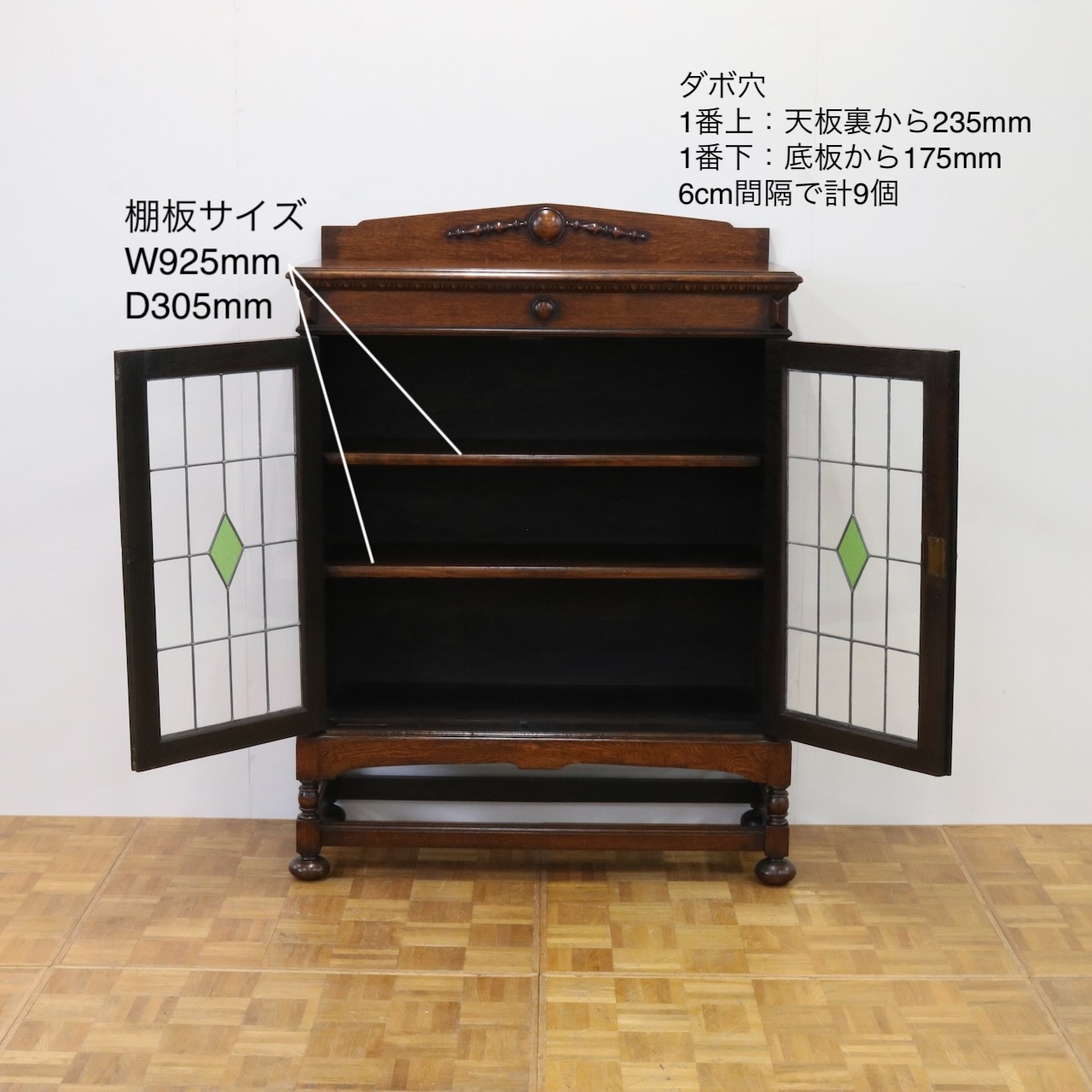 配送料の目安 ▶︎1930年代、オーク材のブックケース。菱形のアクセントが目を惹くリーディッドガラスの扉、トップパーツのユニークな飾りなど、クラシックな意匠が随所に光るアイテムです。