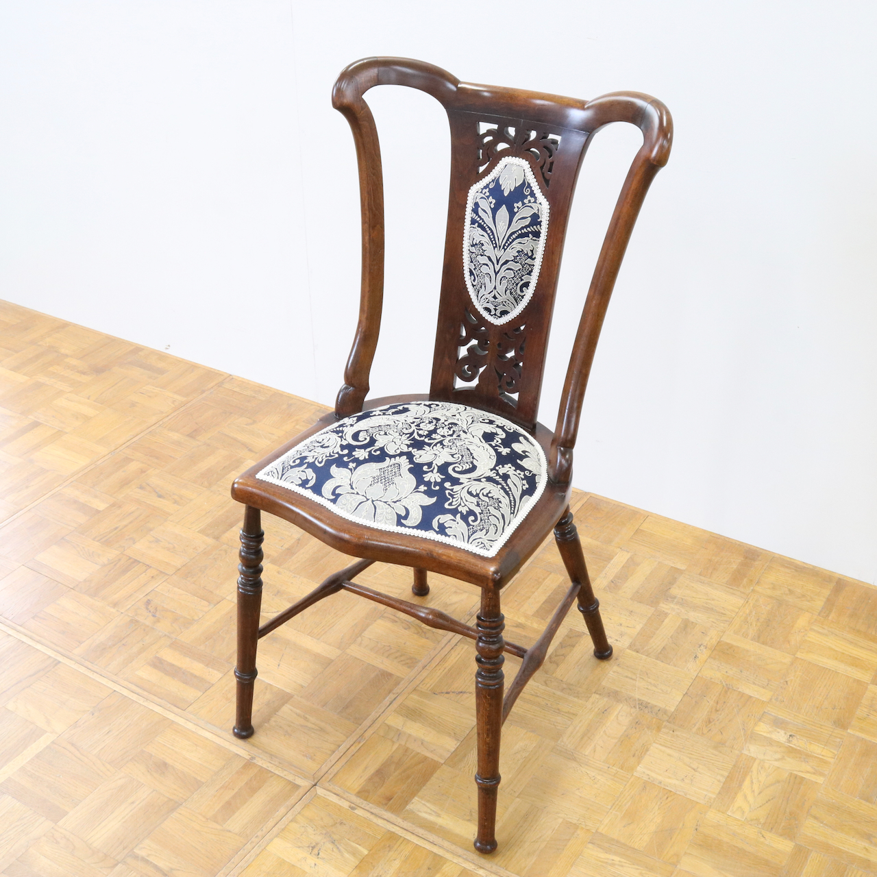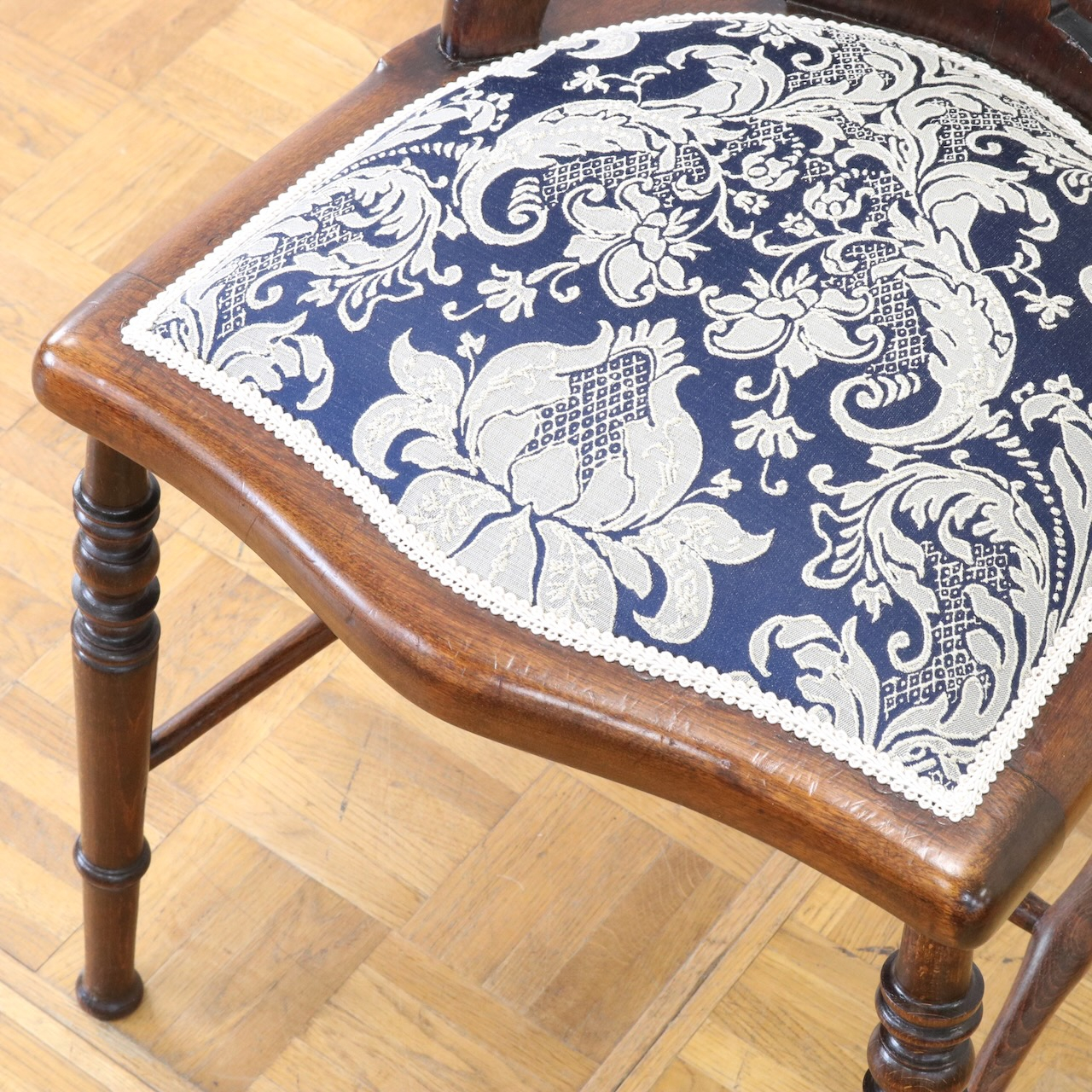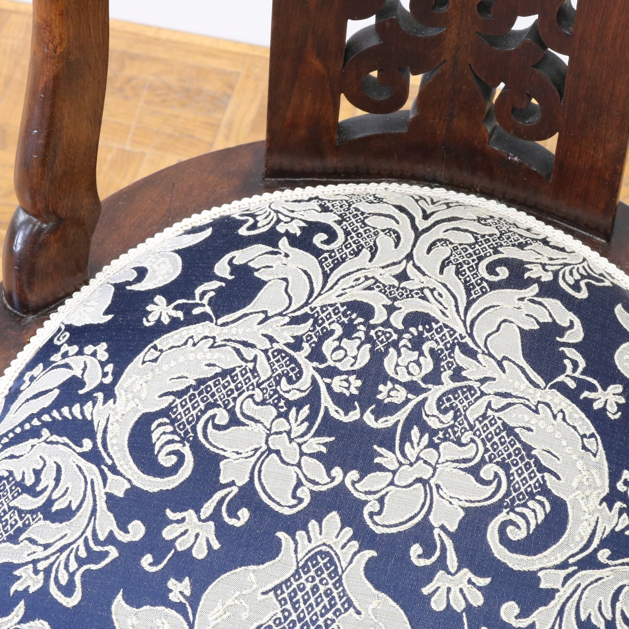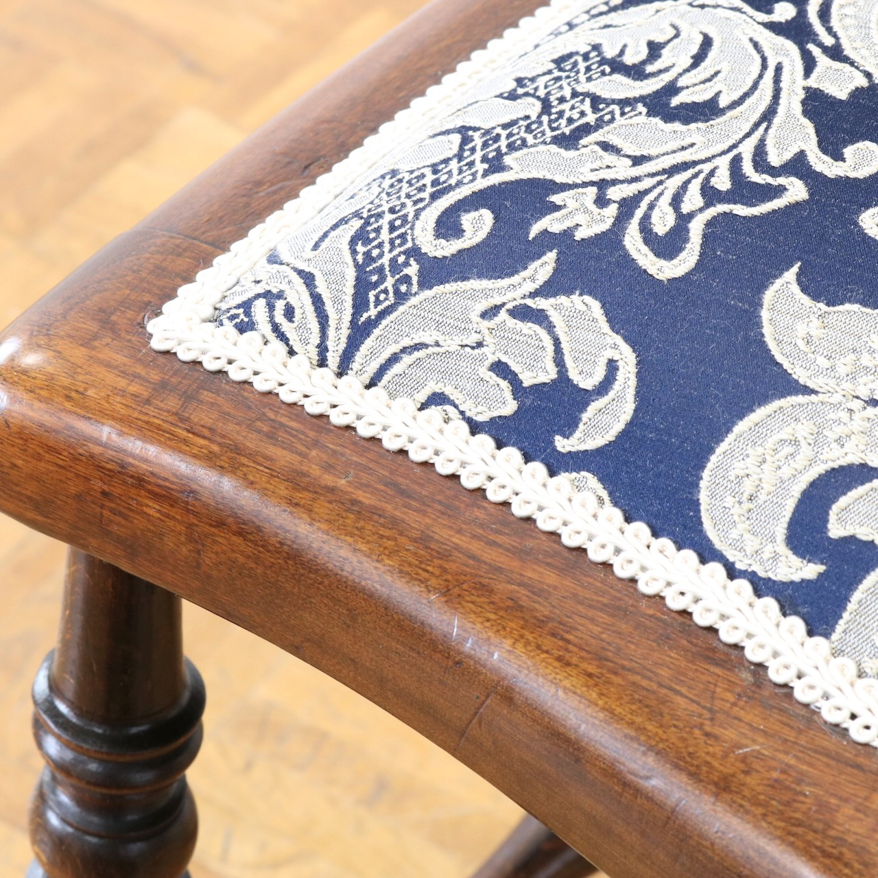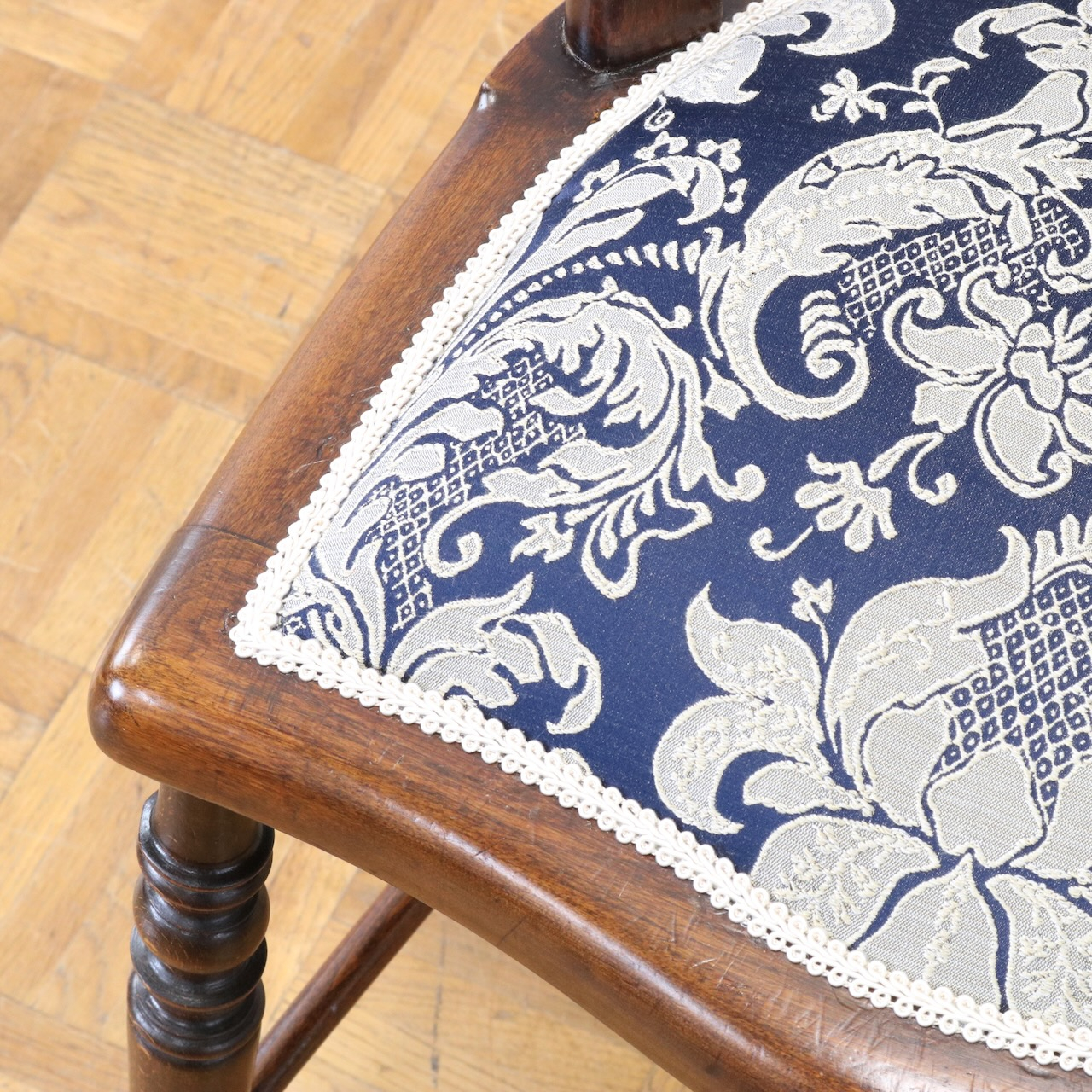 生地はクラシックなダマスク柄で張り替えました。濃い紺色のベースにダマスク柄が引き立ちます。