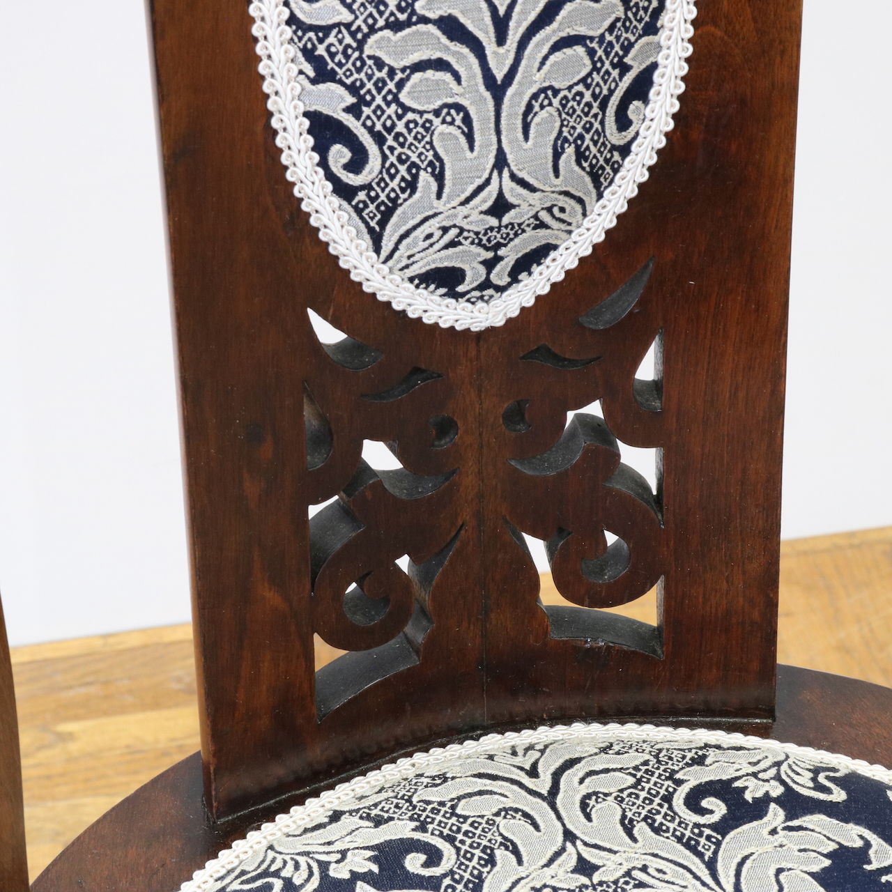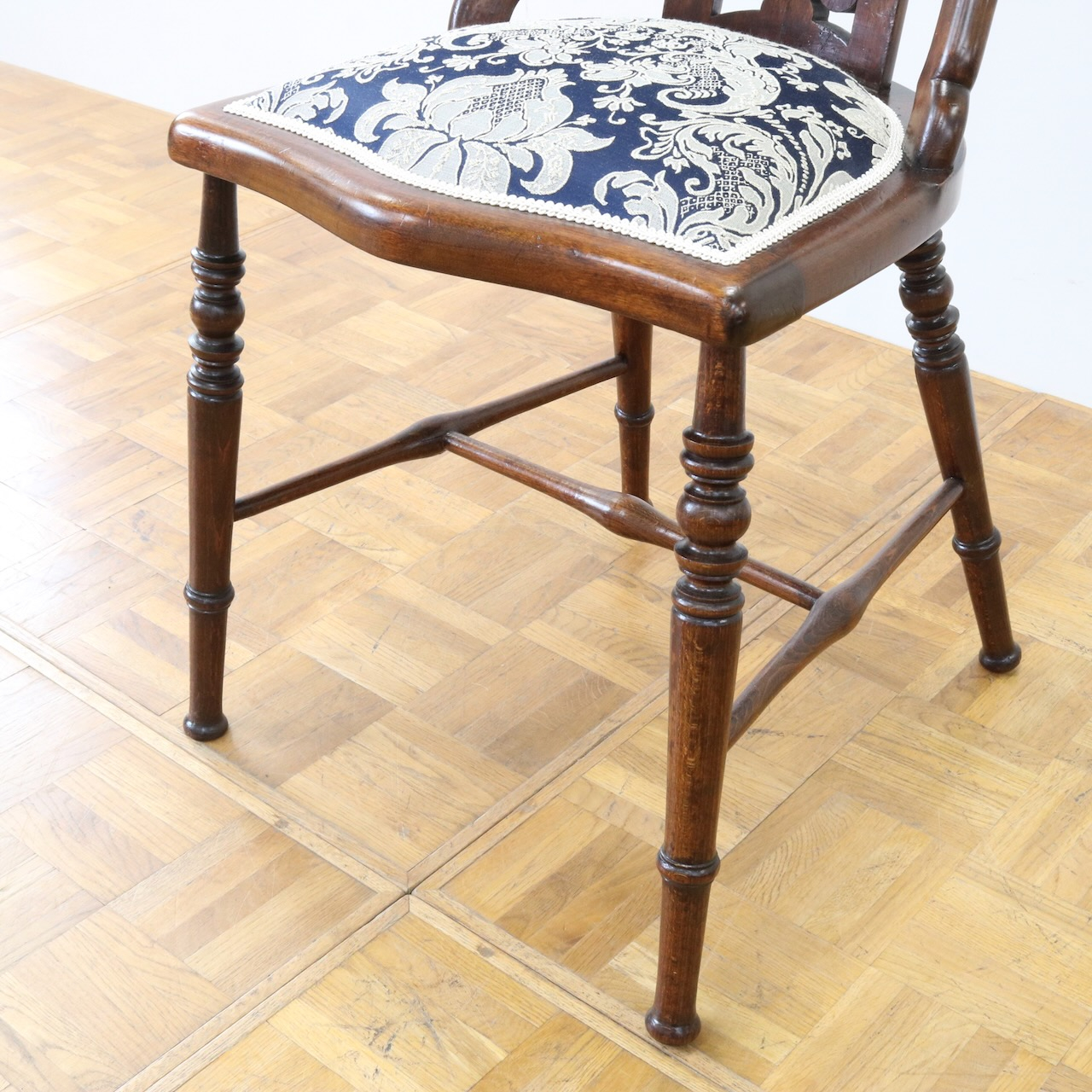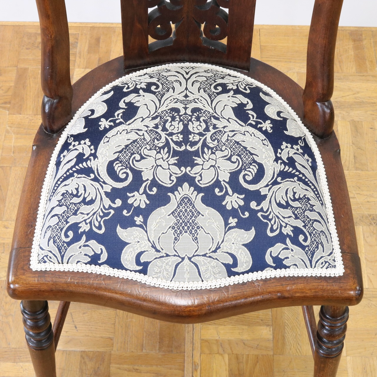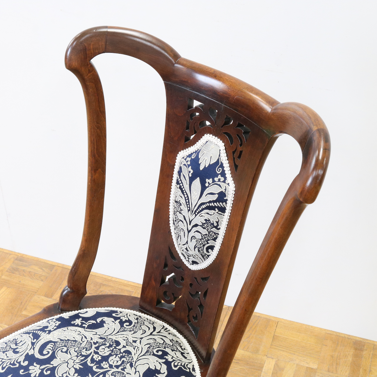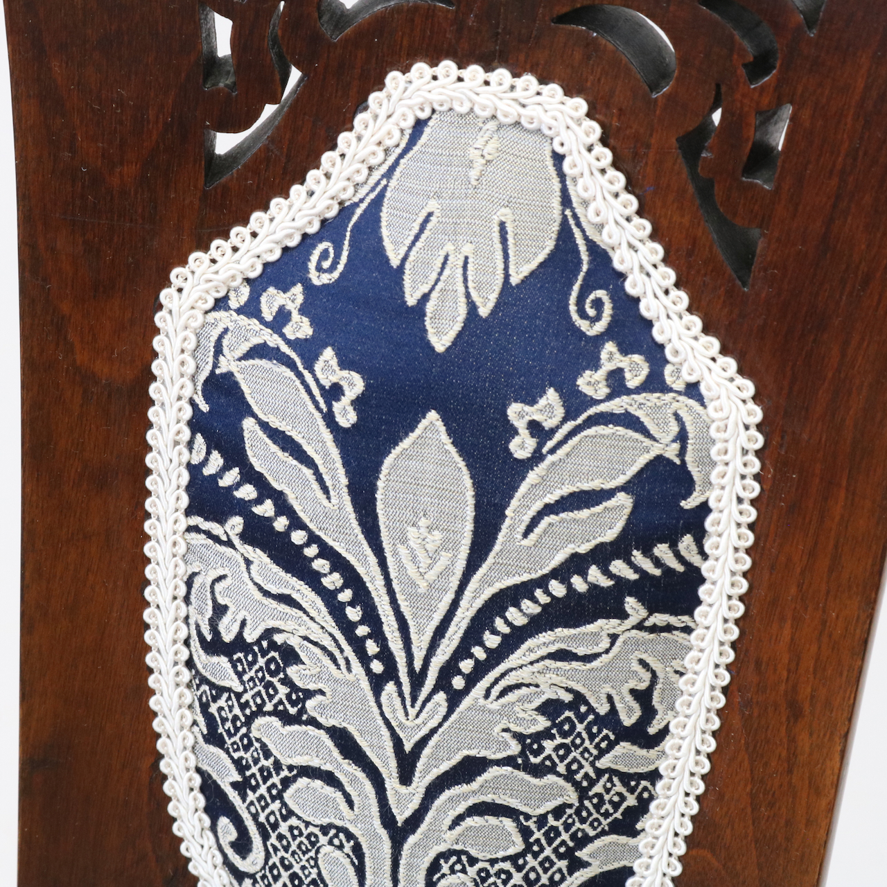 生地はクラシックなダマスク柄で張り替えました。濃い紺色のベースにダマスク柄が引き立ちます。