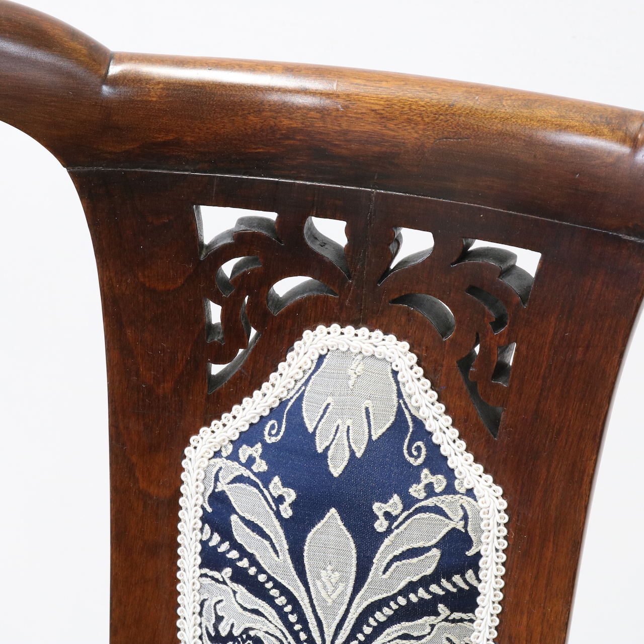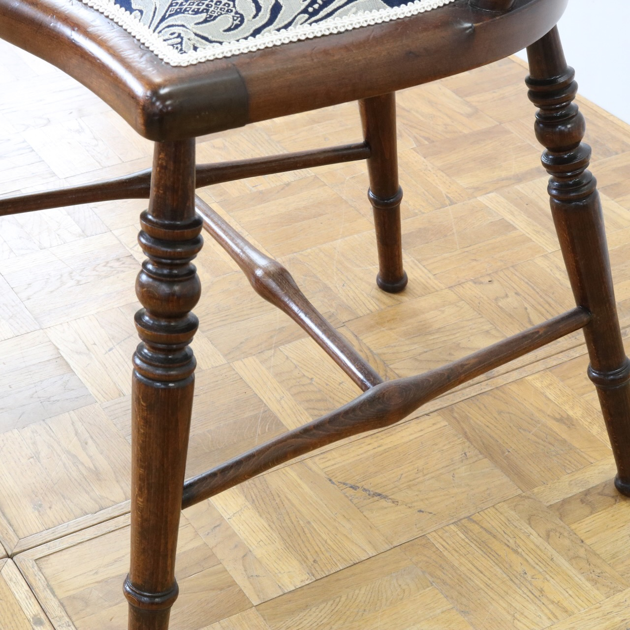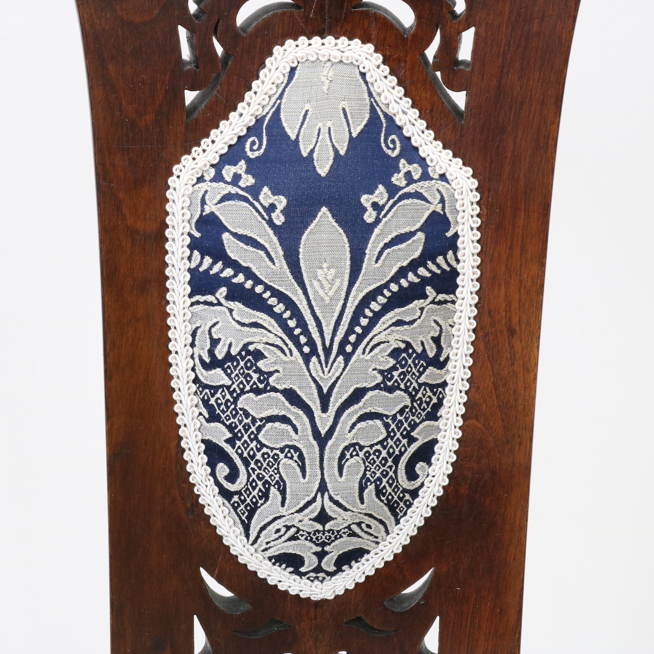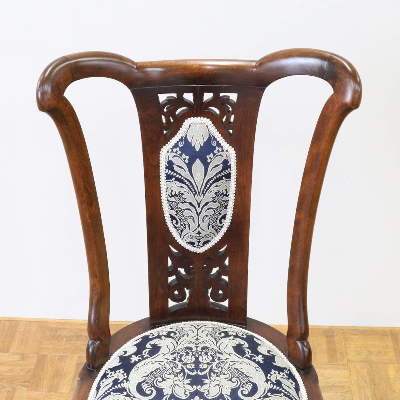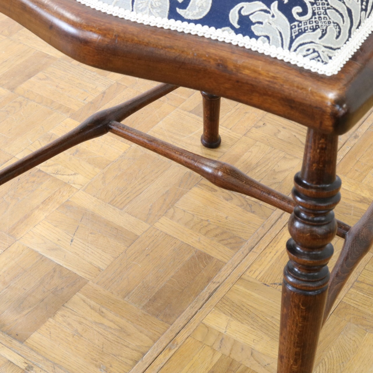 生地はクラシックなダマスク柄で張り替えました。濃い紺色のベースにダマスク柄が引き立ちます。