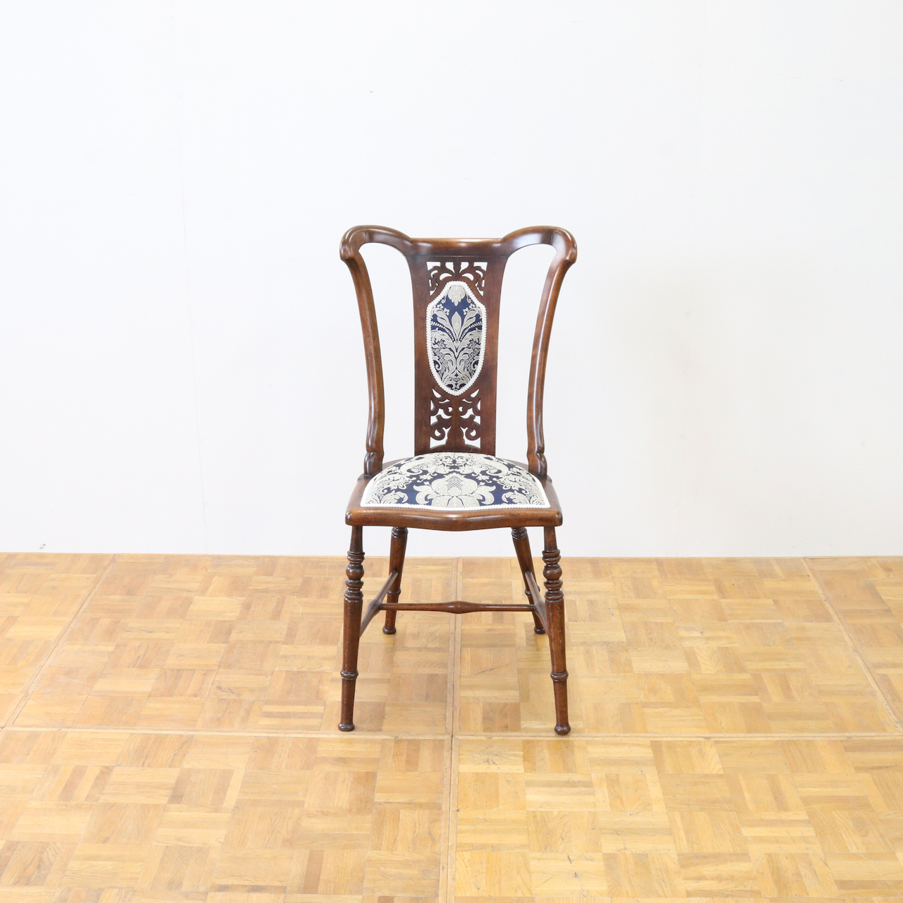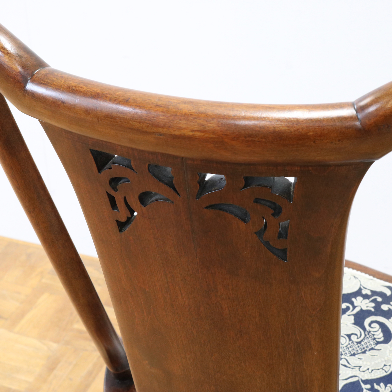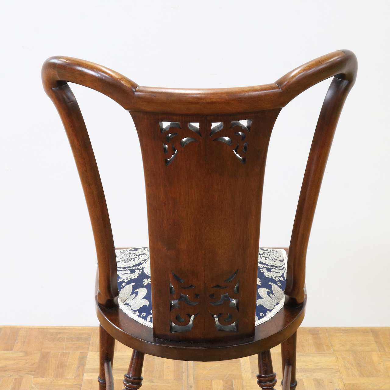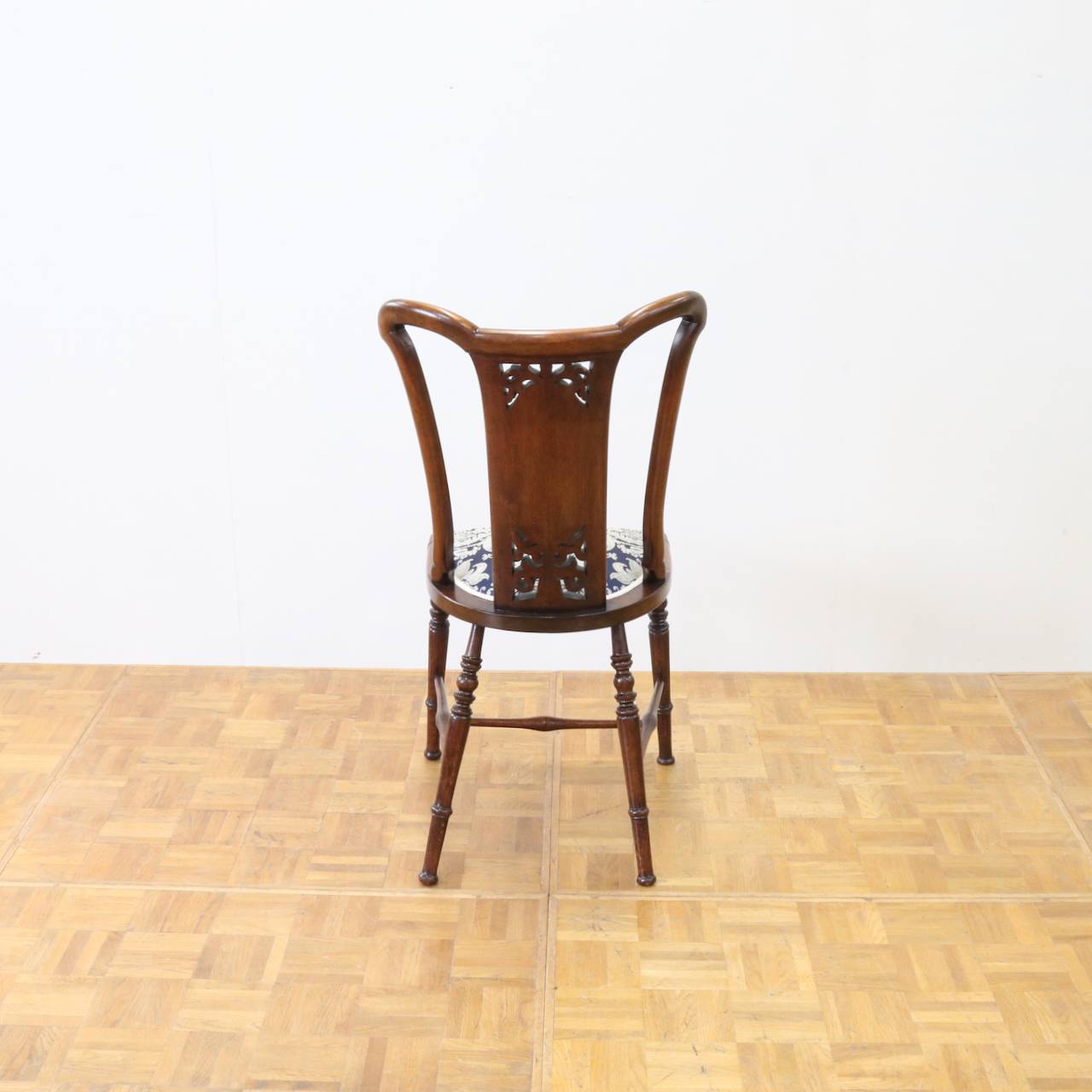 配送料の目安 ▶︎1910年代、ウォールナットのサイドチェアー。背の透かし彫刻や緩やかにカーブするトップが美しく目を引きます。エレガントで可愛らしさも感じられるチェアーです。