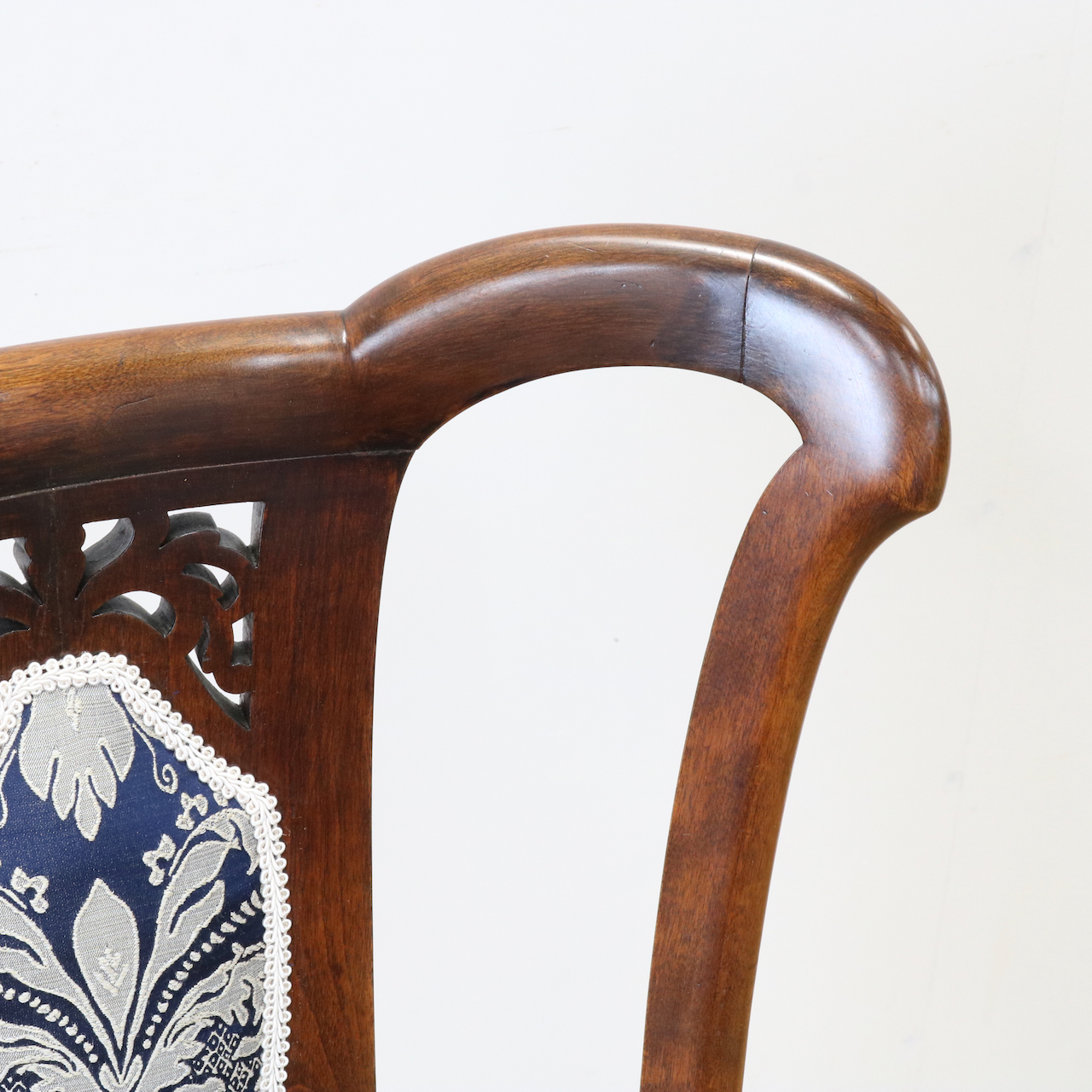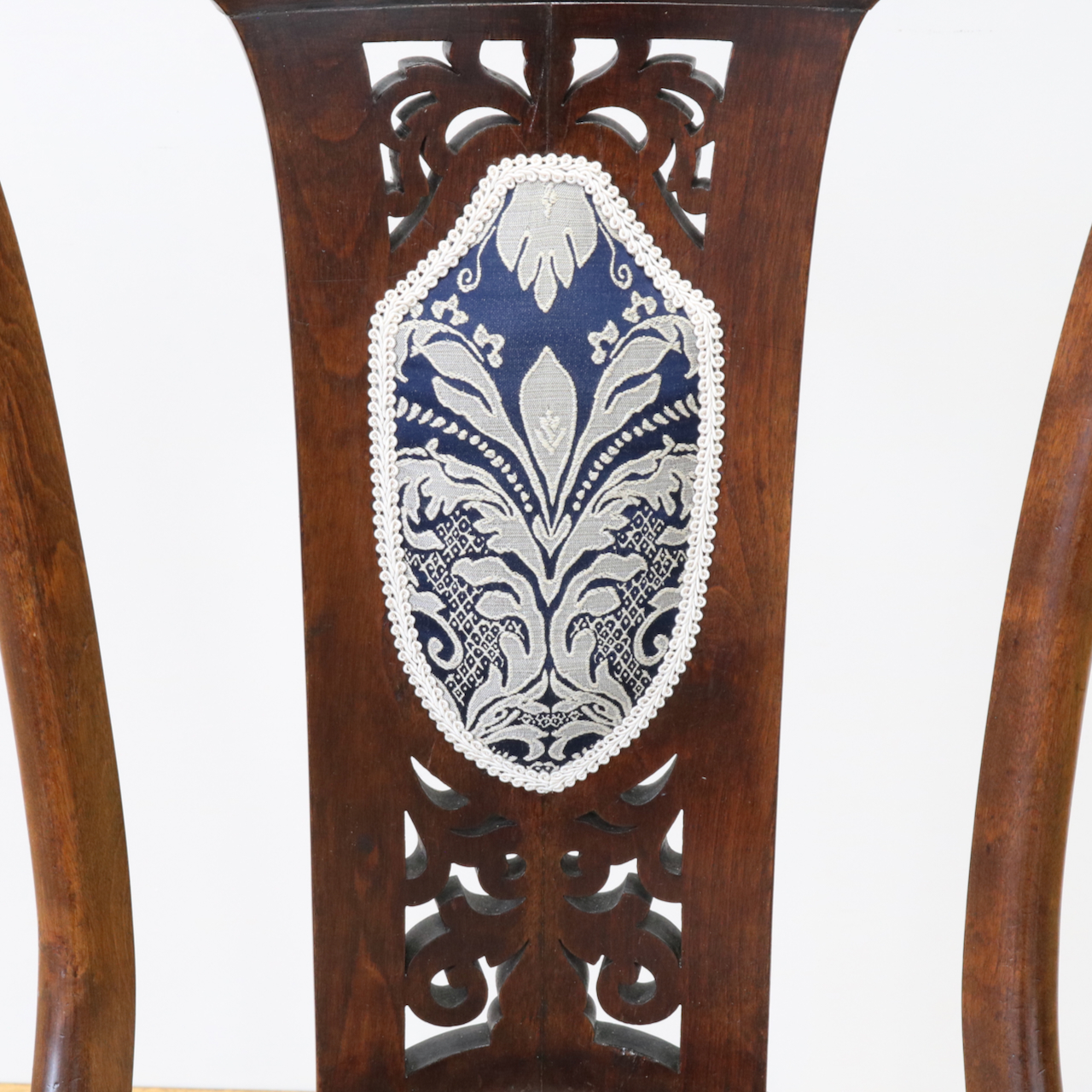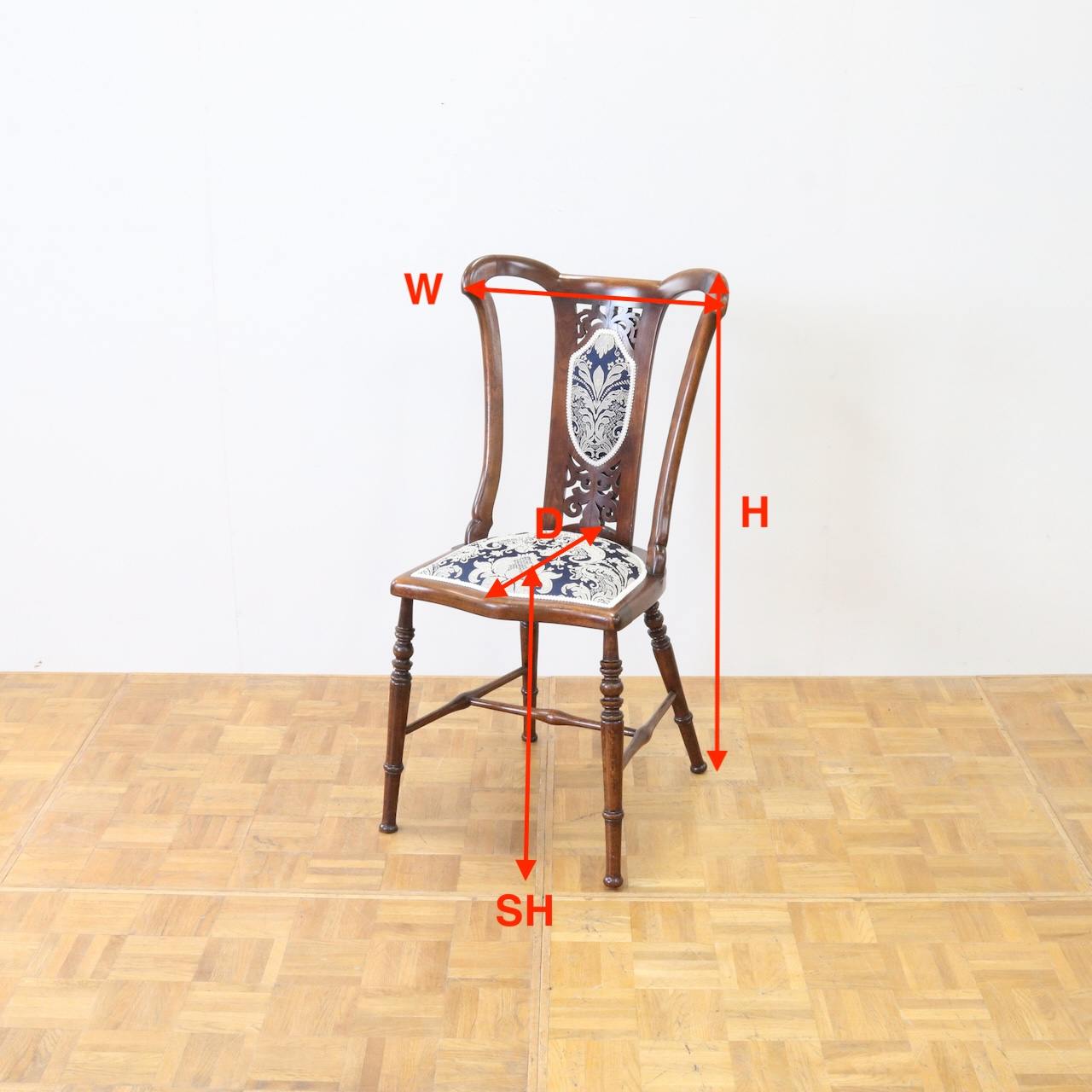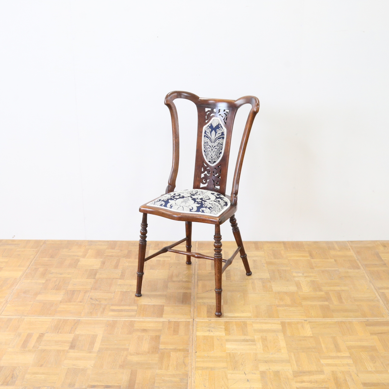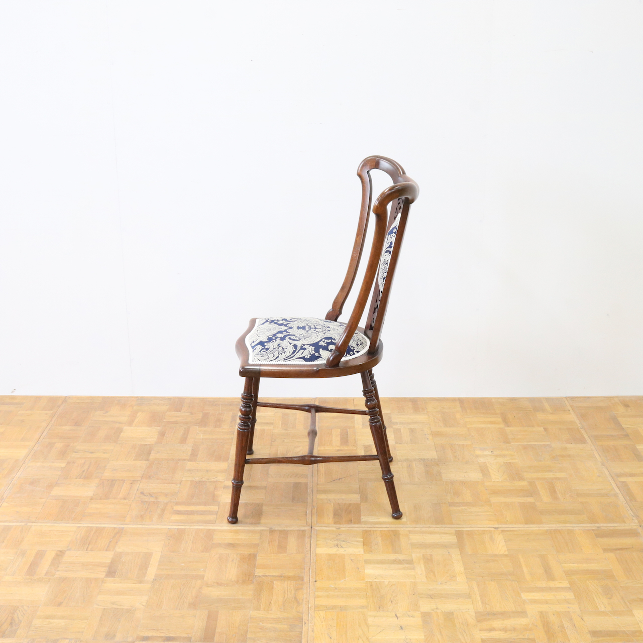 配送料の目安 ▶︎1910年代、ウォールナットのサイドチェアー。背の透かし彫刻や緩やかにカーブするトップが美しく目を引きます。エレガントで可愛らしさも感じられるチェアーです。