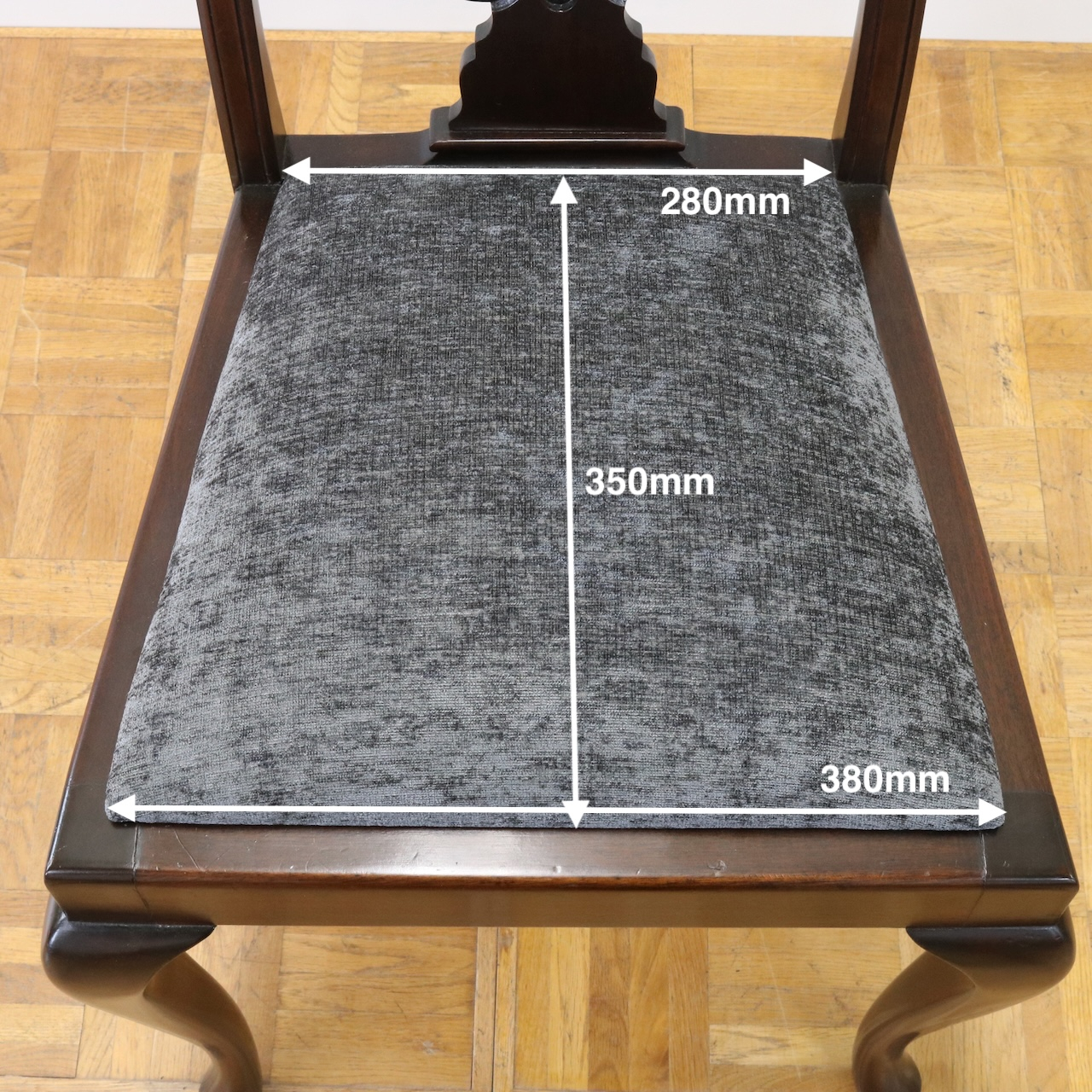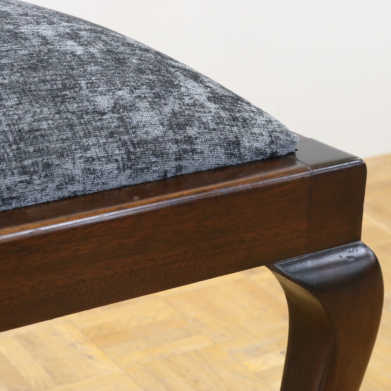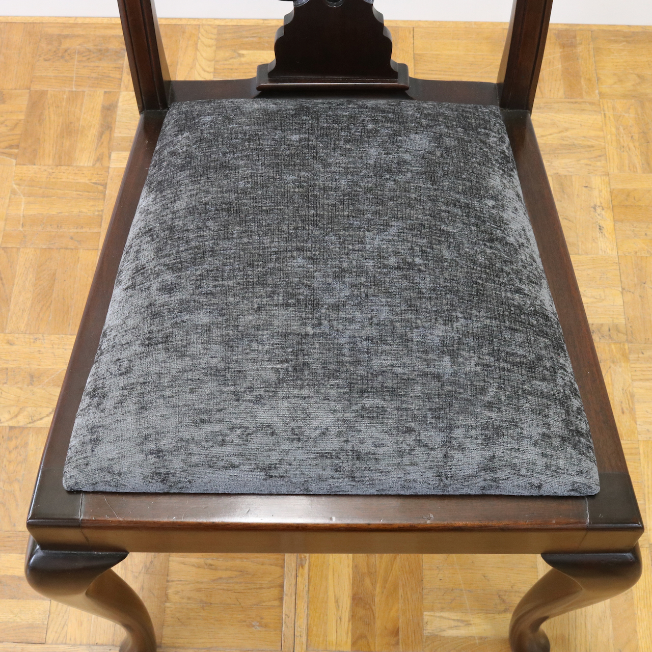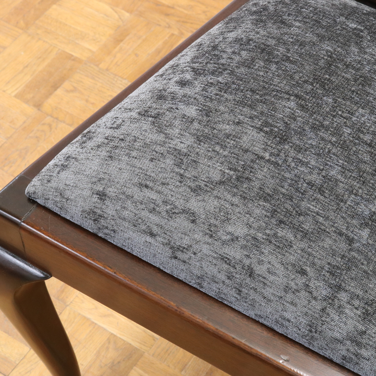 座面は落ち着いたグレーのモケット生地で張り替えました。