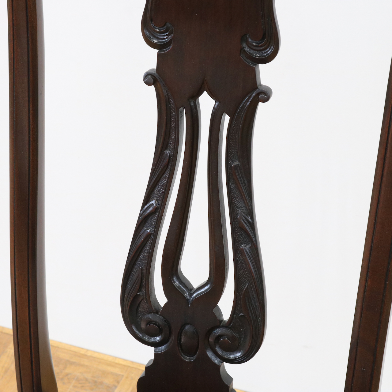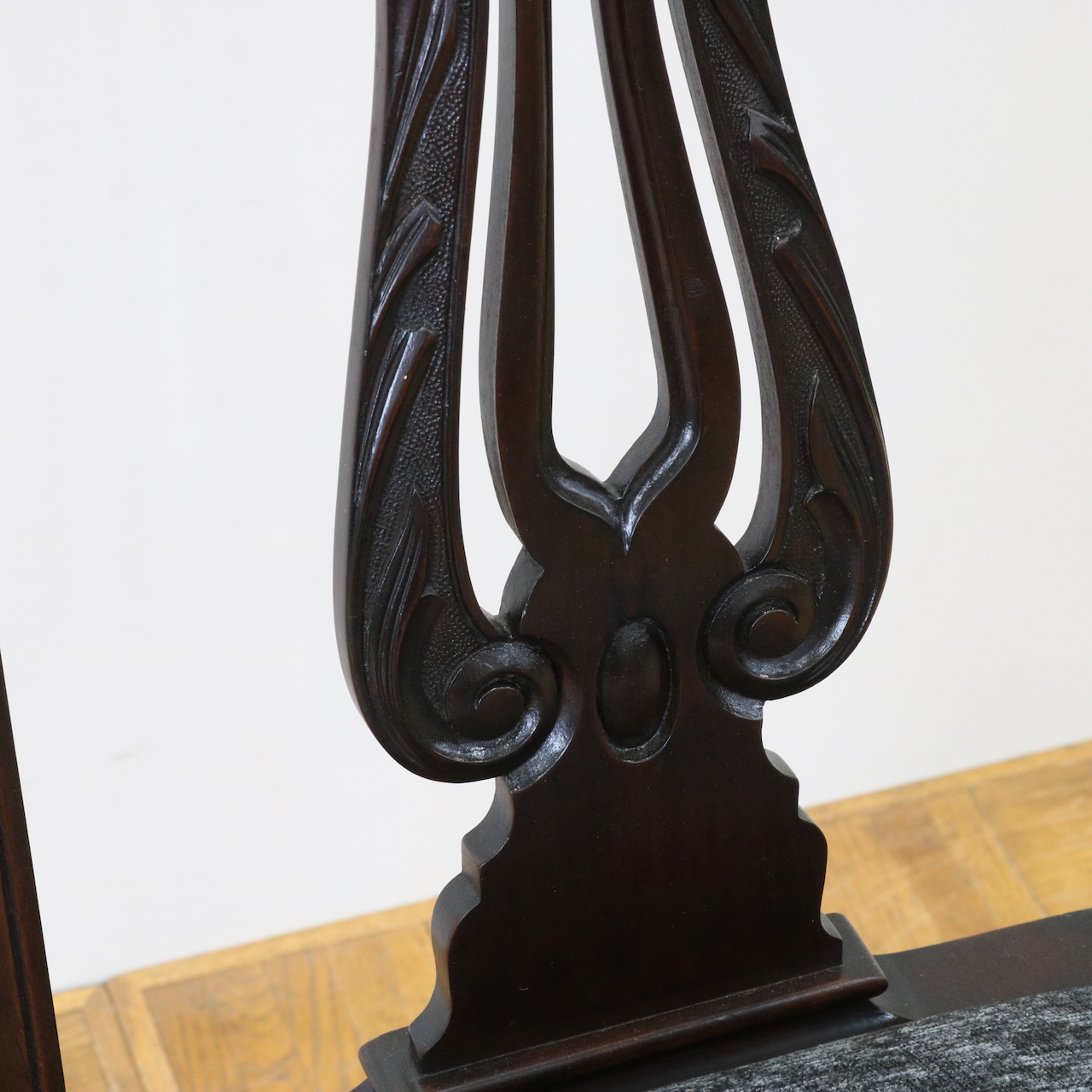 背もたれは全体に華奢で控えめな印象ながらもアカンサスの葉などクラシックなモチーフで飾られています。