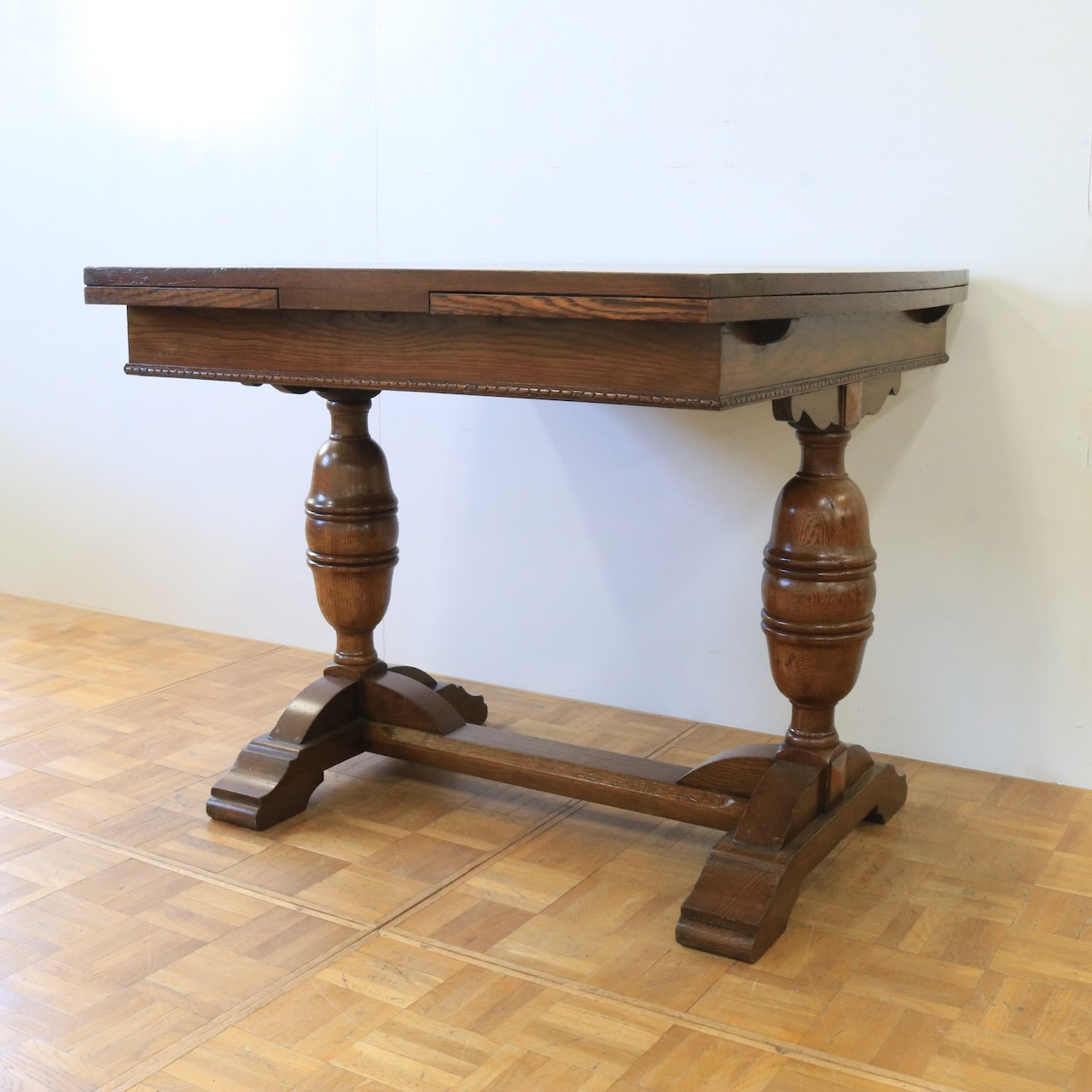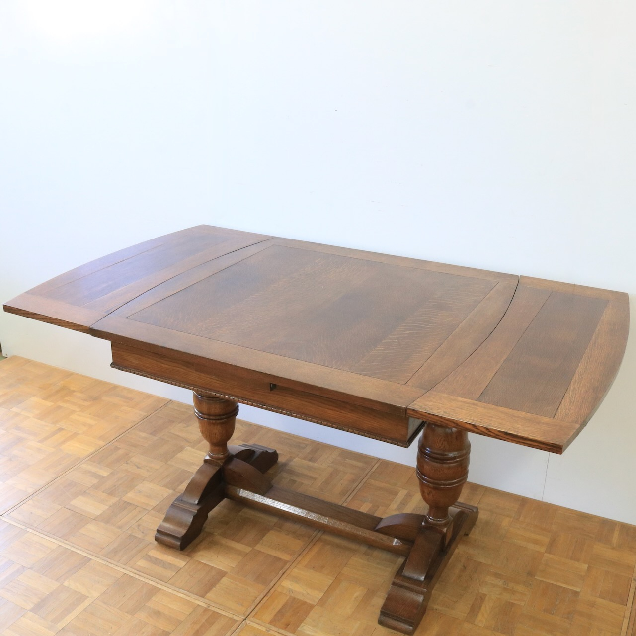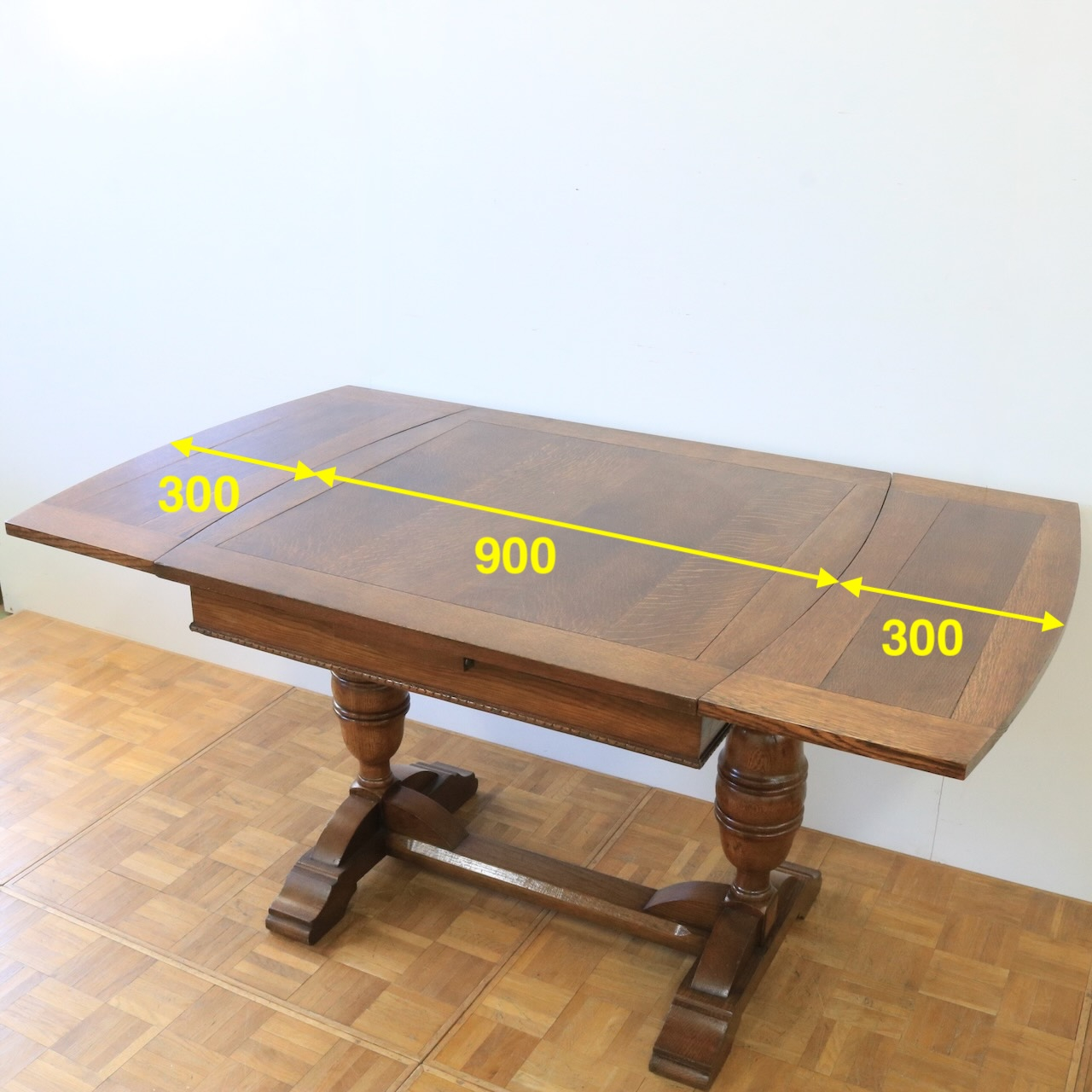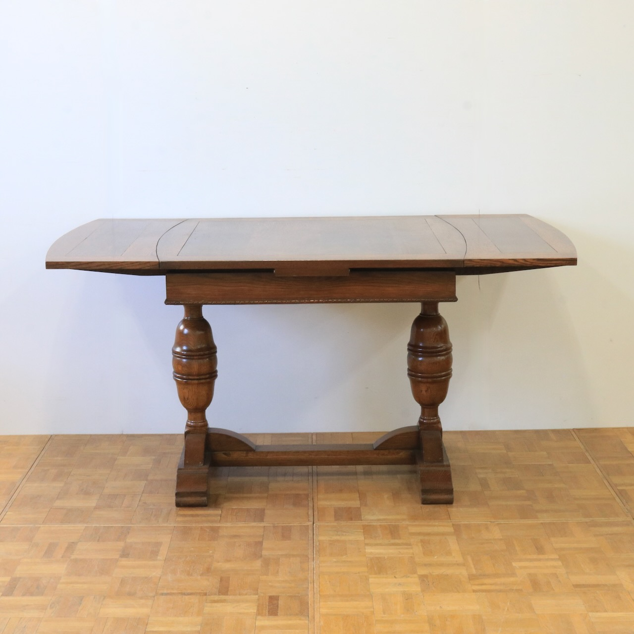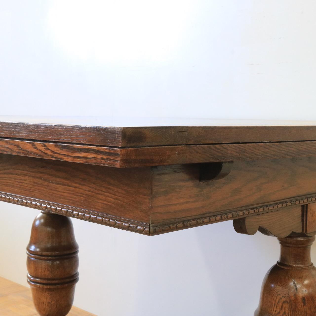 1930年代、オーク材のドローリーフテーブル。両サイドのリーフを伸び縮みさせて大きさを調節できる便利なダイニング用テーブルです。どんぐりのような丸く膨らんだ脚のデザインが特徴的。