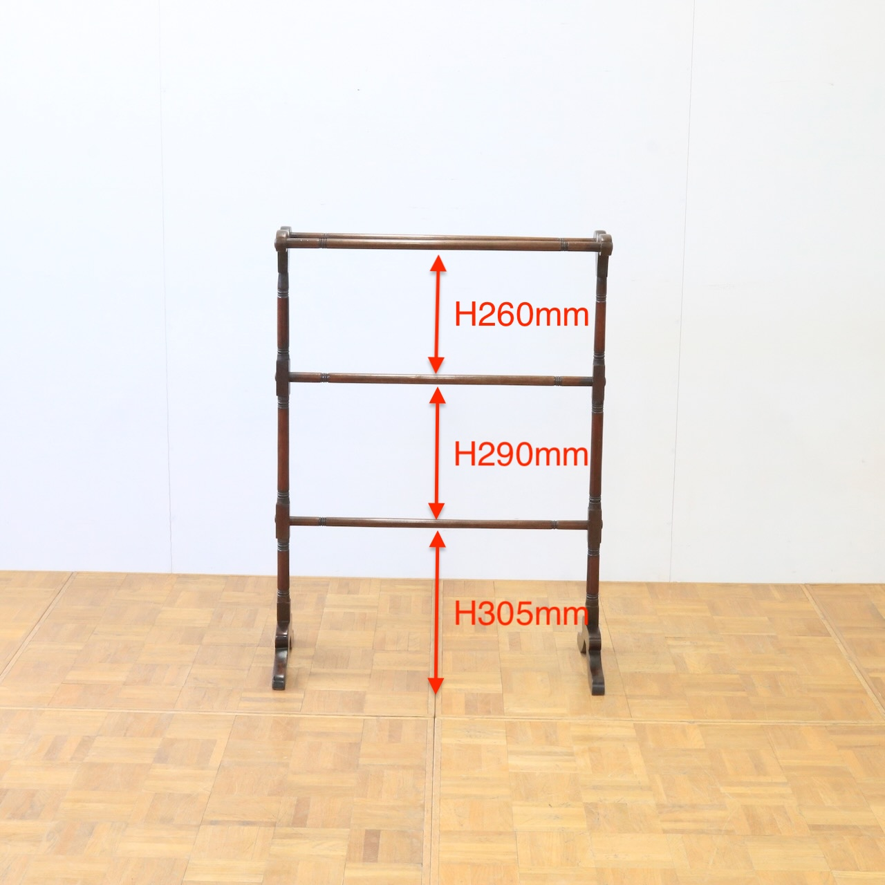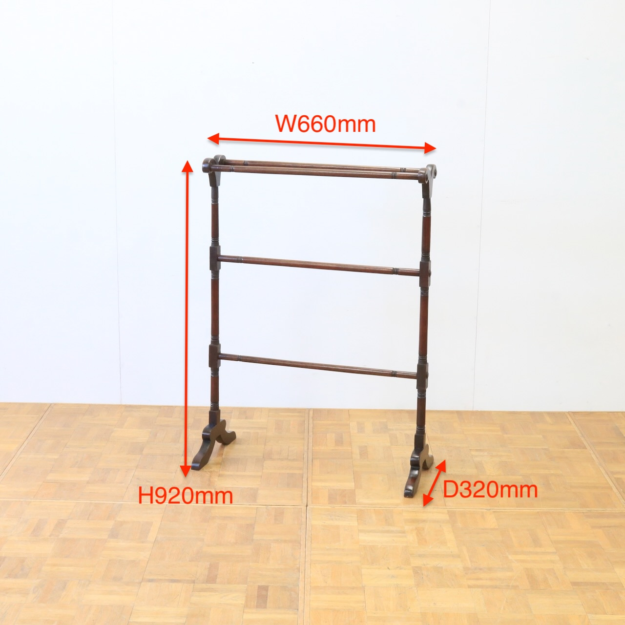 1880年代、マホガニー材のタオルホース。飾りを抑えたシンプルなデザインだからこそ、ヴィクトリアン期の家具ならではの木材の質の良さや洗練された佇まいが際立ちます。