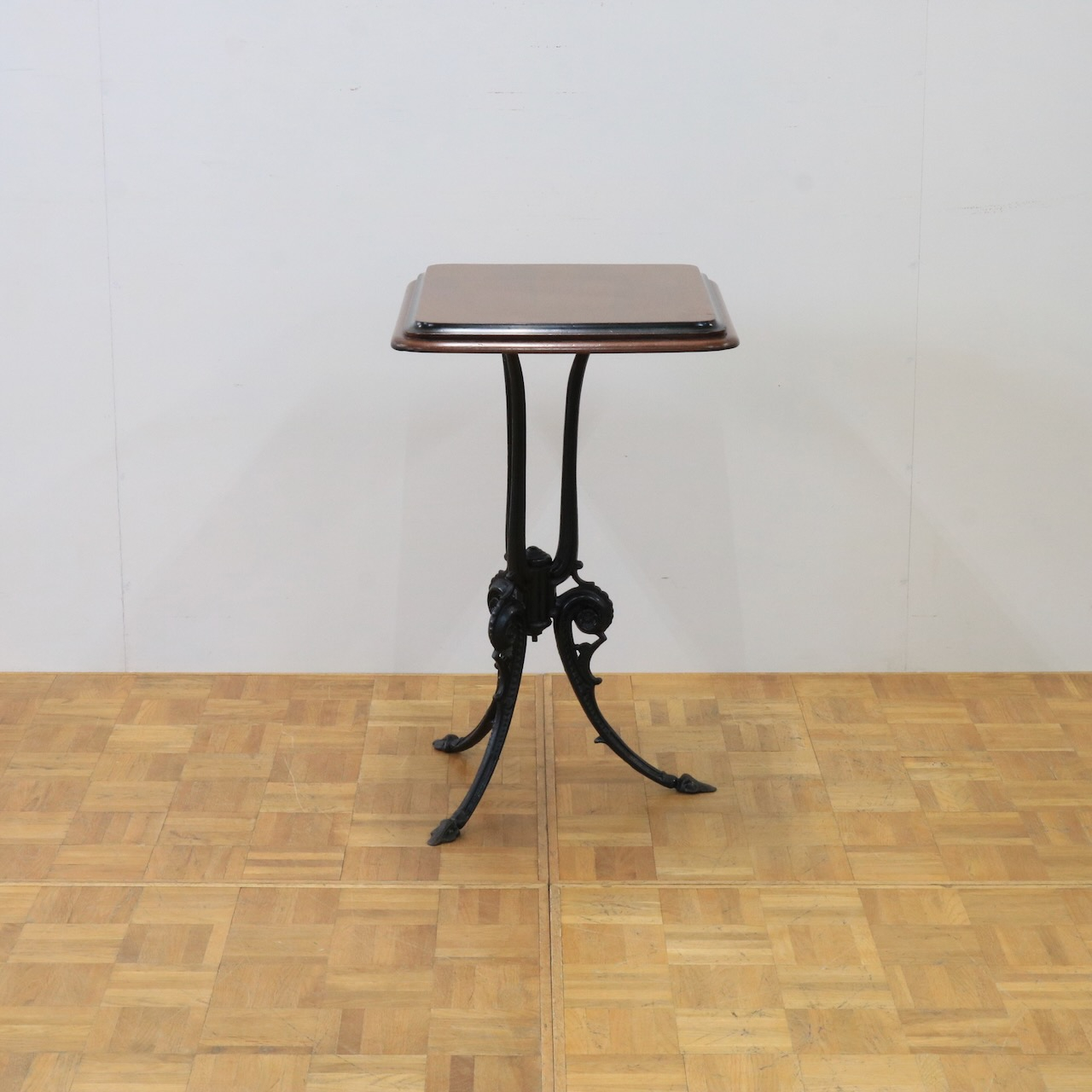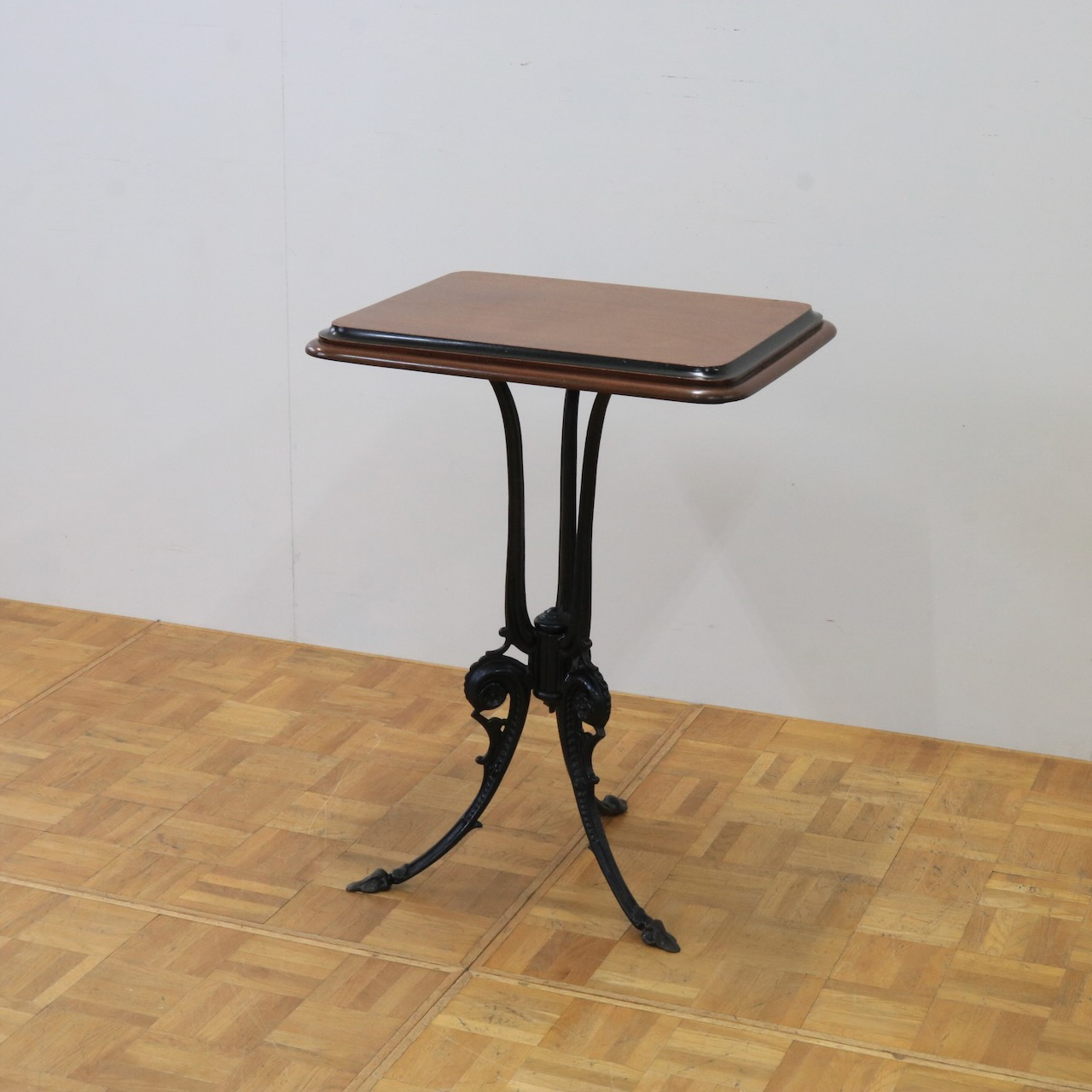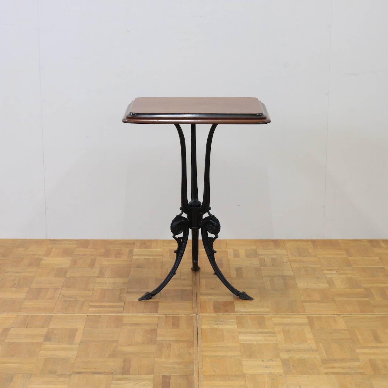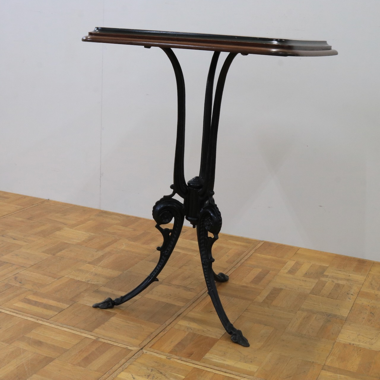 配送料の目安 ▶︎1910年代、マホガニー材のパブテーブル。アイアン製の脚はスクロールした植物紋様のようなデザインになっています。お天気のいい日にはお庭でティータイムを楽しむのもいいですね。