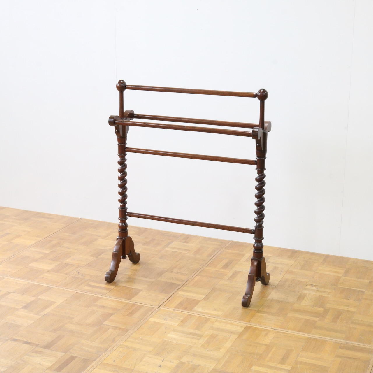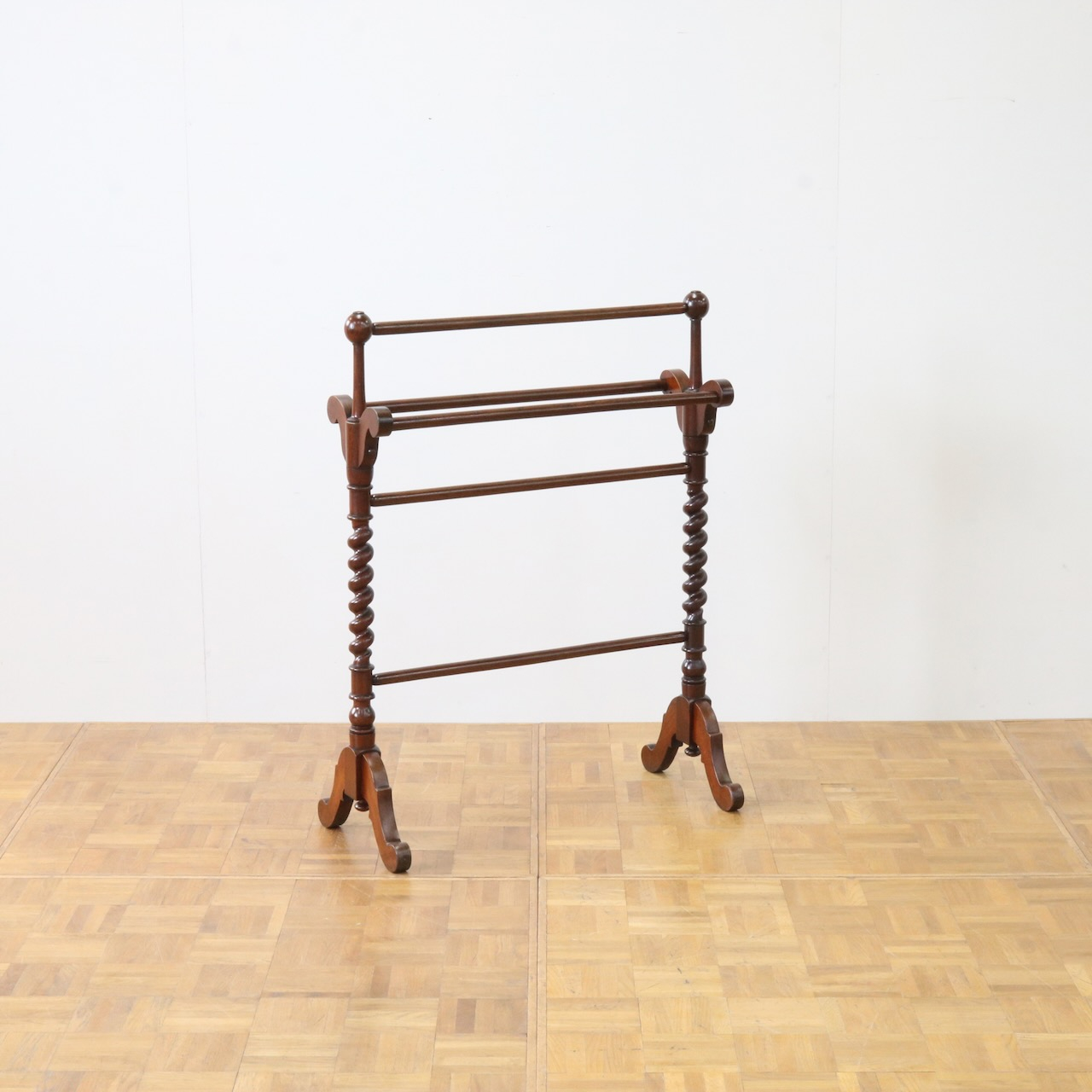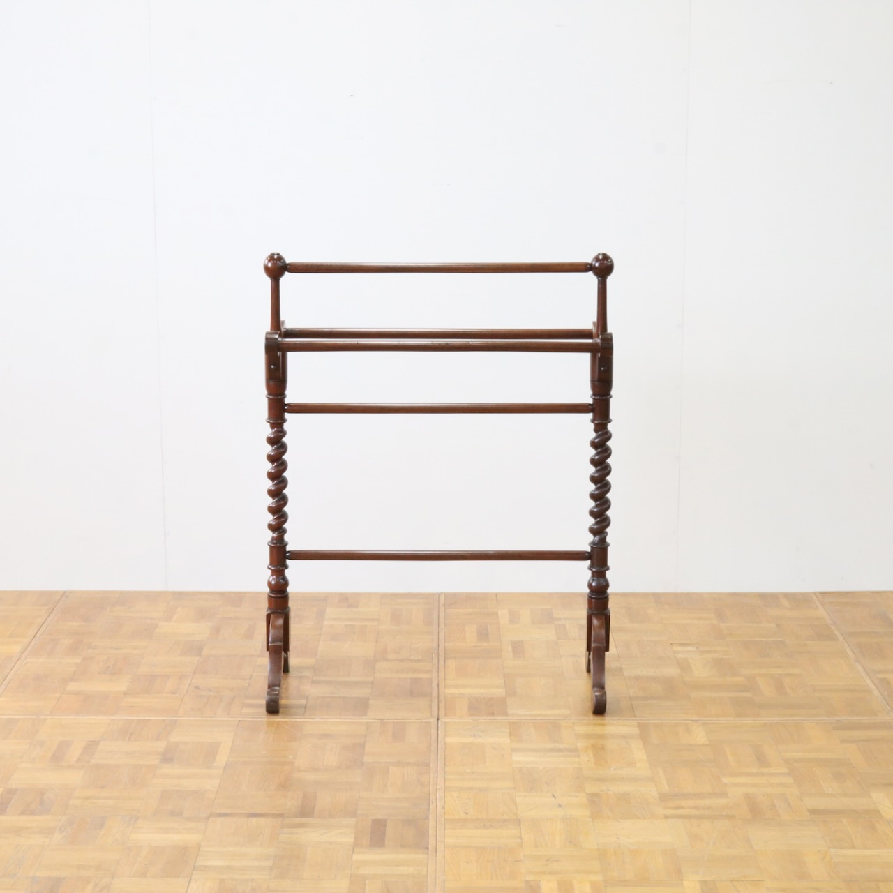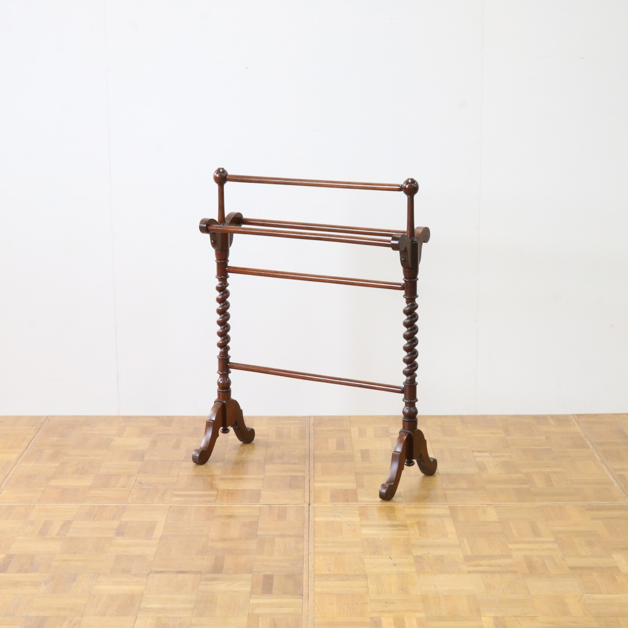 1880年代ヴィクトリアン、マホガニー材のタオルホース。はっきりと捻れたツイストレッグがアクセントになった、アンティークらしい素朴さも感じられるアイテムです。レースや可愛い布を下げてインテリアを楽しんだり、ネクタイやスカーフを掛けておくのもおすすめです。