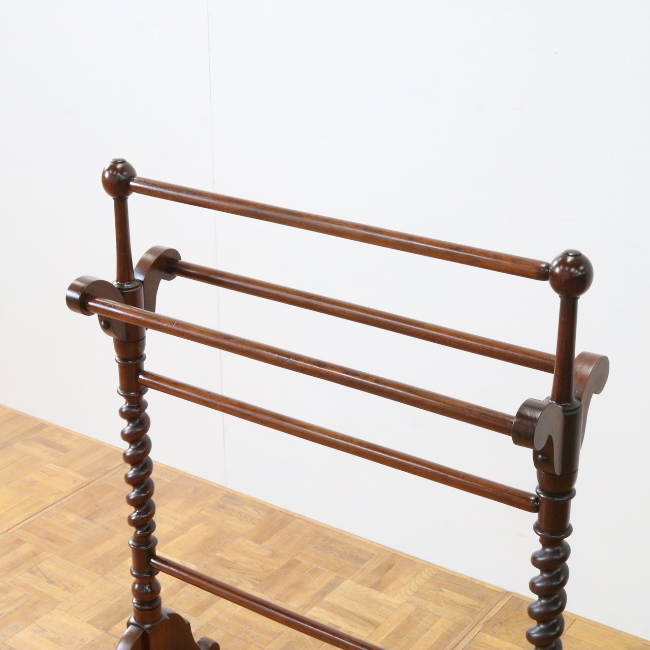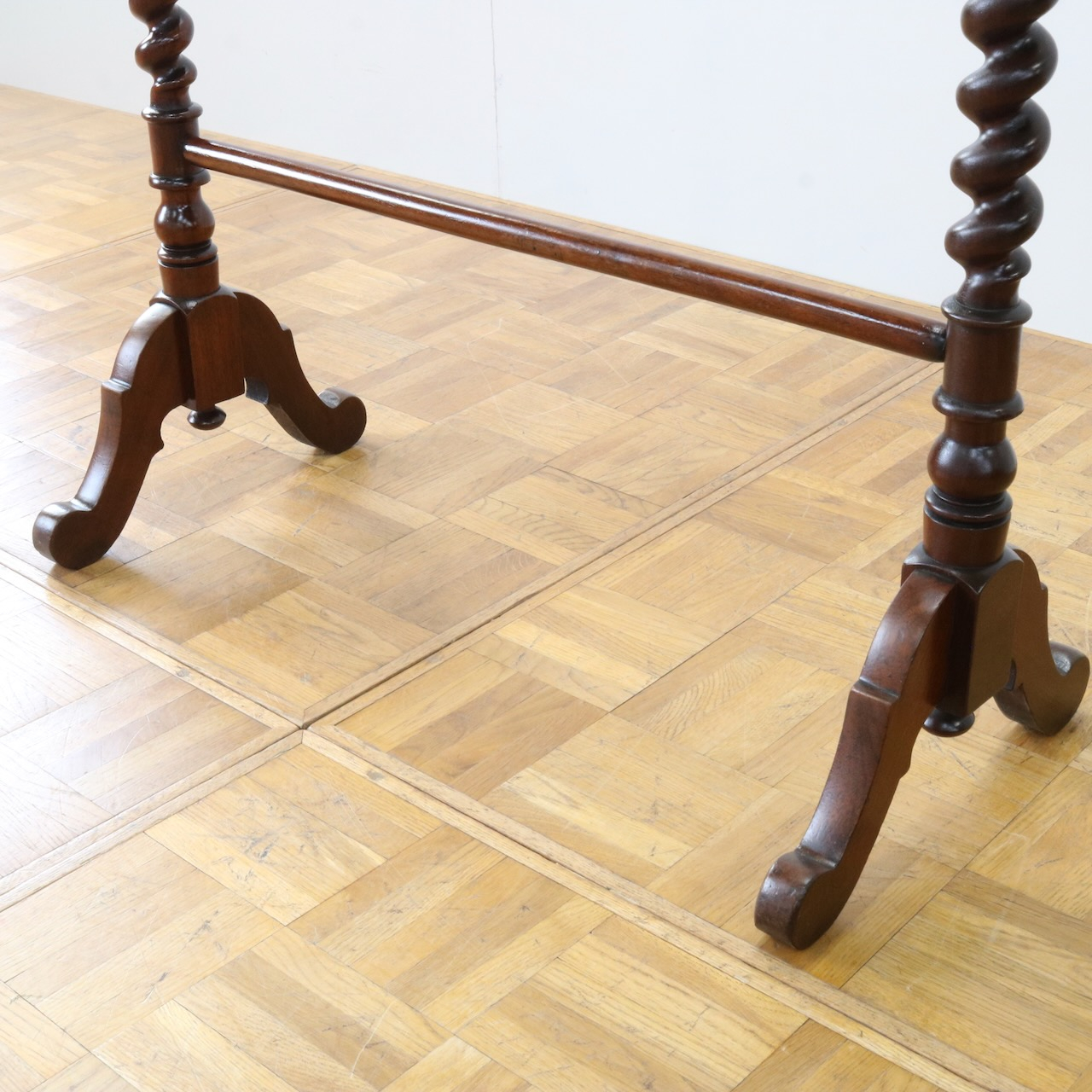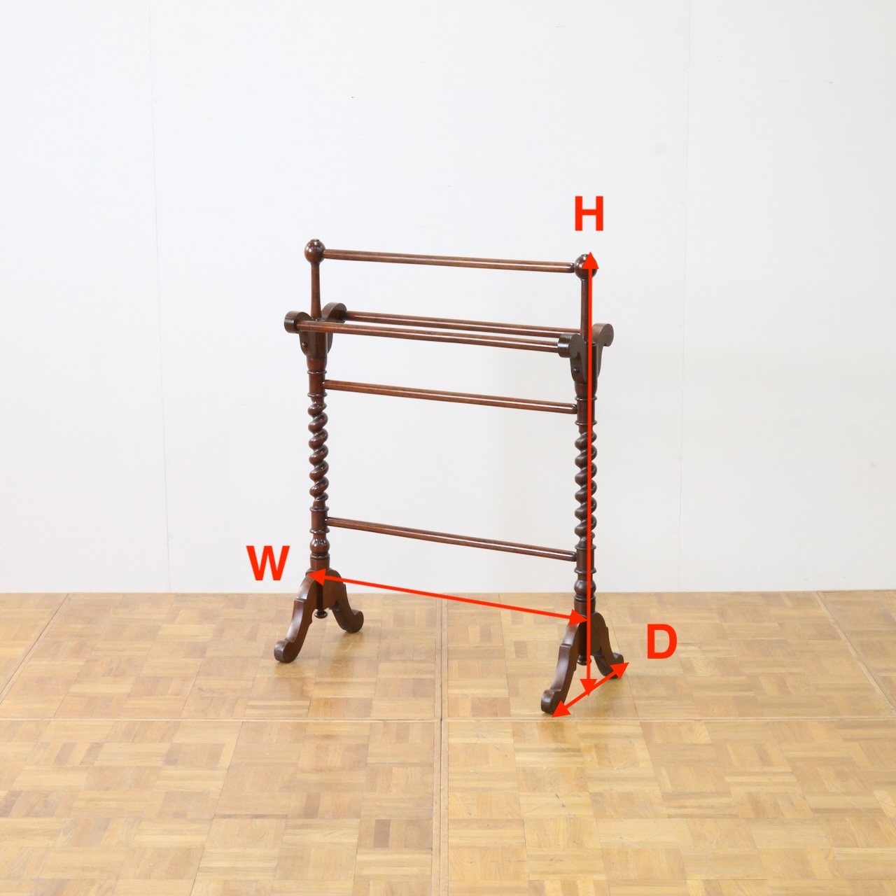 1880年代ヴィクトリアン、マホガニー材のタオルホース。はっきりと捻れたツイストレッグがアクセントになった、アンティークらしい素朴さも感じられるアイテムです。レースや可愛い布を下げてインテリアを楽しんだり、ネクタイやスカーフを掛けておくのもおすすめです。