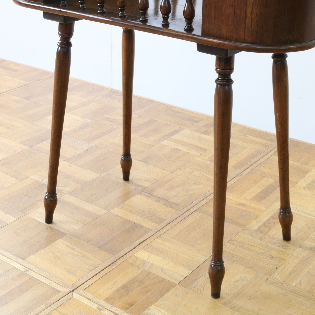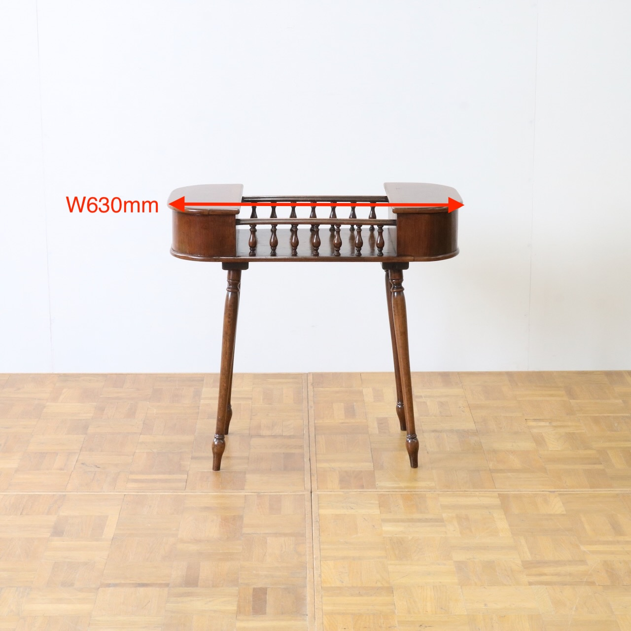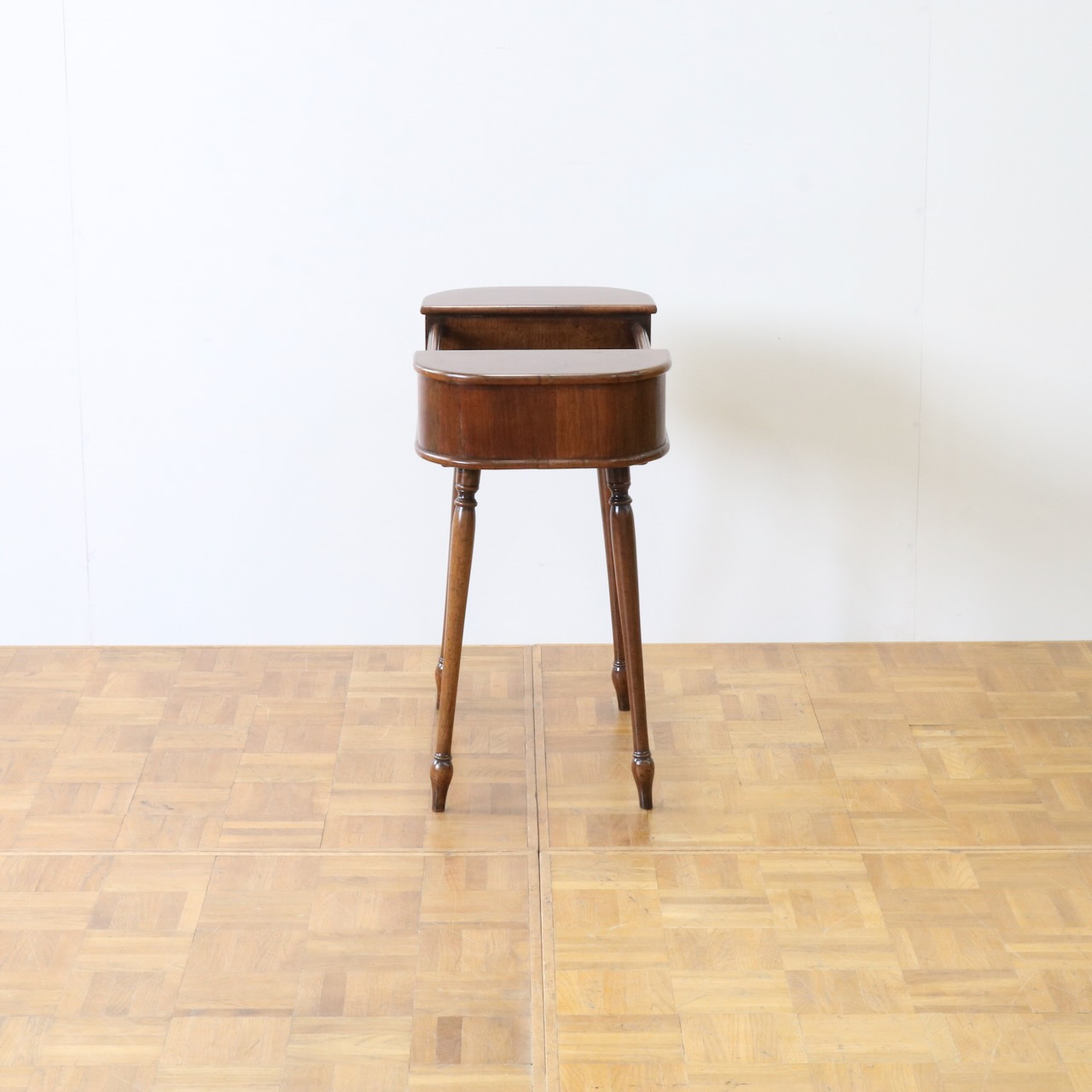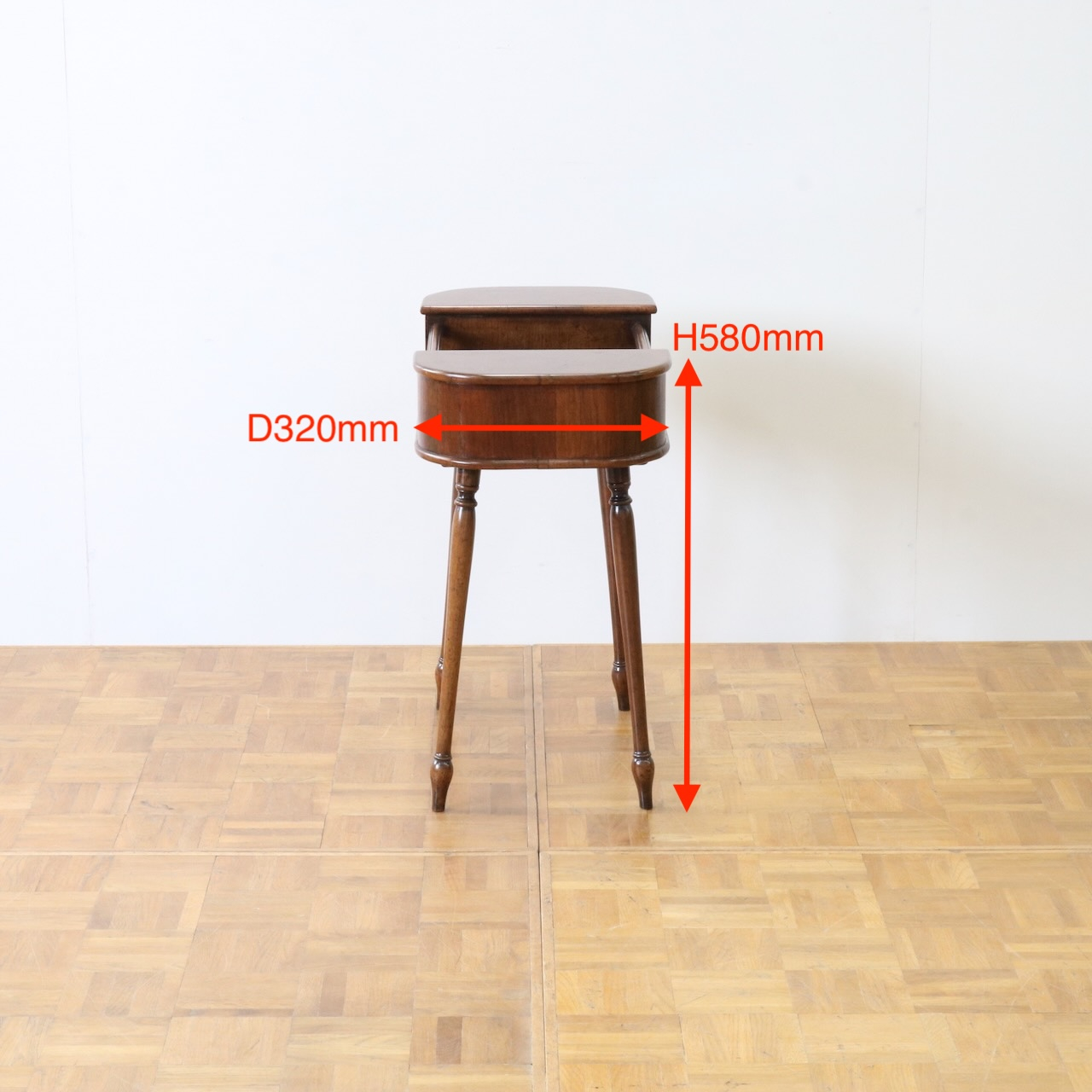 配送料の目安 ▶︎ウォールナット材のサイドテーブル。小ぶりな楕円型で、両サイドに小さな収納も付いています。中央のコラムのデザインやすっきりと伸びる脚がクラシックでスマートな印象です。