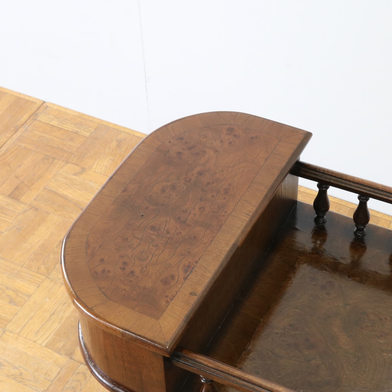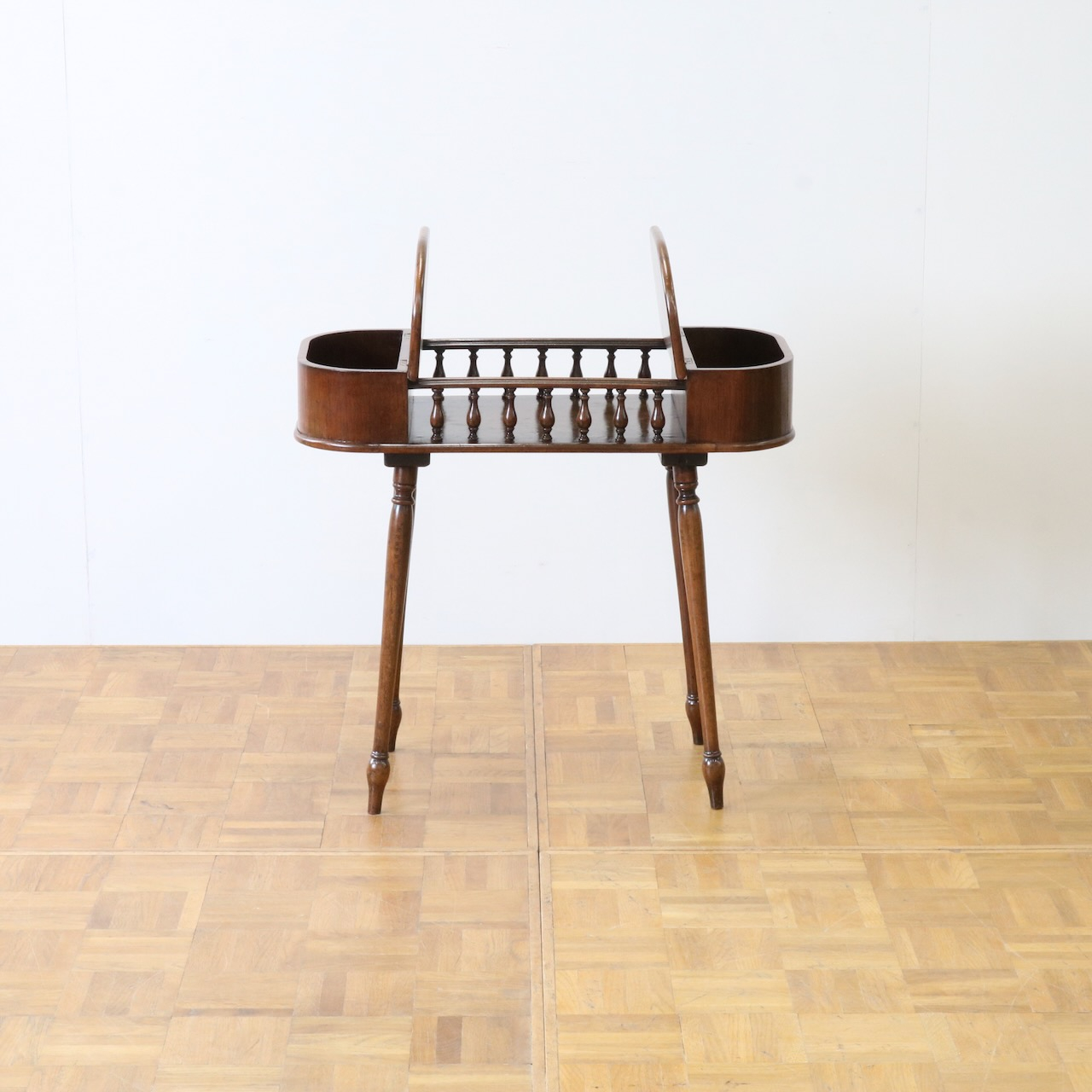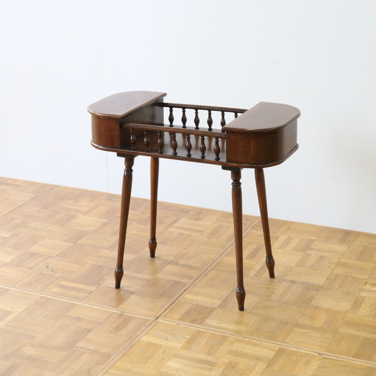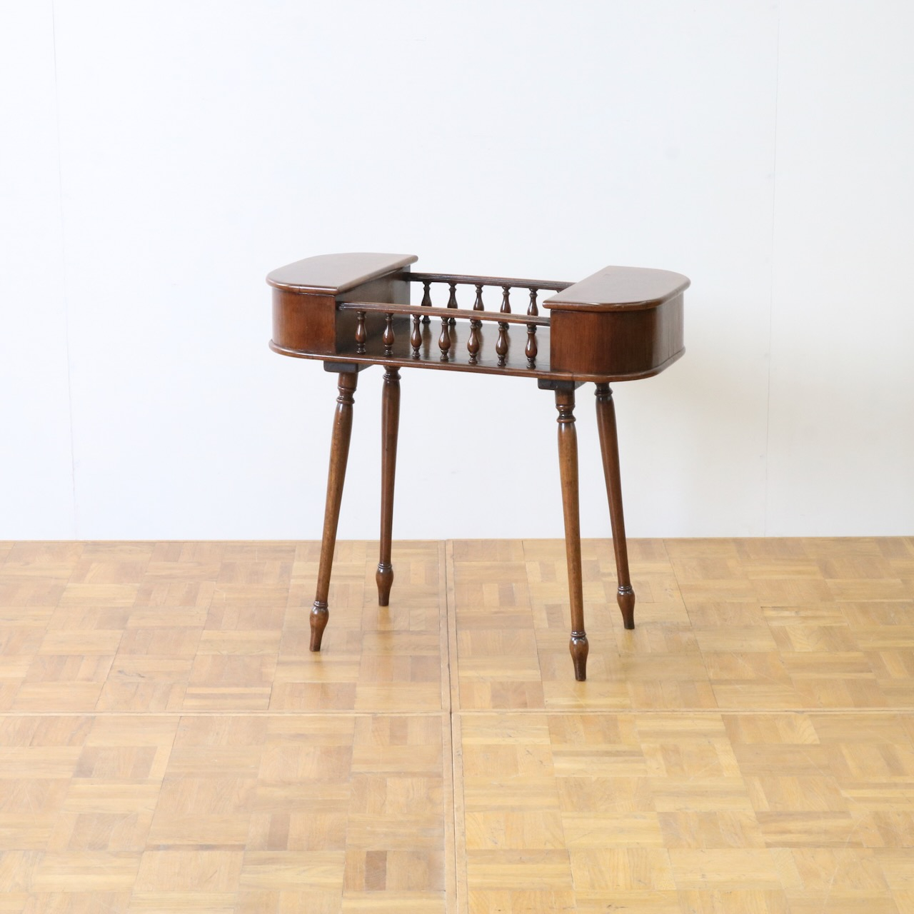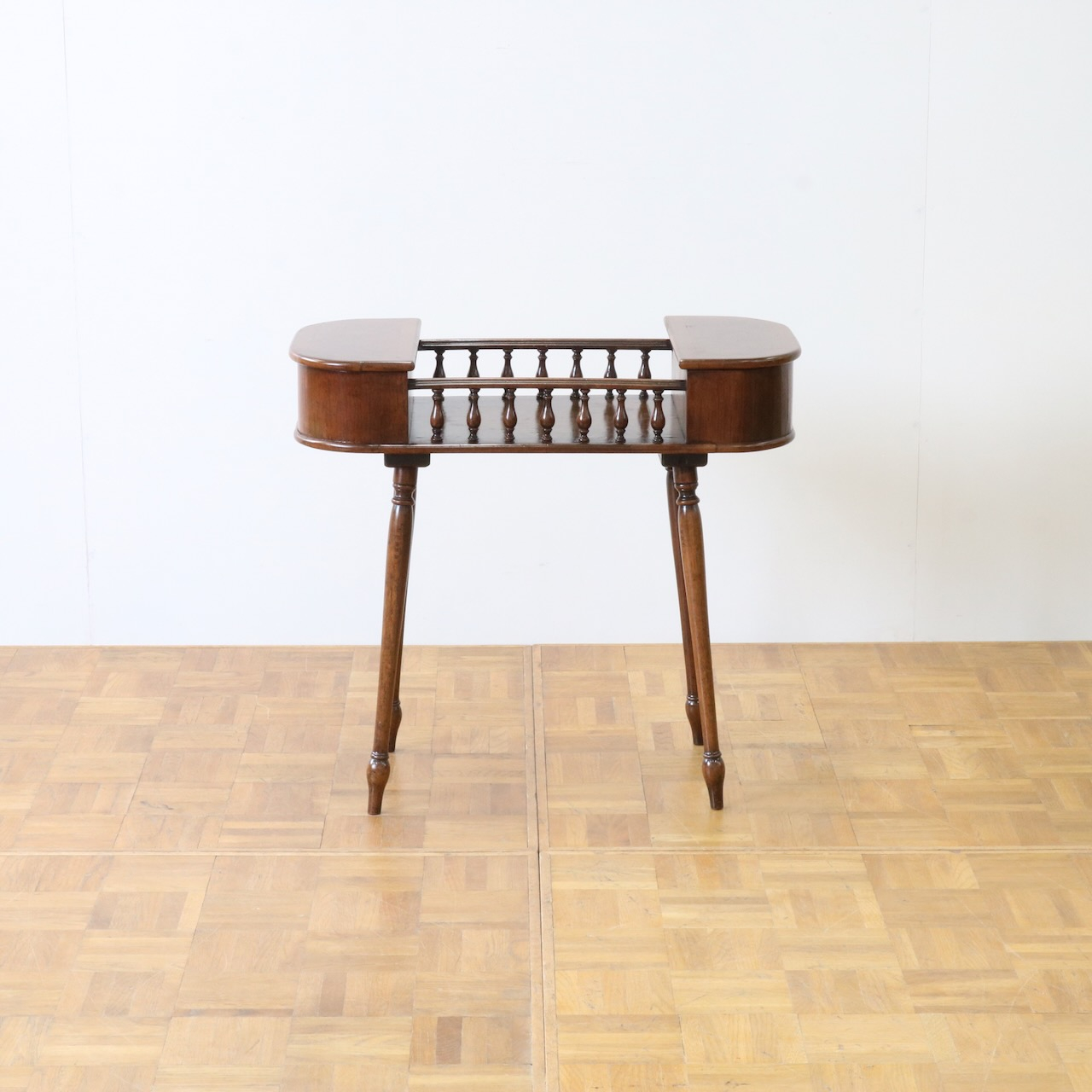 配送料の目安 ▶︎ウォールナット材のサイドテーブル。小ぶりな楕円型で、両サイドに小さな収納も付いています。中央のコラムのデザインやすっきりと伸びる脚がクラシックでスマートな印象です。