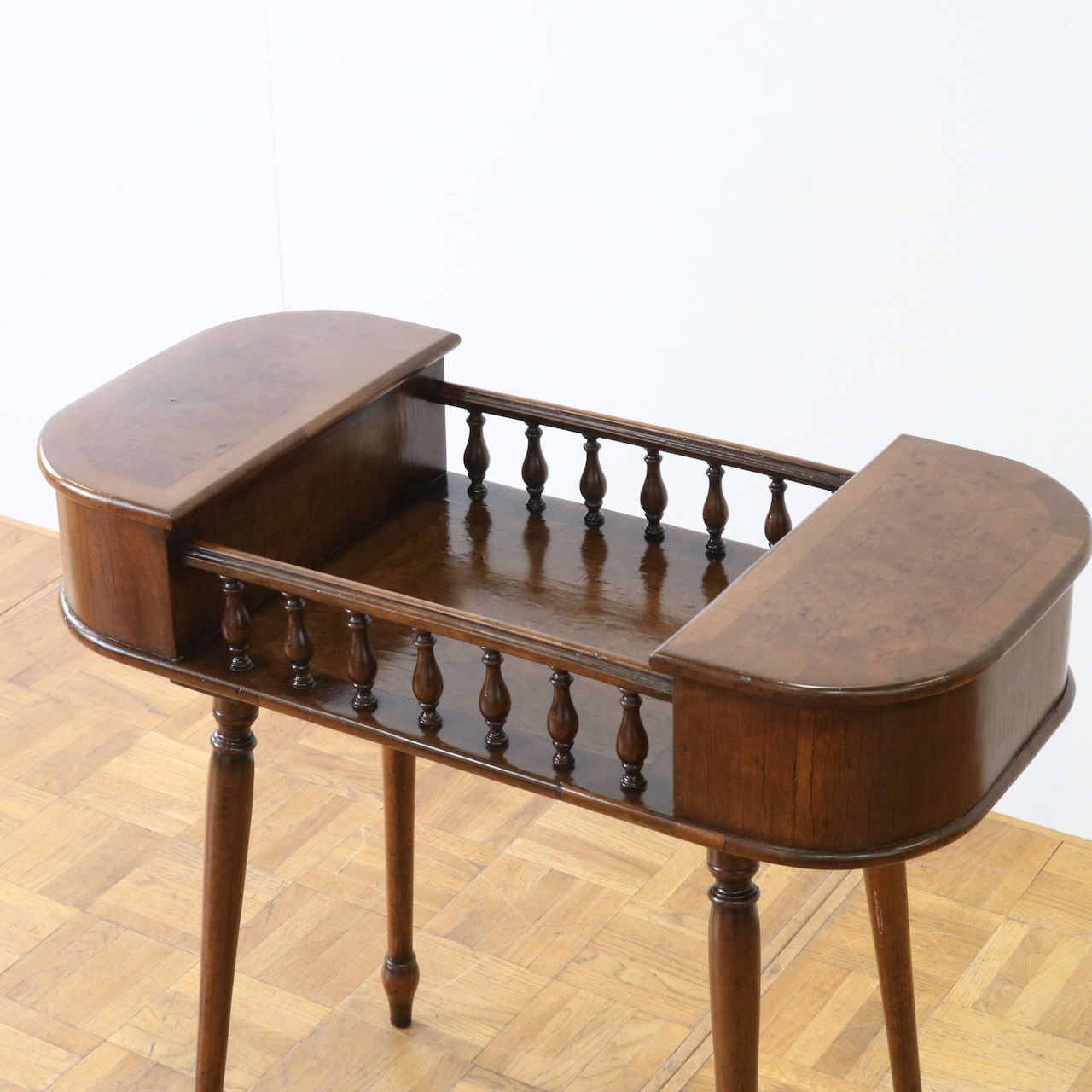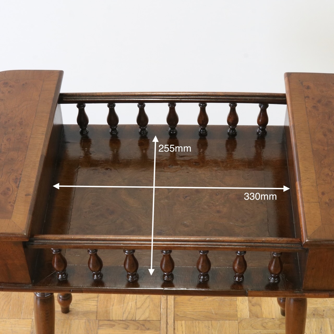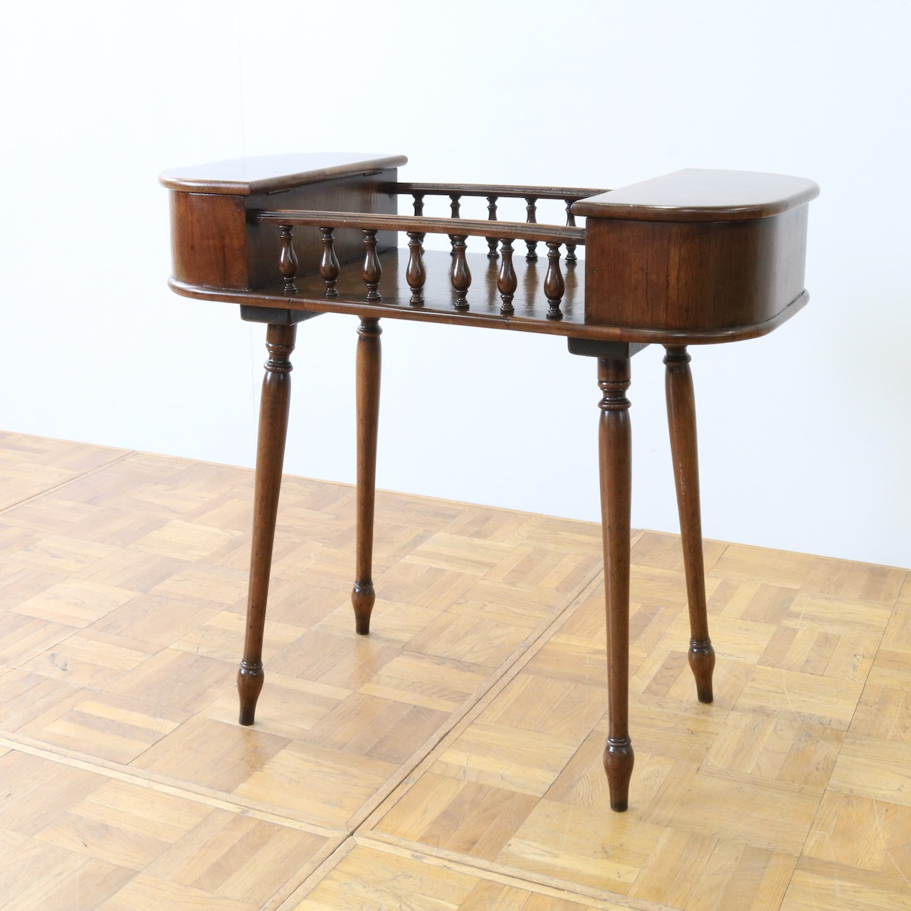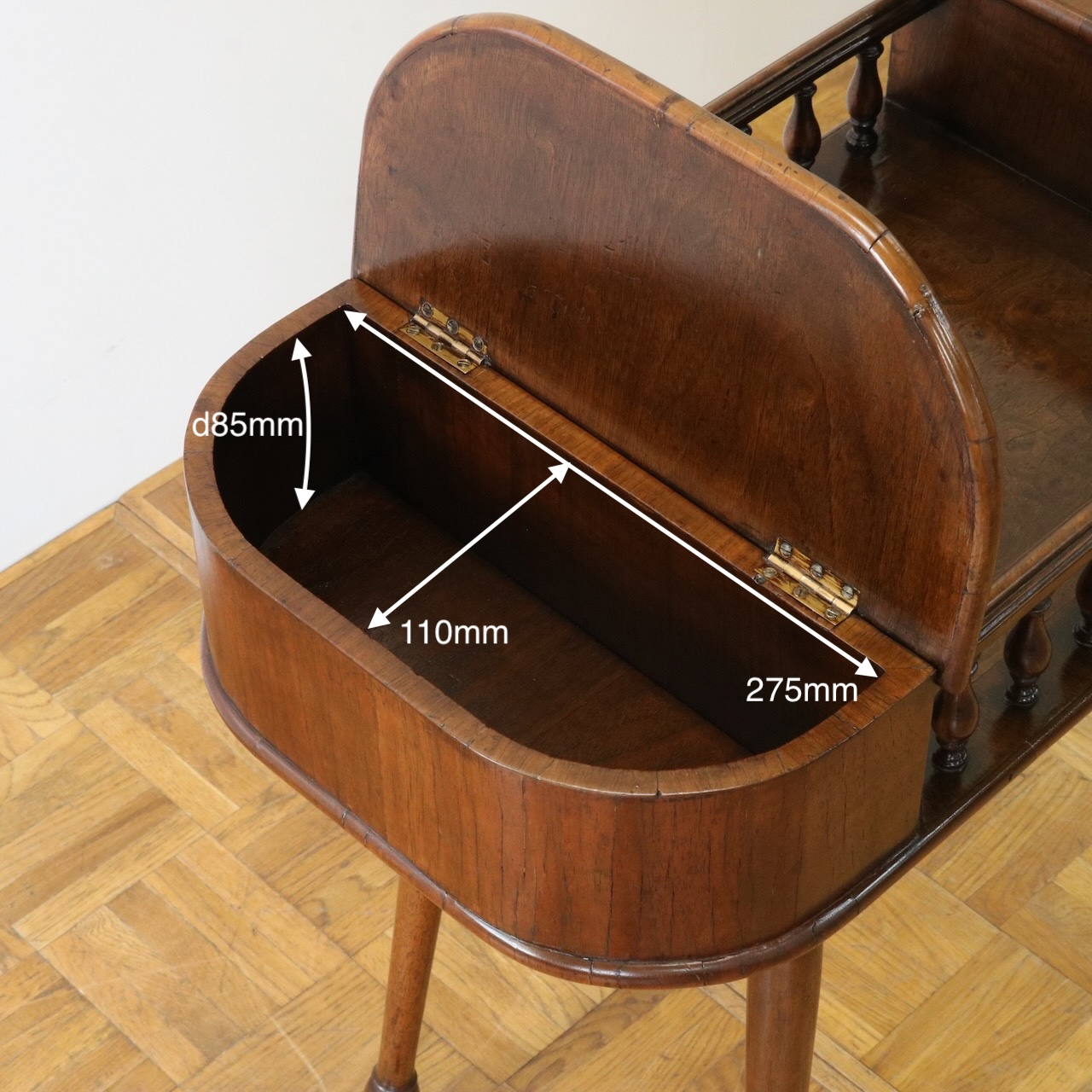 配送料の目安 ▶︎ウォールナット材のサイドテーブル。小ぶりな楕円型で、両サイドに小さな収納も付いています。中央のコラムのデザインやすっきりと伸びる脚がクラシックでスマートな印象です。