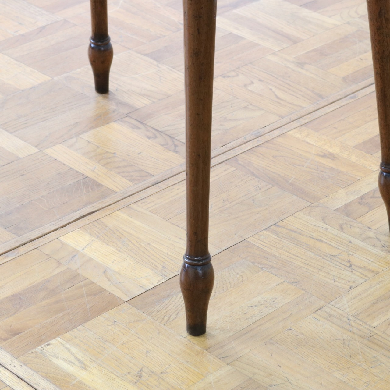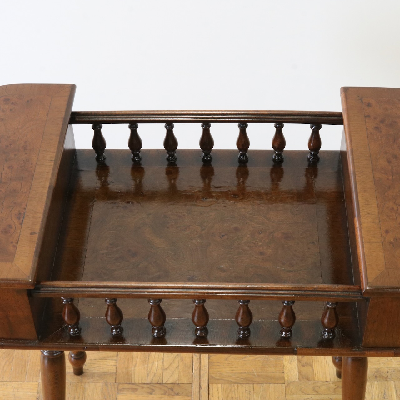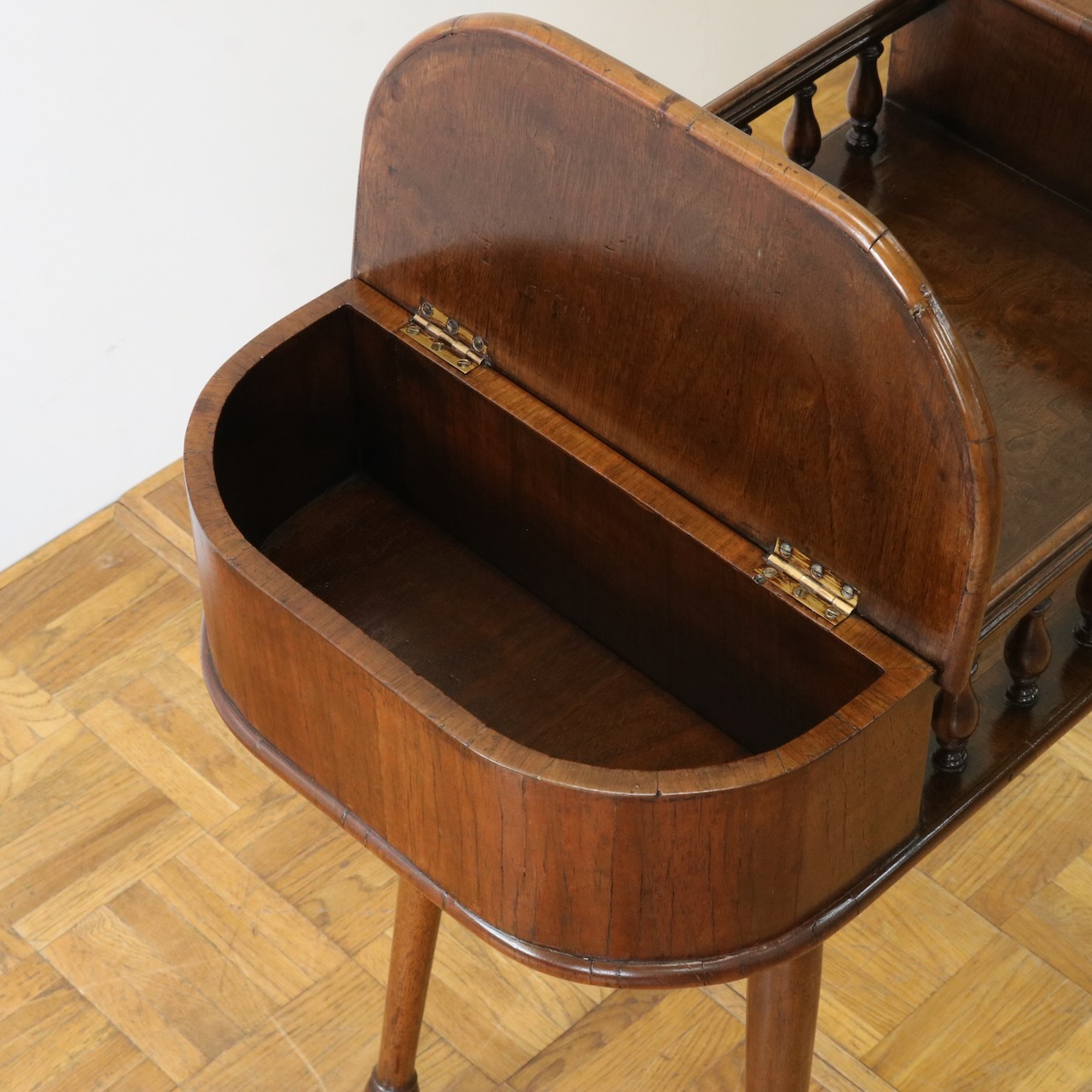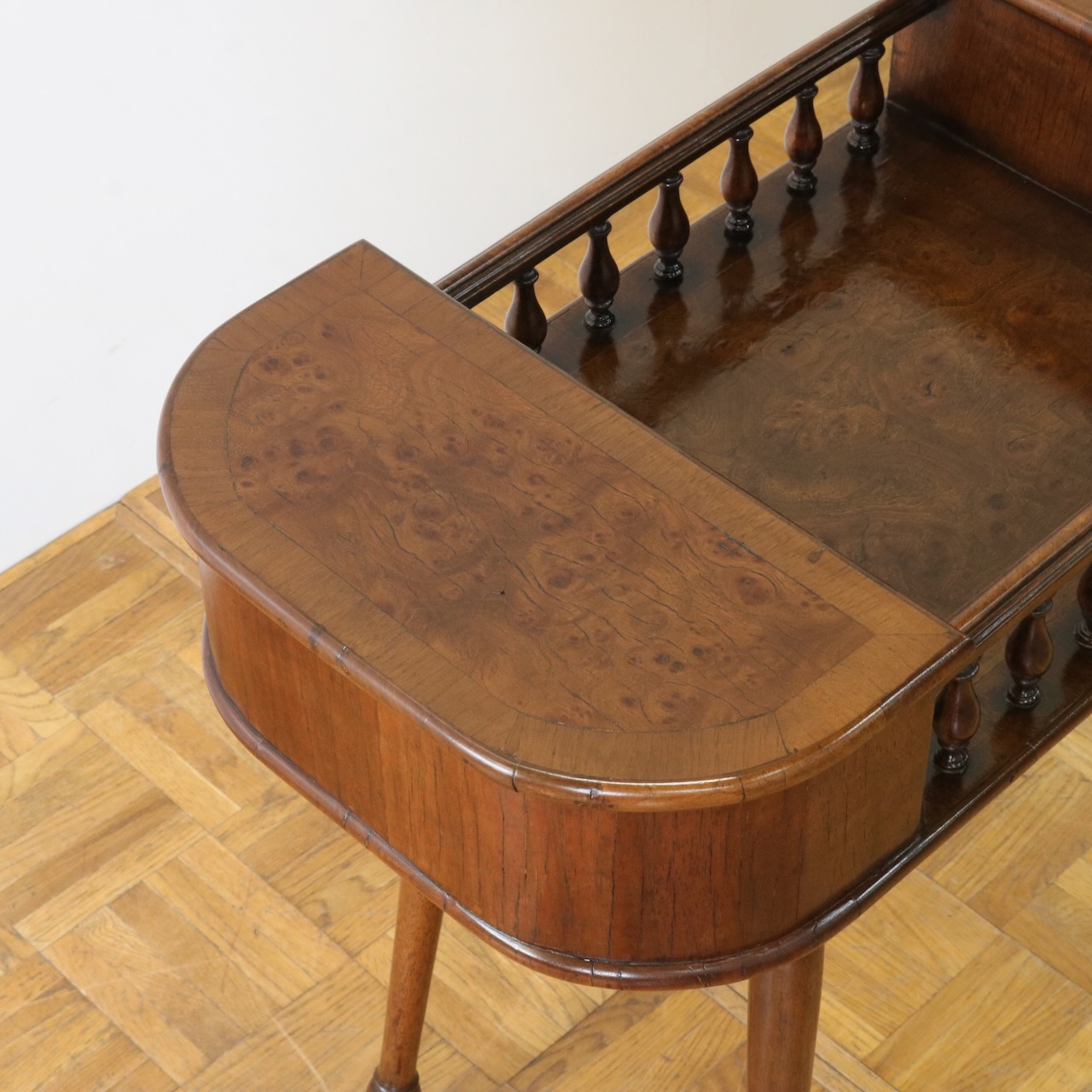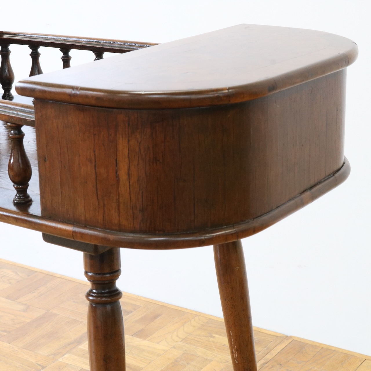 配送料の目安 ▶︎ウォールナット材のサイドテーブル。小ぶりな楕円型で、両サイドに小さな収納も付いています。中央のコラムのデザインやすっきりと伸びる脚がクラシックでスマートな印象です。