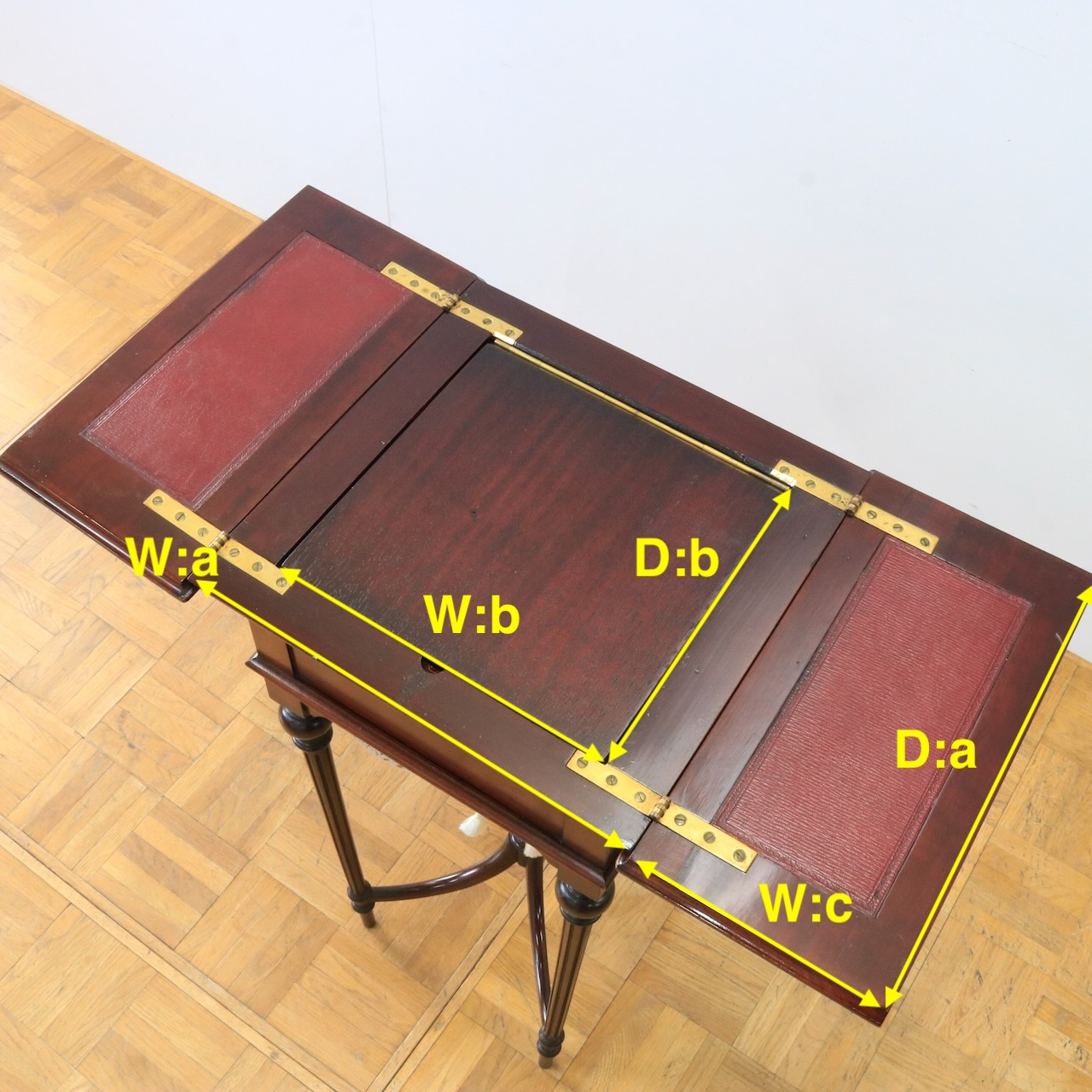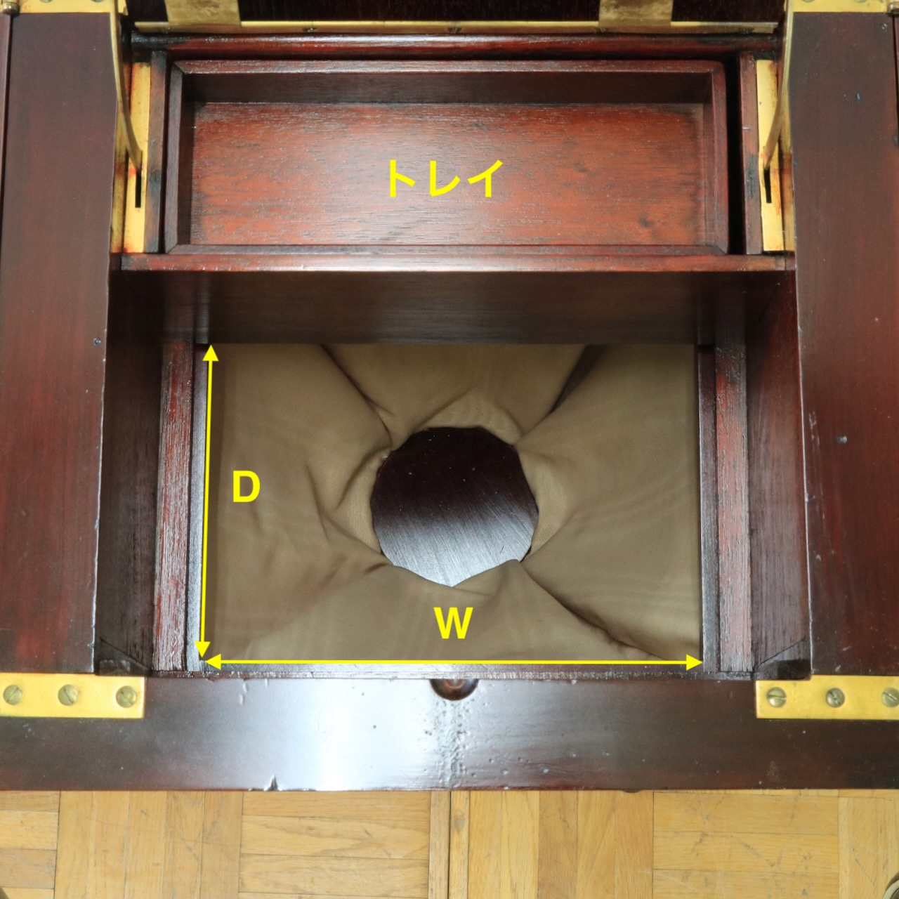 配送料の目安 ▶︎1900年代、マホガニーのソーイングボックス。繊細な装飾が美しく上品な佇まい。袋状の収納スペースがあるのが珍しい造りです。お裁縫箱としてはもちろんのこと、小物やアクセサリー収納としてもお使いください。