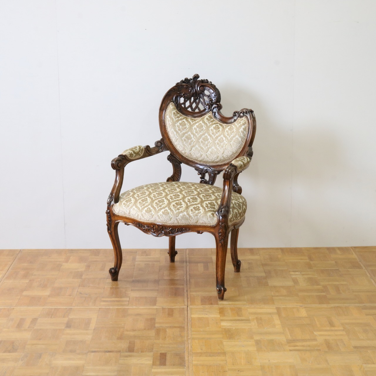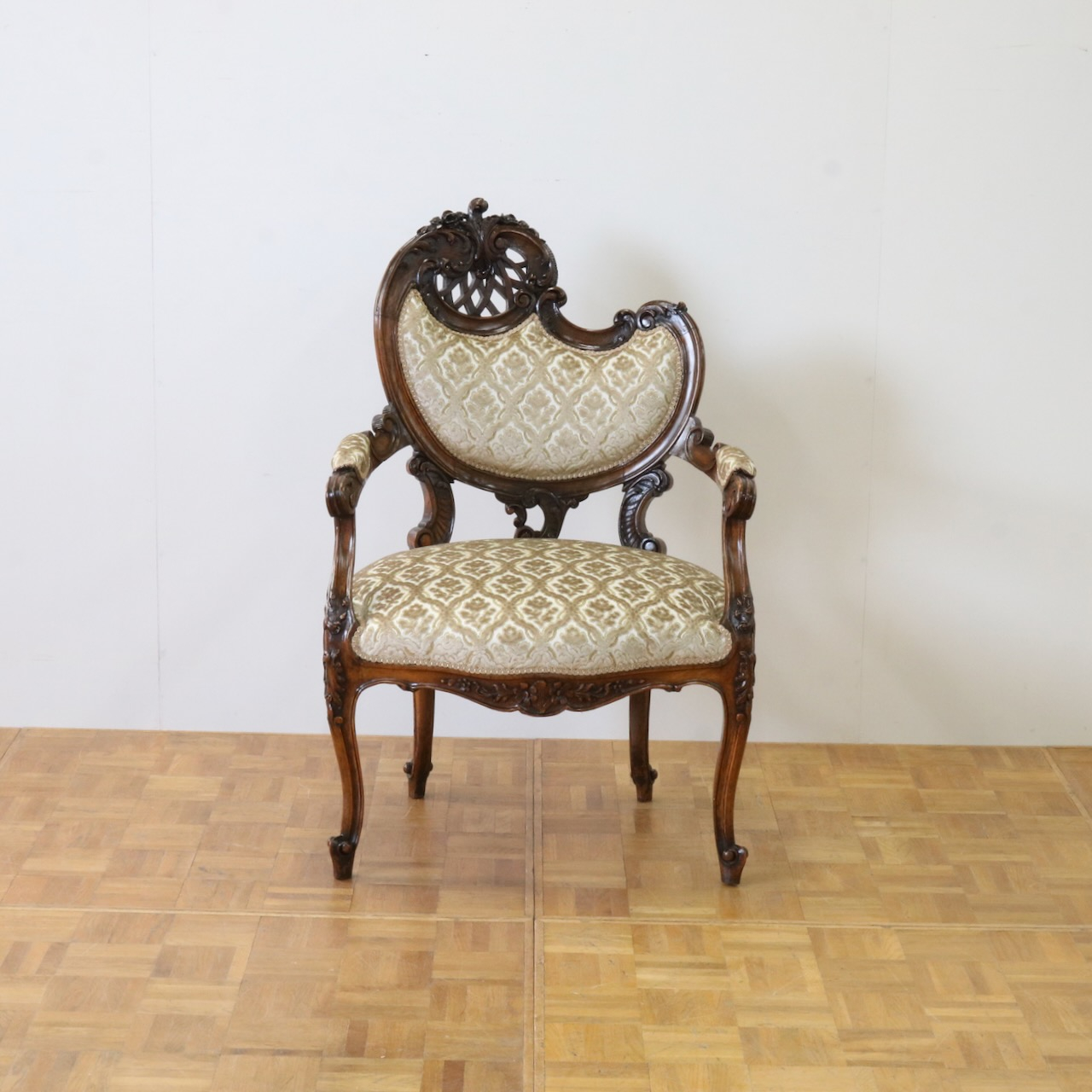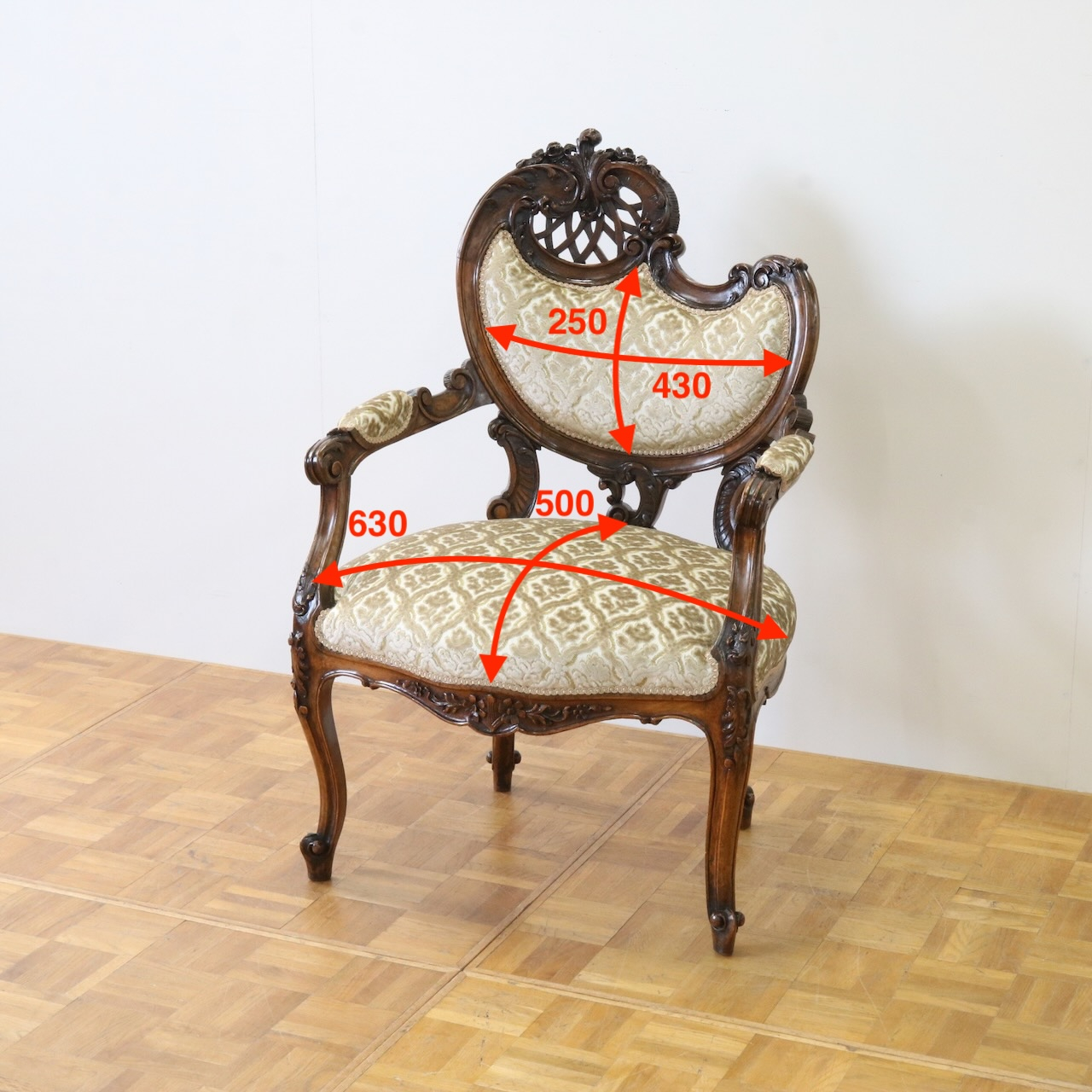 配送料の目安 ▶︎1890年代、ヴィクトリアンの1人掛けソファーです。背もたれの抜きの彫刻が当時の職人の技術力を物語る逸品と言えます。ゆったりとお過ごし頂けるサイズの1人掛けソファーです。セットで2人掛けソファーも入荷しております。(406-U-0901)