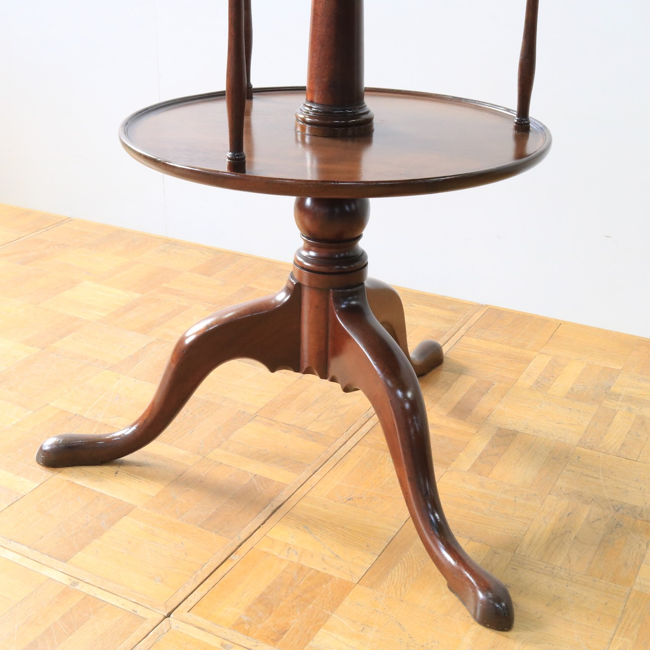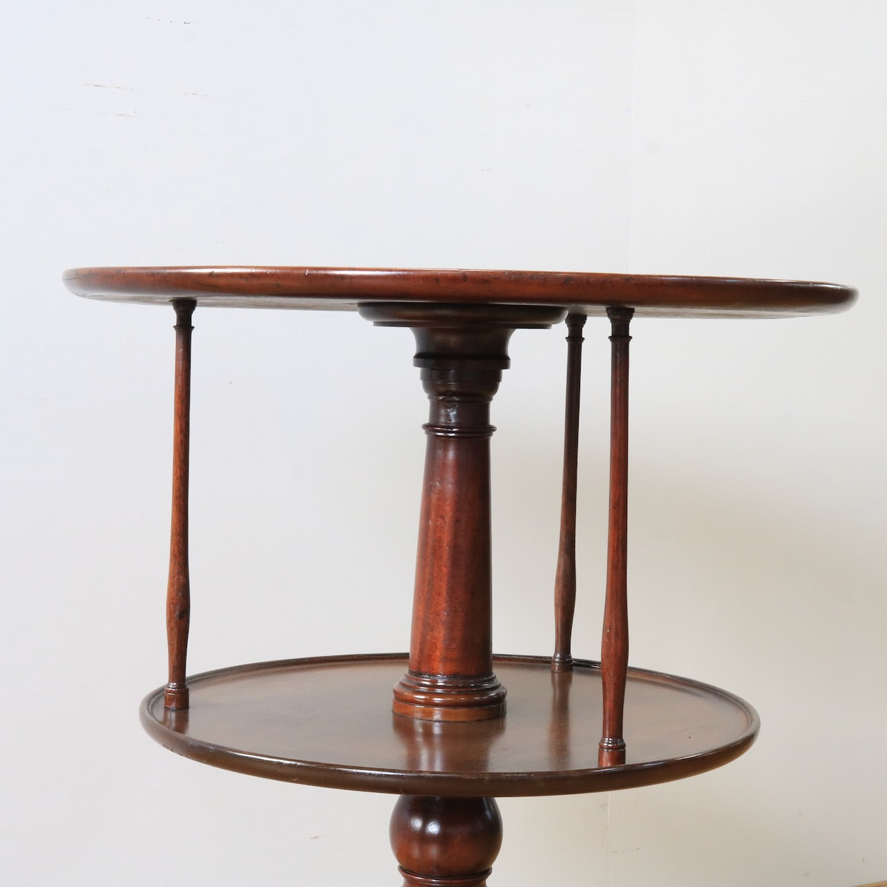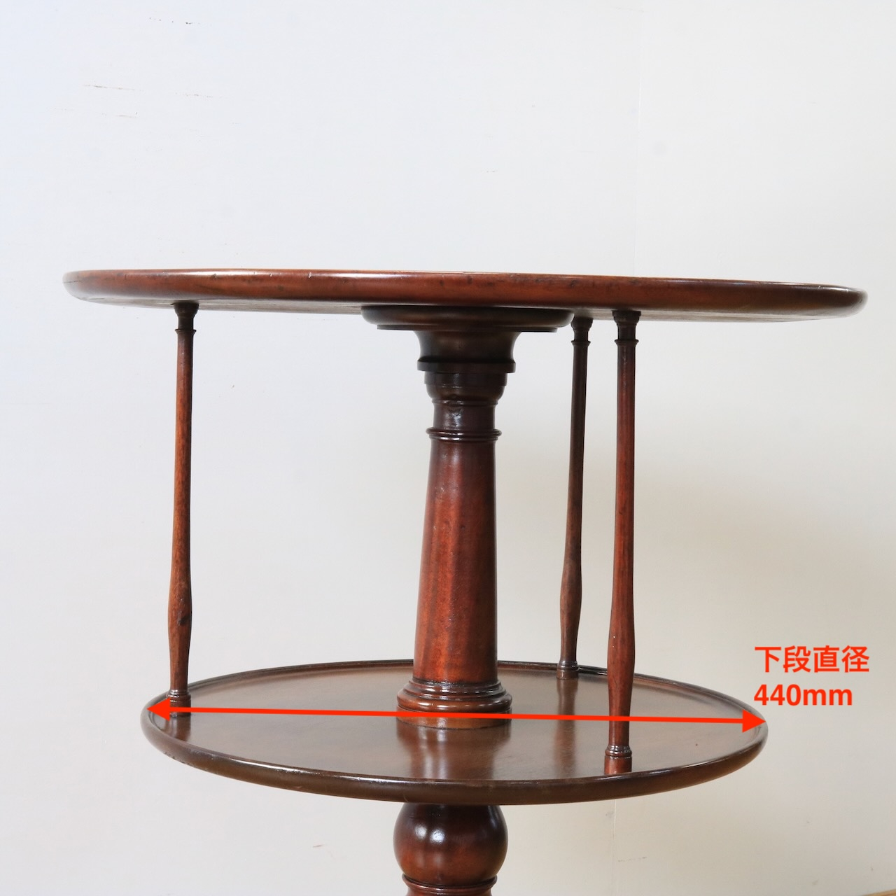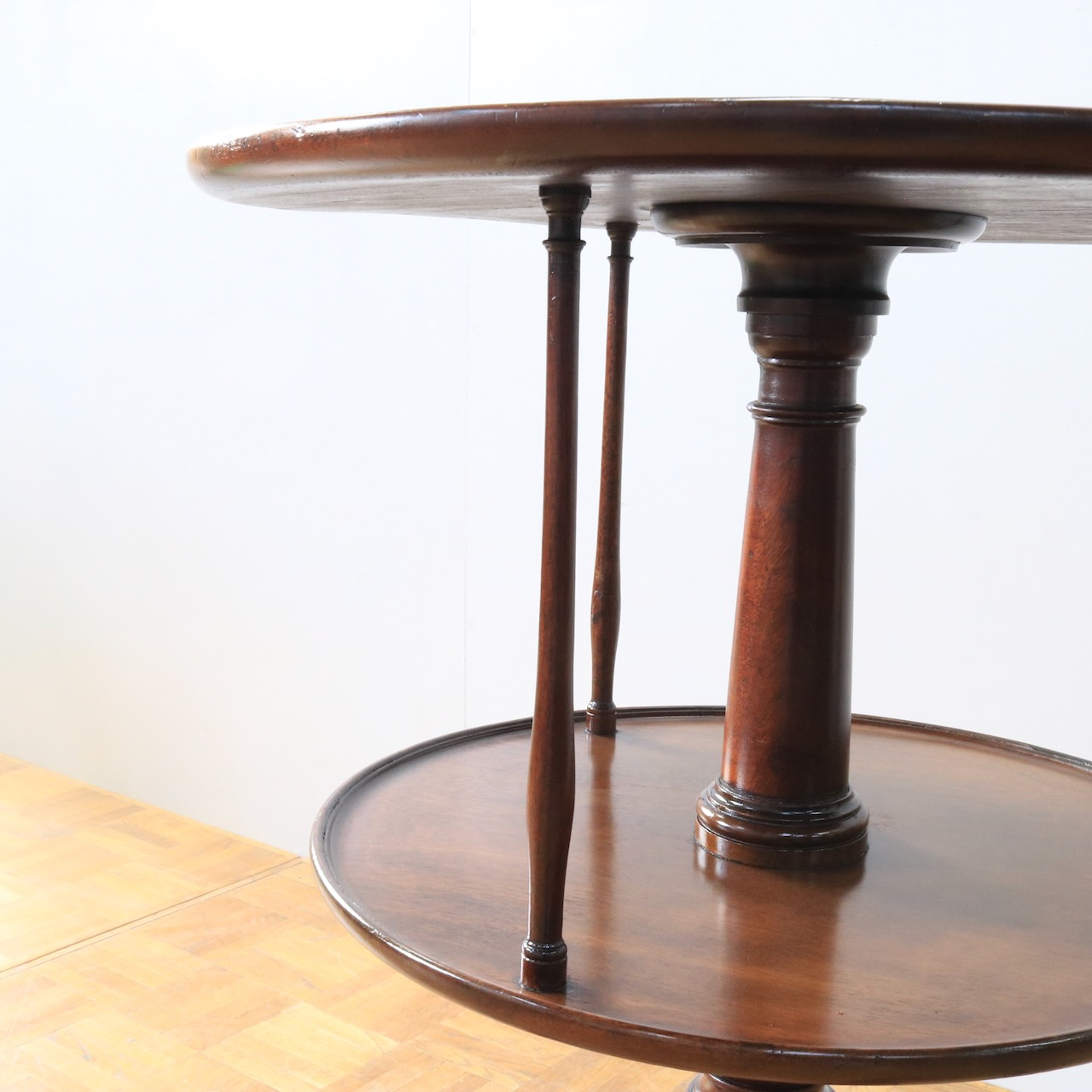 1920年代、イギリス製マホガニー材のダムウェイターテーブル。通常は2段の天板で構成されますが、こちらは2段の天板の間を細いコラムが繋ぐ珍しいデザインとなっています。
