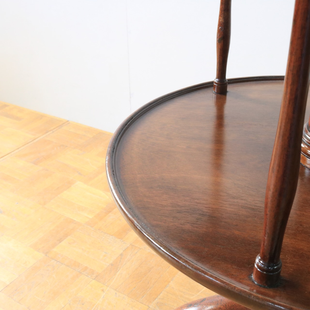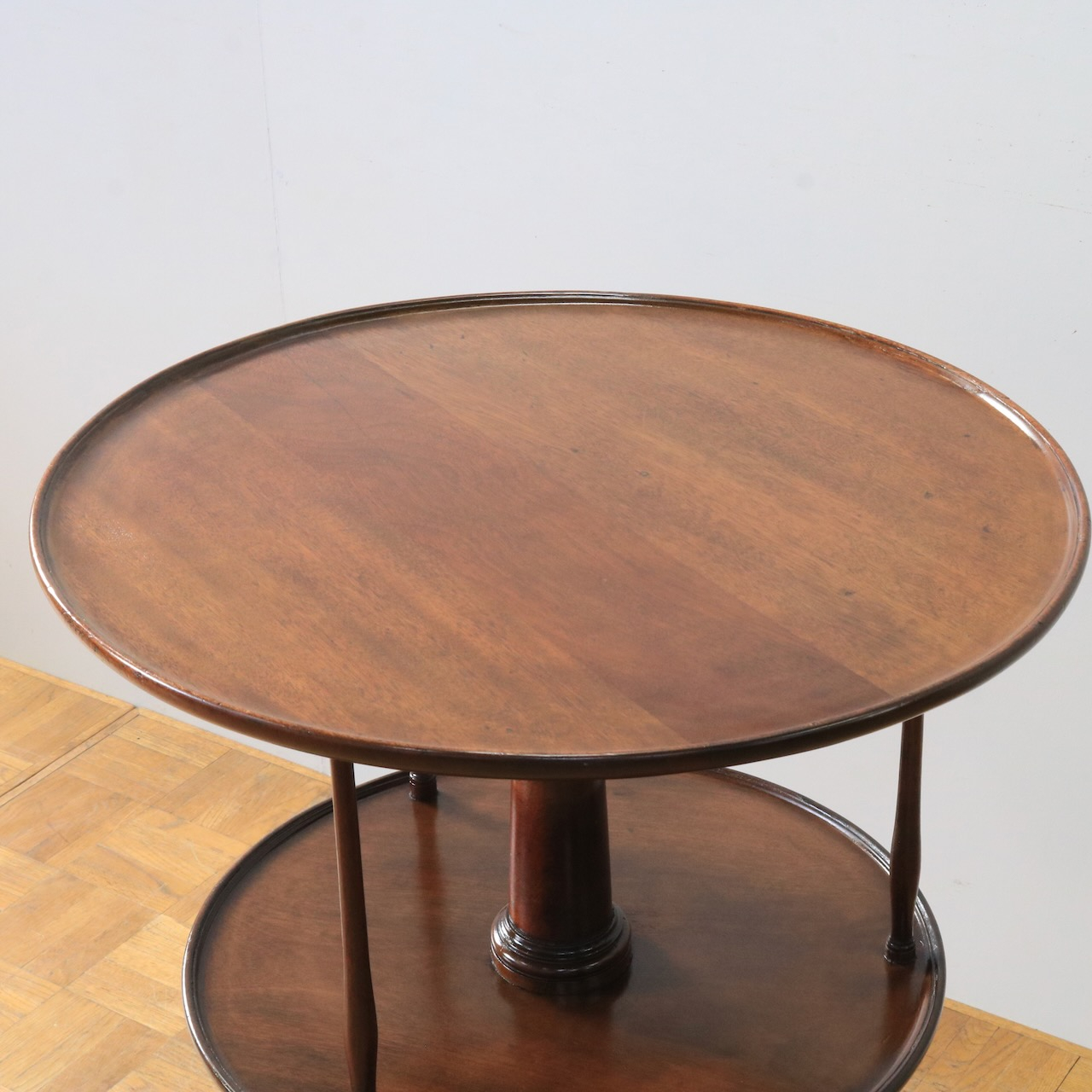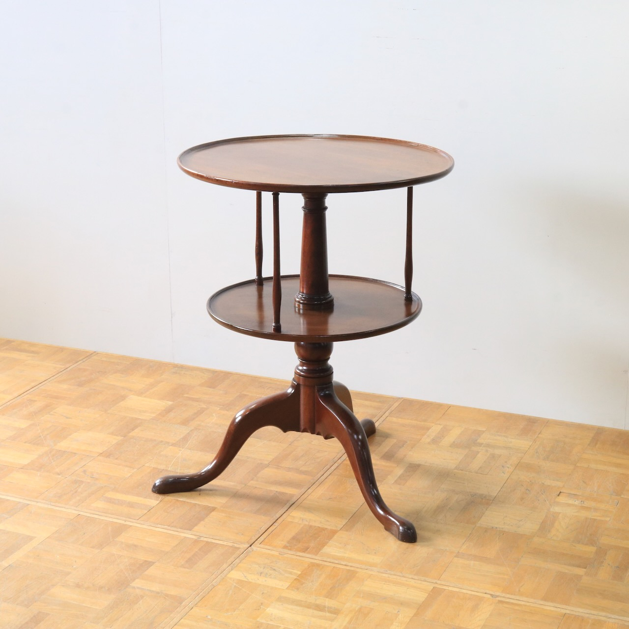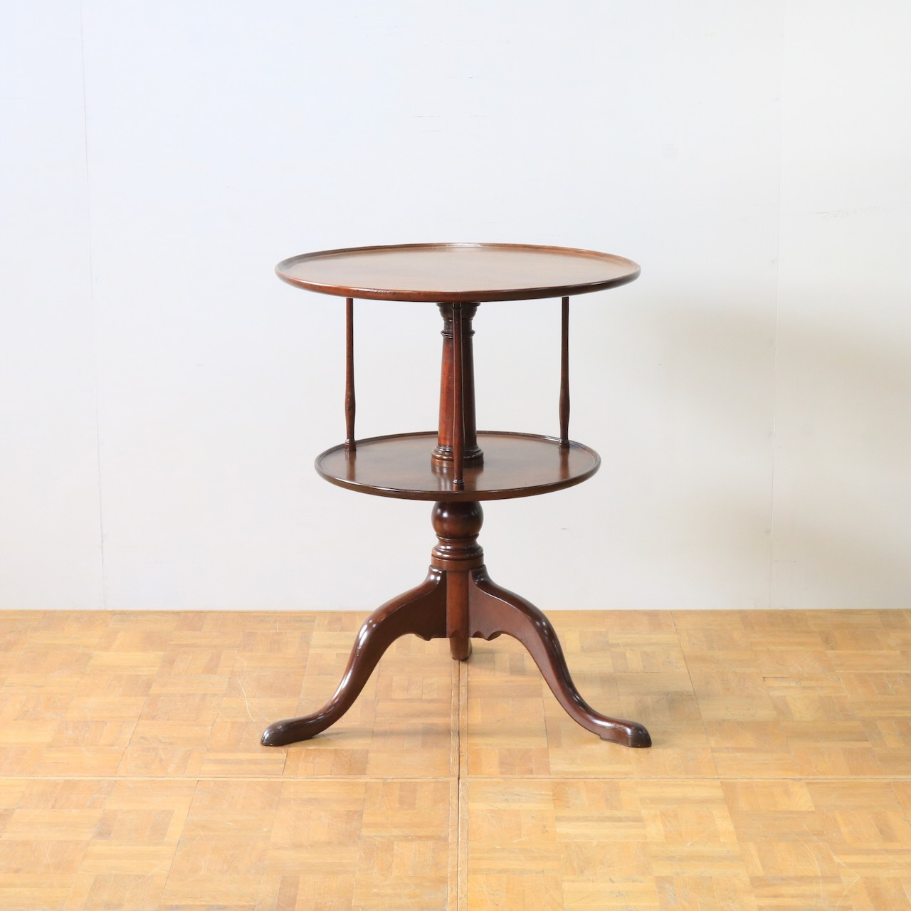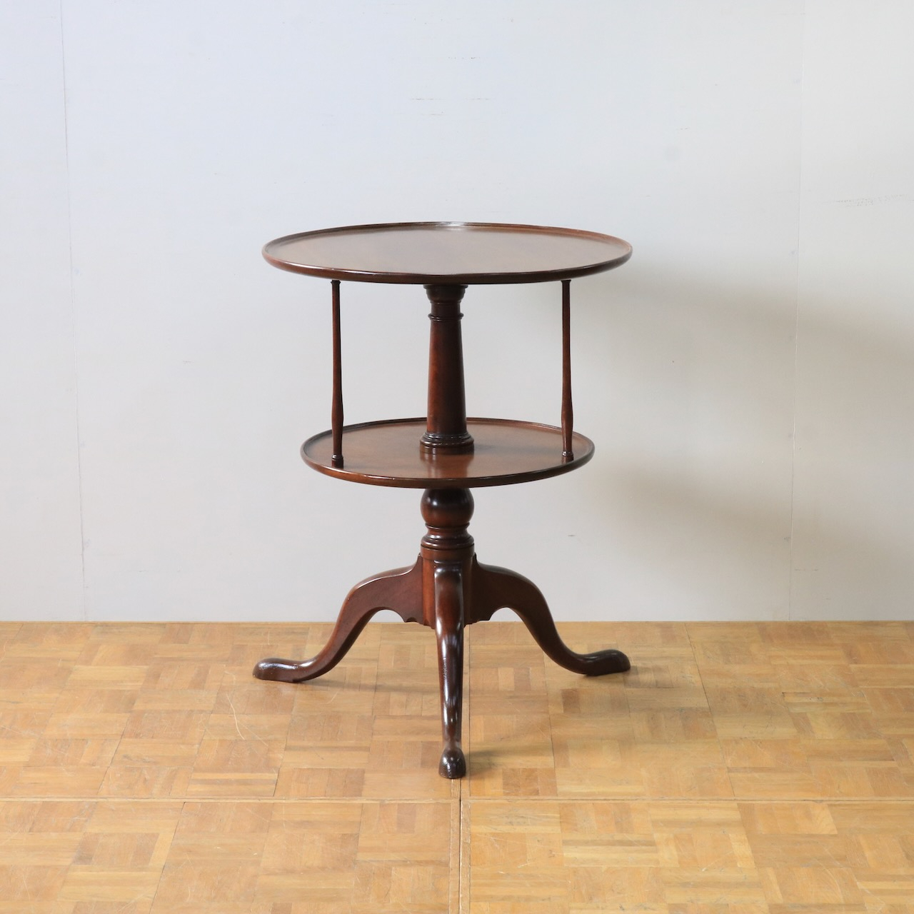1920年代、イギリス製マホガニー材のダムウェイターテーブル。通常は2段の天板で構成されますが、こちらは2段の天板の間を細いコラムが繋ぐ珍しいデザインとなっています。