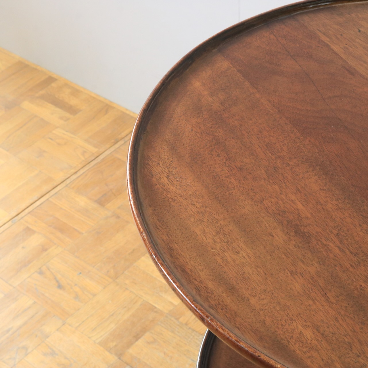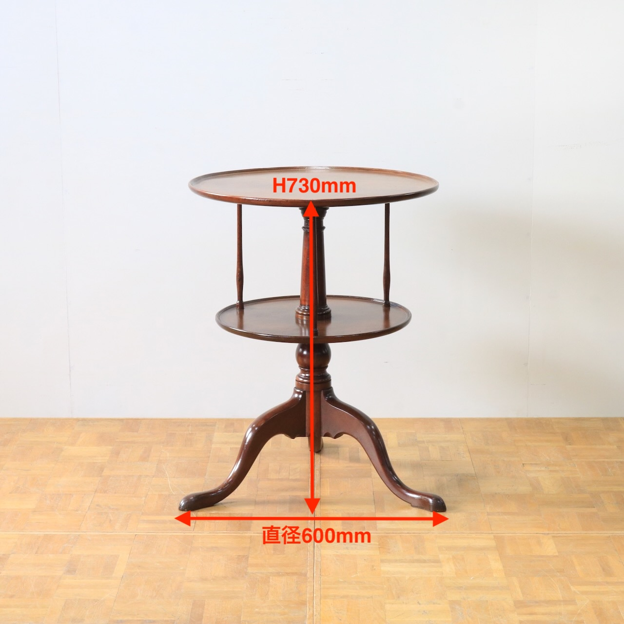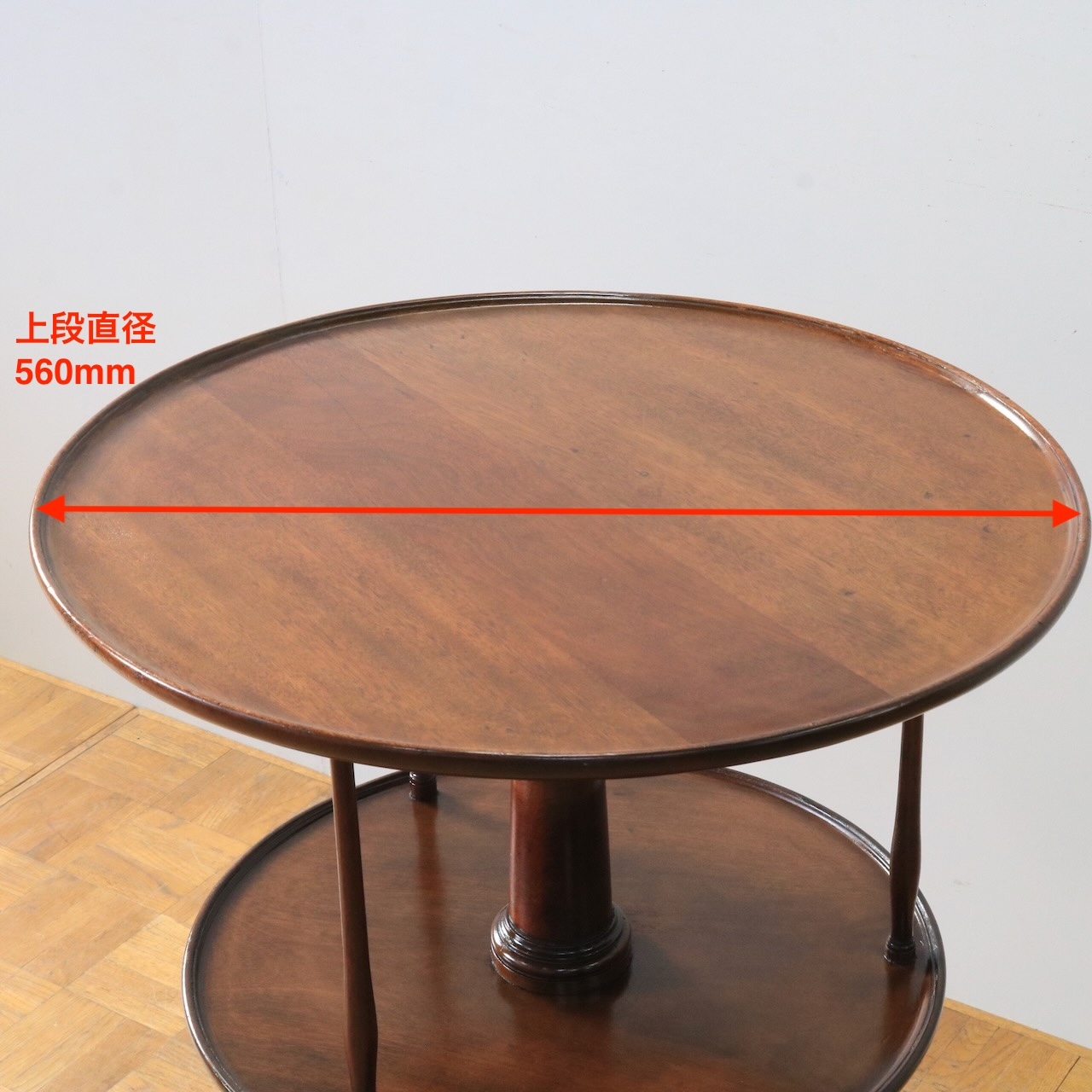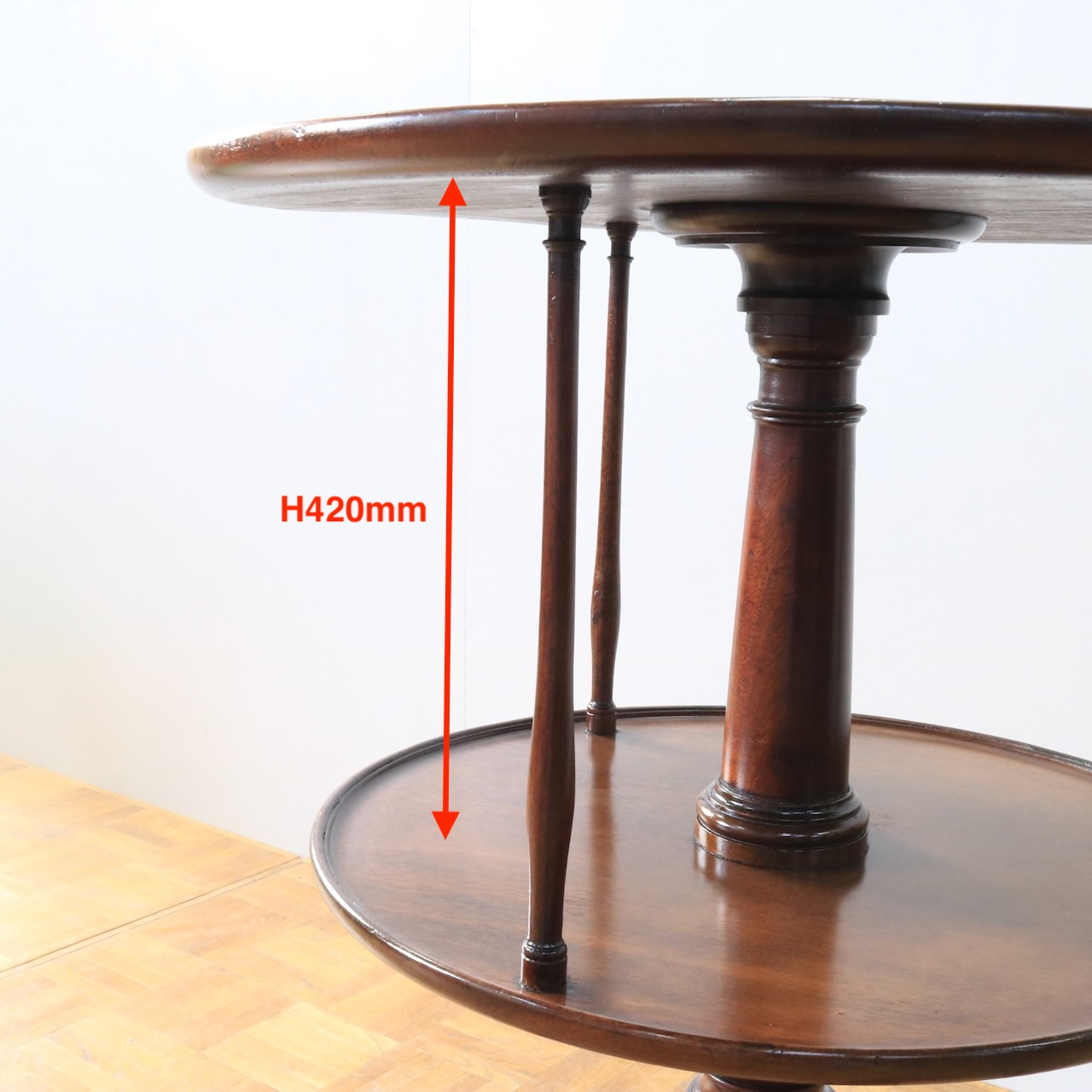 1920年代、イギリス製マホガニー材のダムウェイターテーブル。通常は2段の天板で構成されますが、こちらは2段の天板の間を細いコラムが繋ぐ珍しいデザインとなっています。