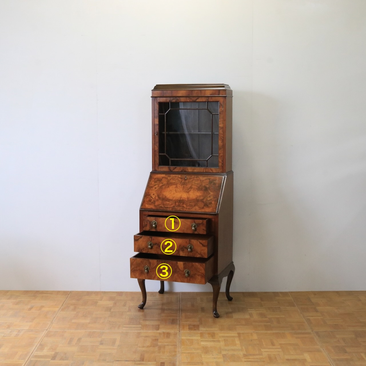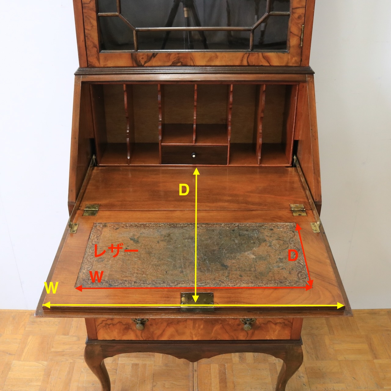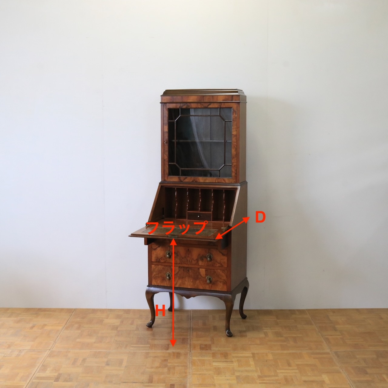 配送料の目安 ▶︎1930年代、イギリス製・ウォールナット材のビューローブックケース。ウォールナットの木目がフラップに特徴的に入っています。幅64cm、高さ約170cmとコンパクトな為、リビングや書斎、寝室でも大きさをあまり気にせずにお使い頂けます。