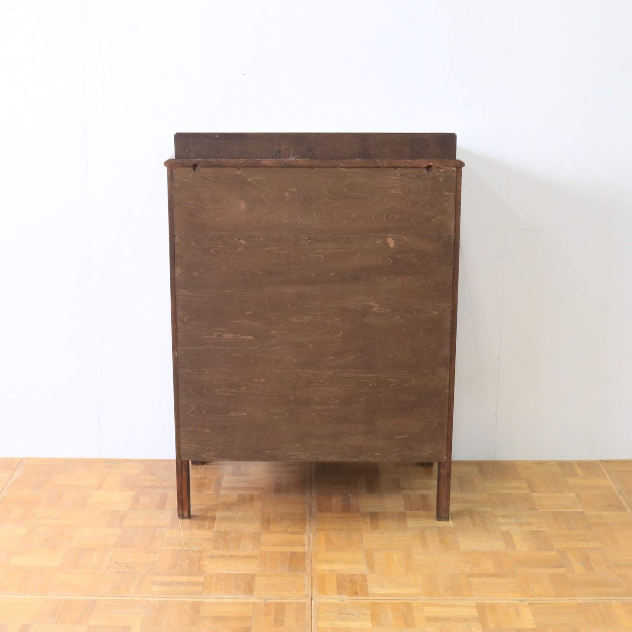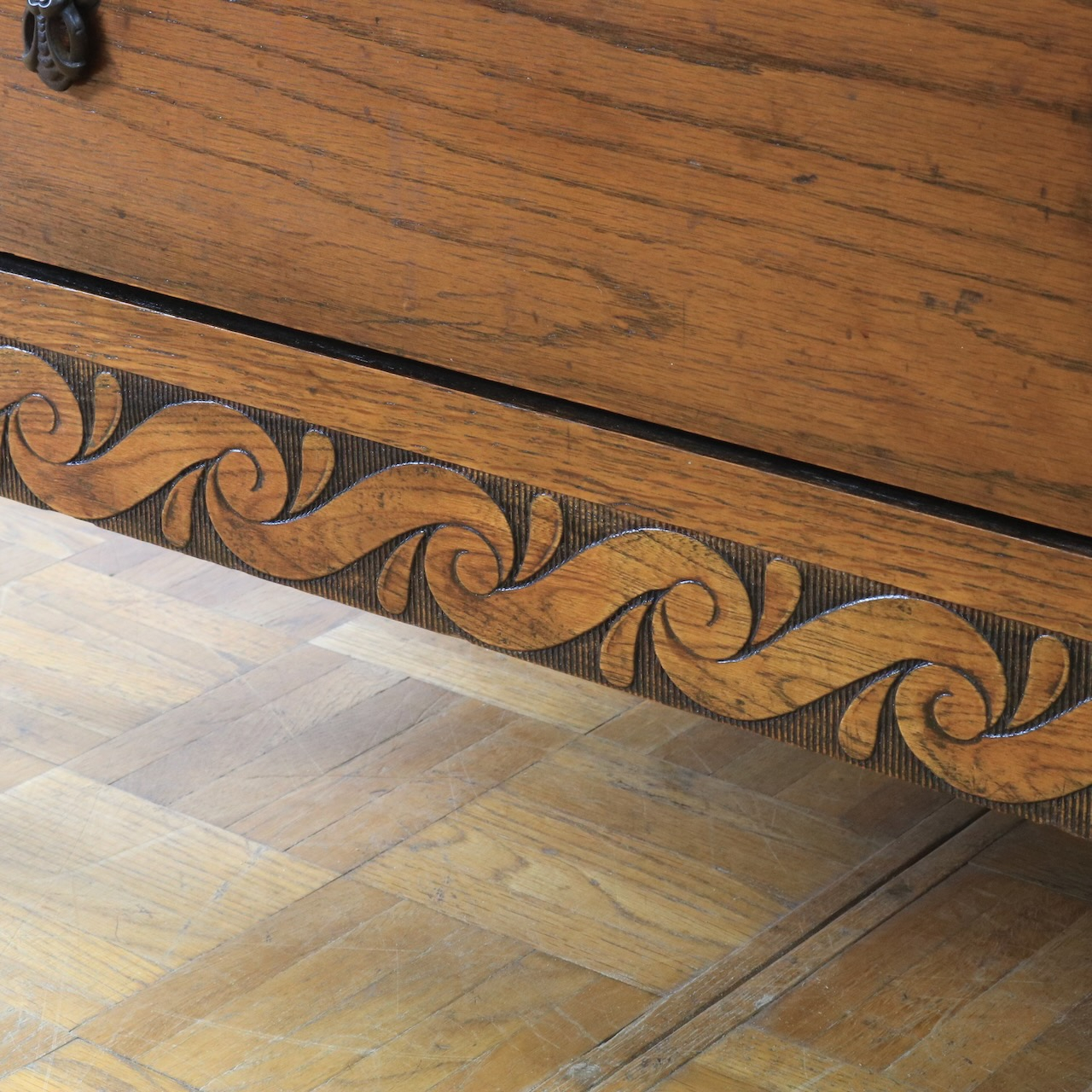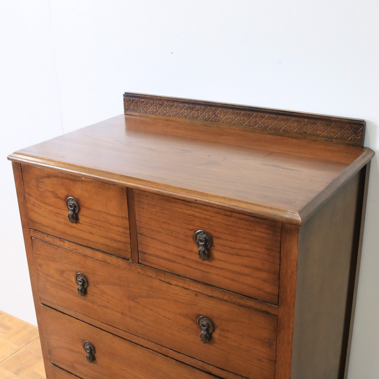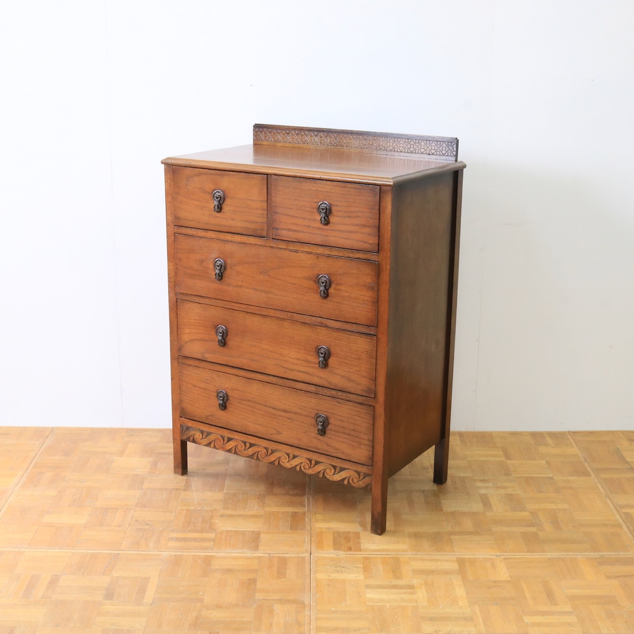 クラシカルな金具や笠木、脚元の装飾が素敵なアクセントになっているチェスト。色味も明るめで、現代家具とも馴染みやすいデザインです。