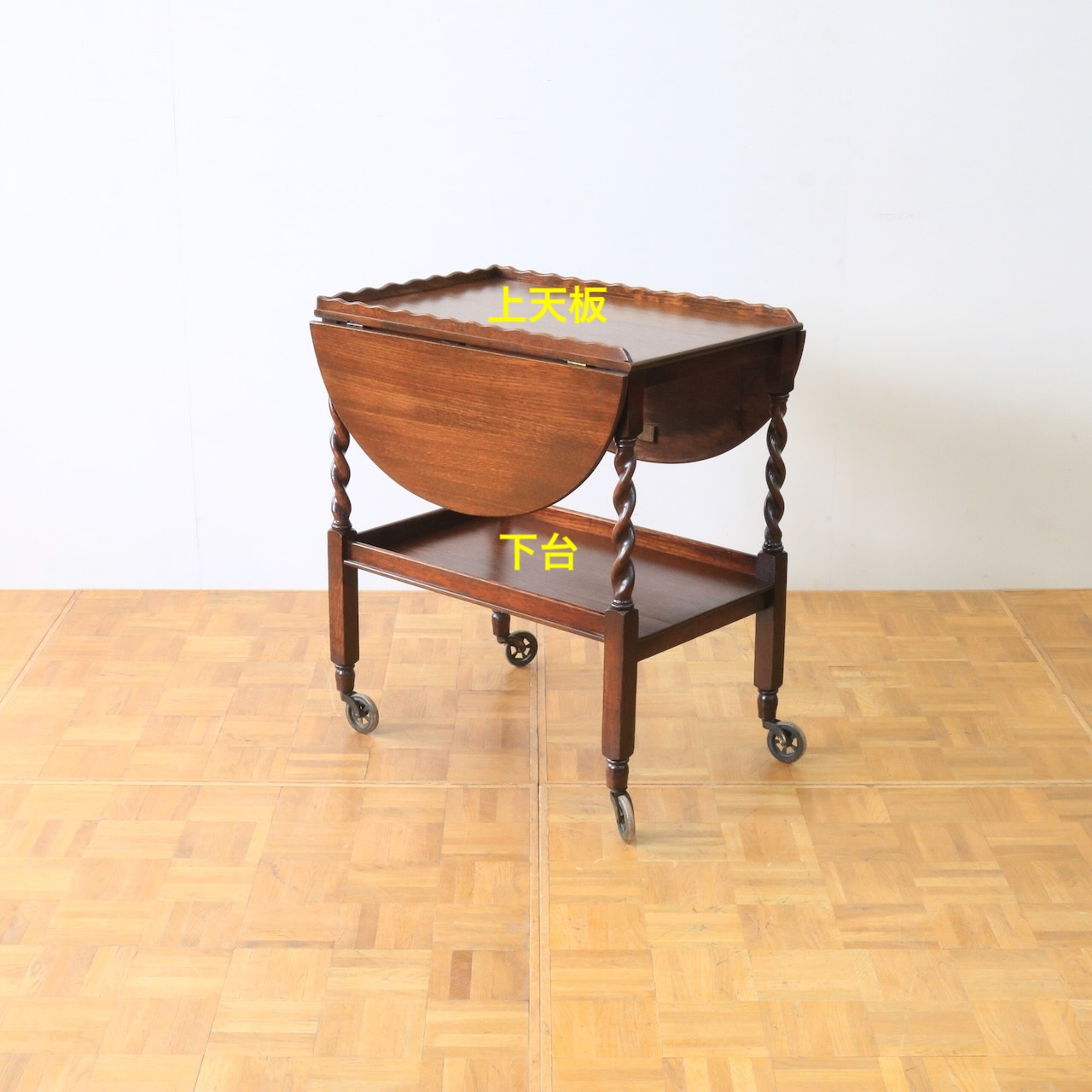 1940年代、オーク材のトローリー。波型の天板縁とツイストの支柱がアクセントになった素朴ながらも温かみのあるデザイン。天板を広げてサブテーブルのようにもお使いいただける、便利な仕様です。