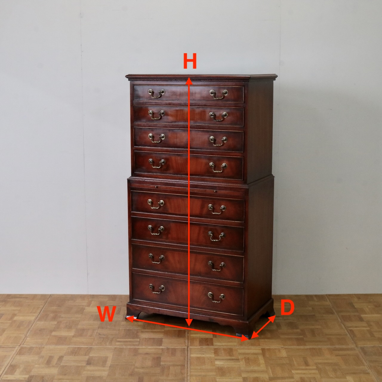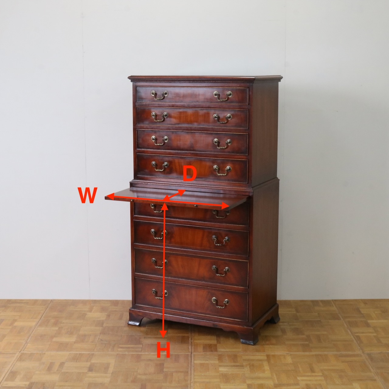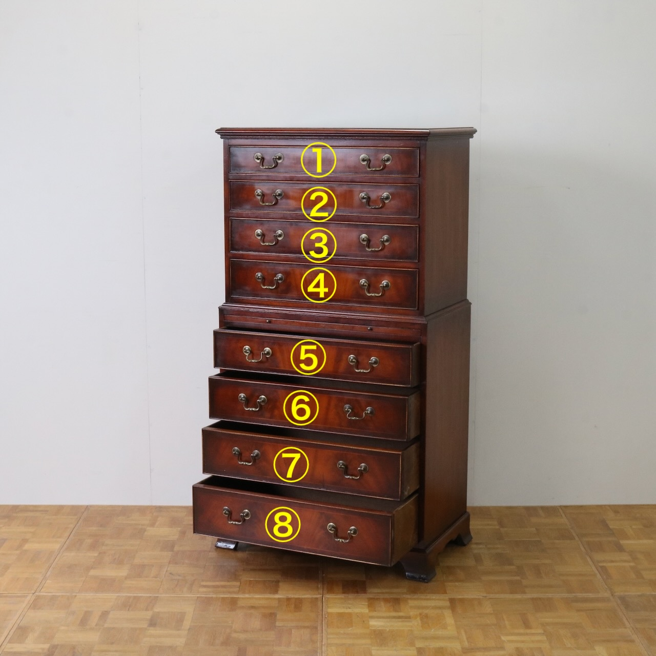 配送料の目安 ▶︎マホガニーのチェスト。8段の頼もしい収納力、真ん中にはスライド式の天板が引き出せる実用的なアイテム。細く縁取られたインレイなどさりげなく施された意匠が上品です。