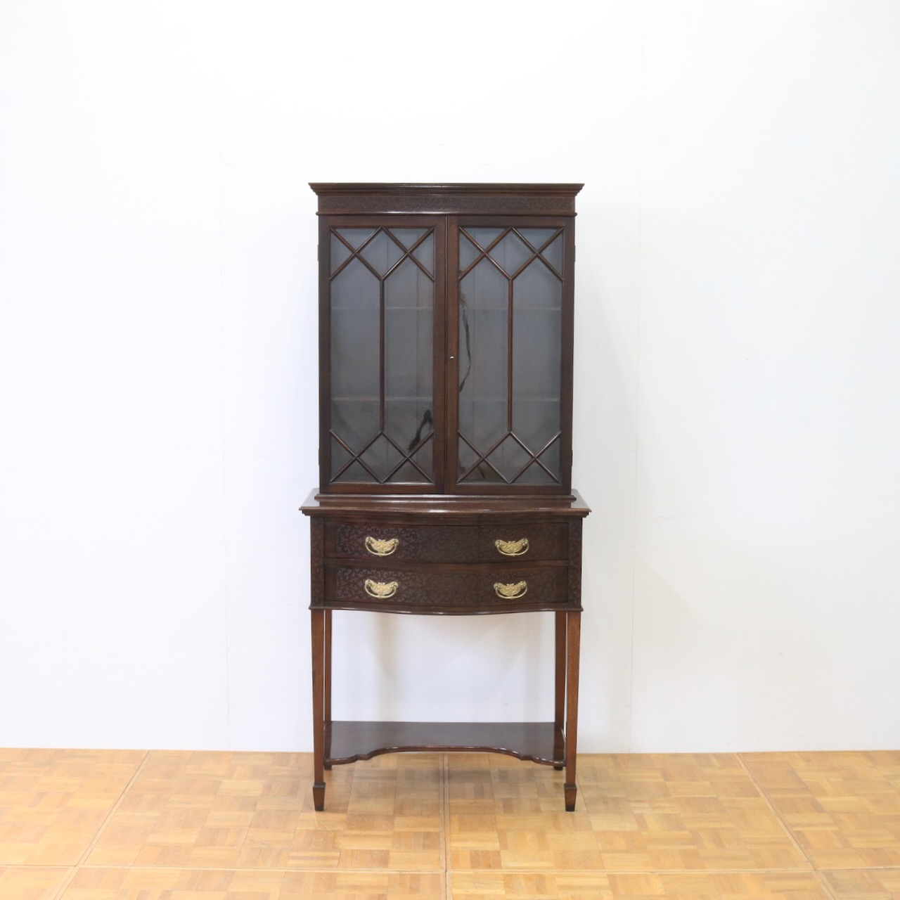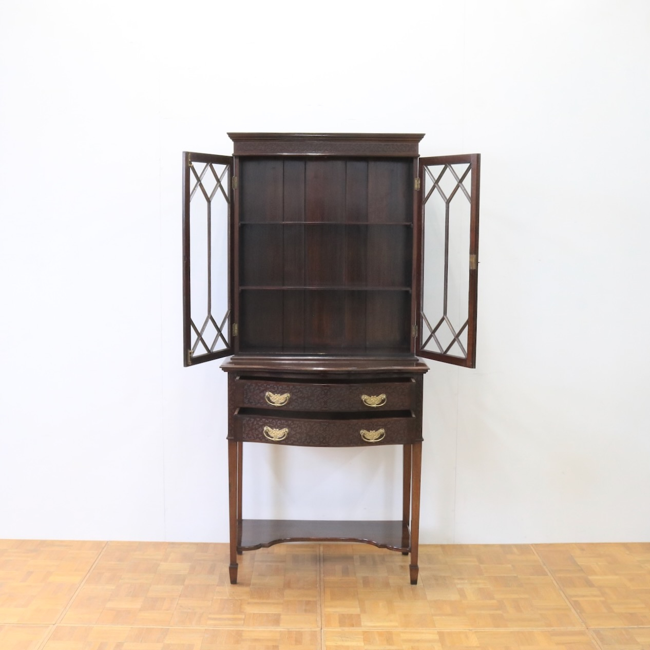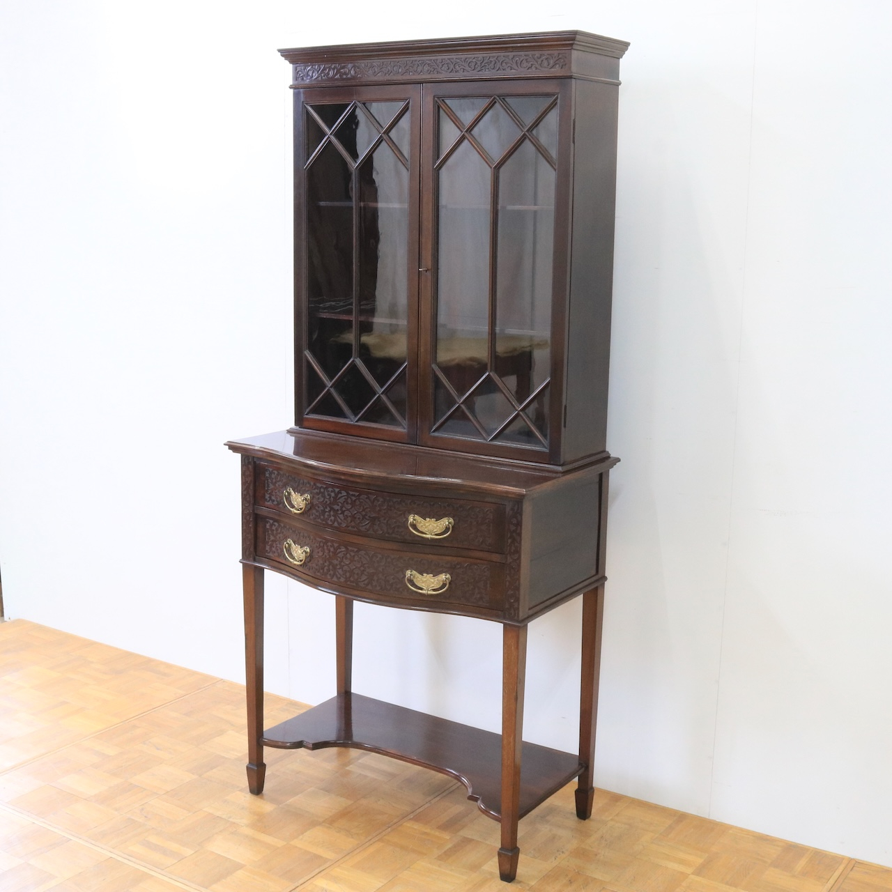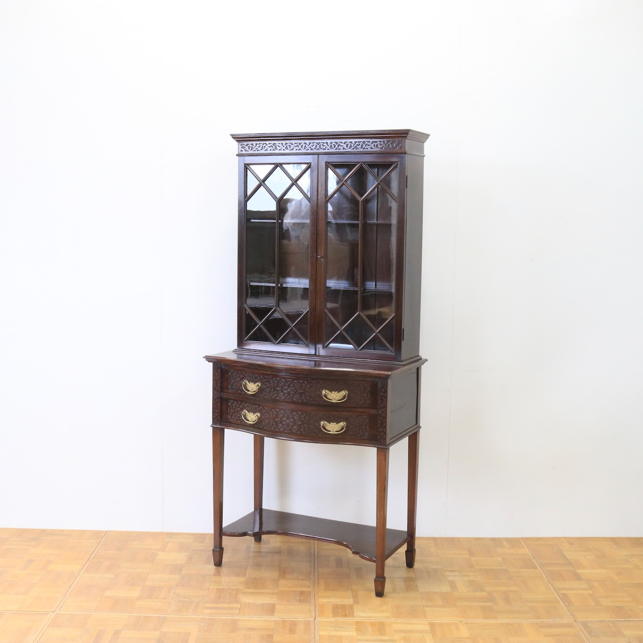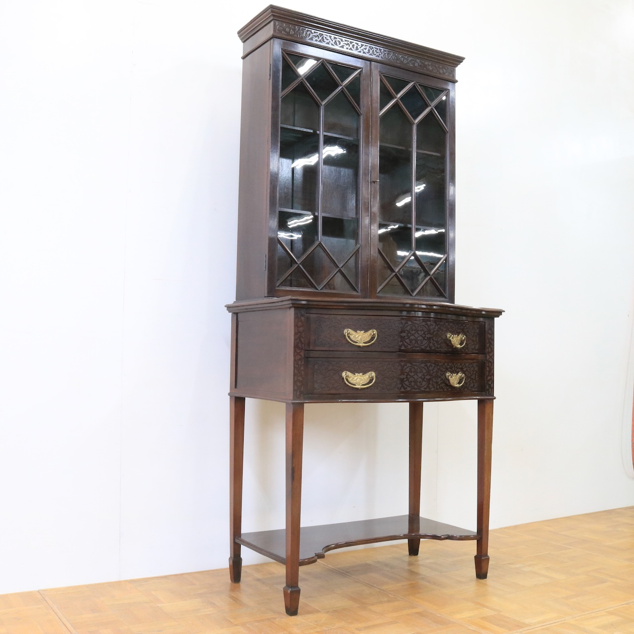 上部や引き出し周りに施されたフレットワークによる装飾が圧巻のクオリティです。美しさは勿論、下段にも収納があり実用面にも優れたアンティークキャビネットです。